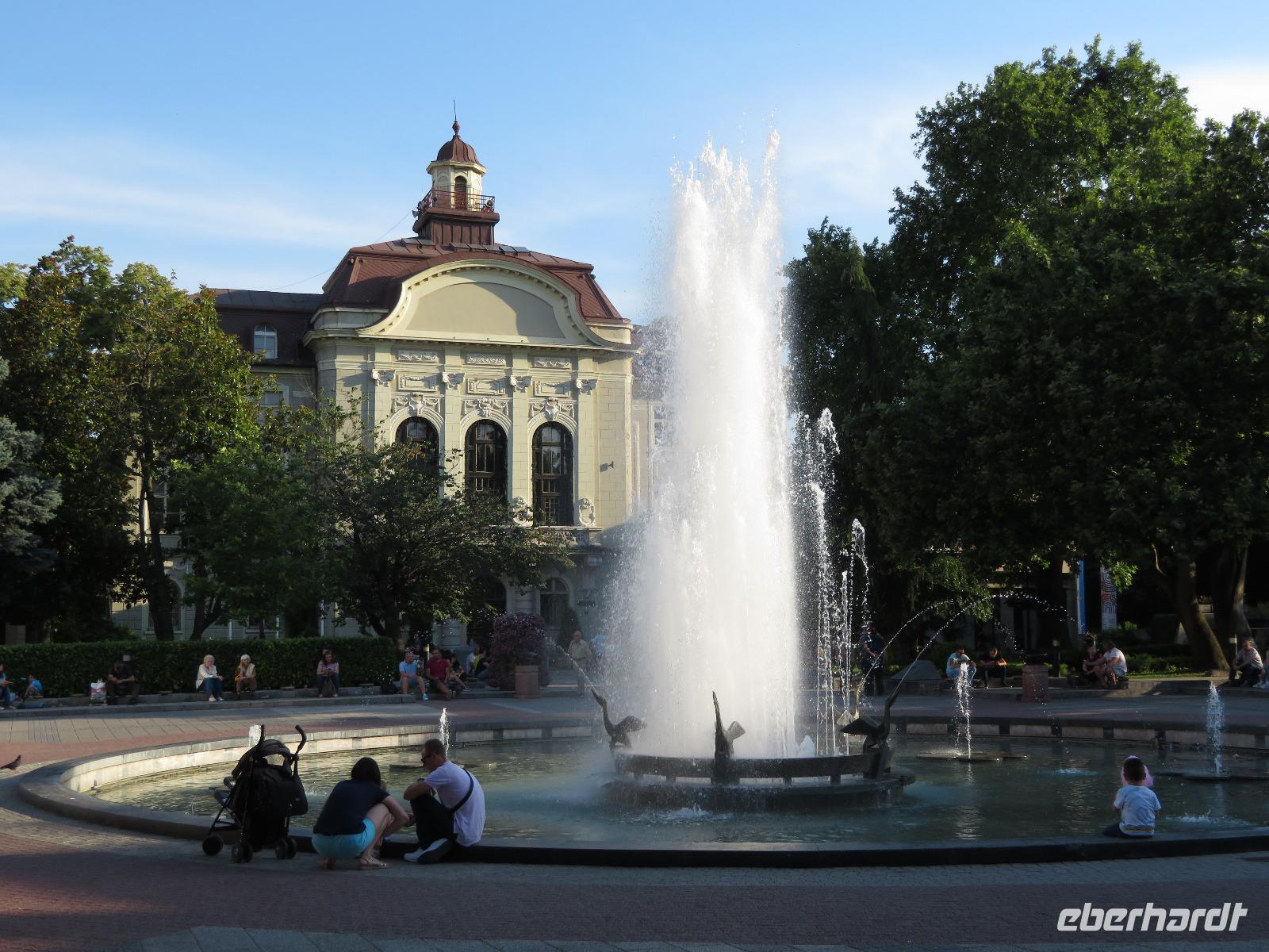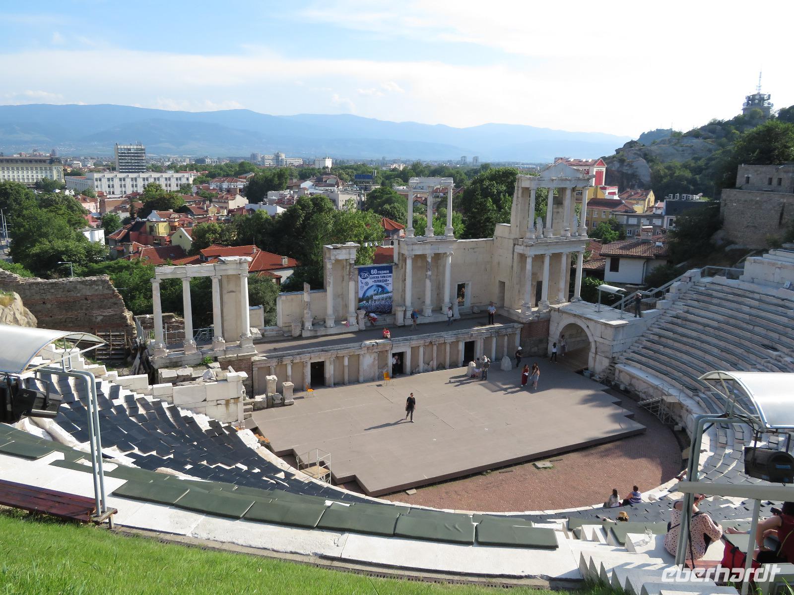 Entlang saftig grüner Wiesen und mit dem leichten Spüren der Schienenstöße fuhren wir bis zum höchsten Bahnhof des Balkangebietes. Von hier aus ging es mit unserem Bus bis zum Kleptuza-Park nach Welingrad. An dem schönen See machten wir unsere Mittagspause. Bei über 30°C fuhren wir weiter nach Plovdiv und unternahmen einen Stadtrundgang durch die Altstadt. Wir besuchten dabei das ethnographische Museum, stiegen auf einen der ehemals 7 Hügel, besichtigten das römische Amphitheater von Philippopolis und schlenderten auf der Fußgängerzone entlang.