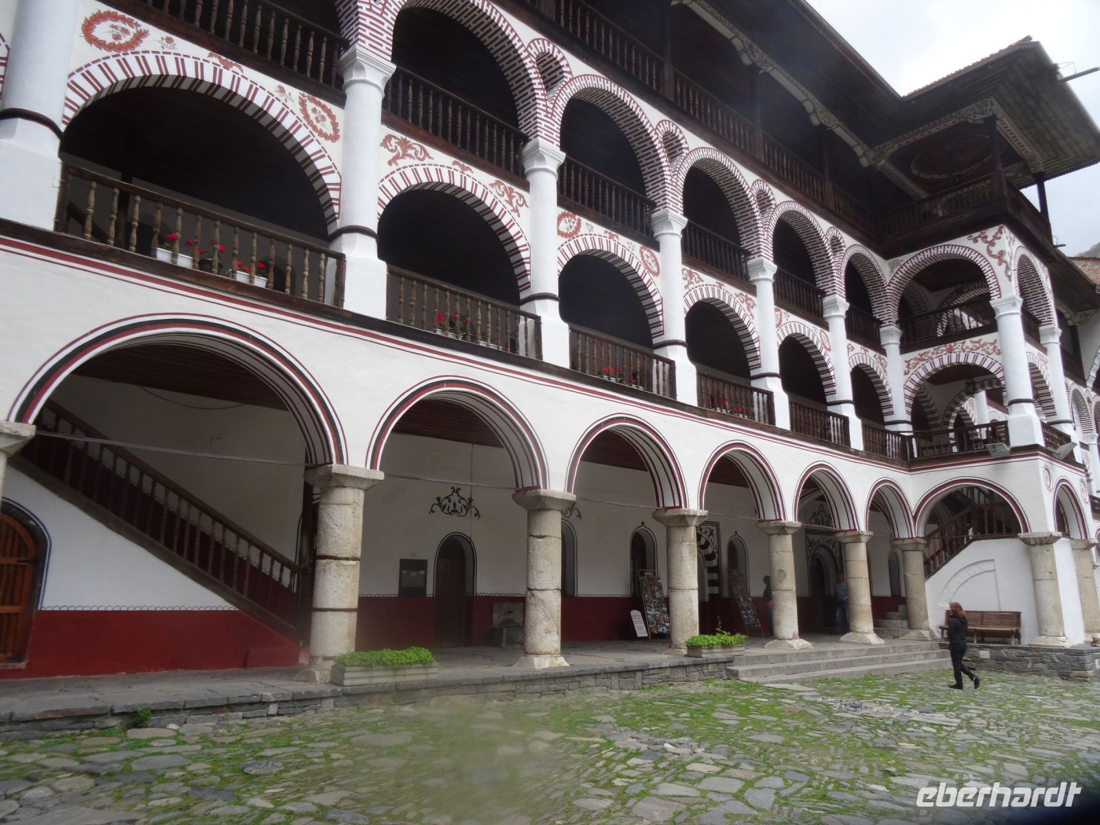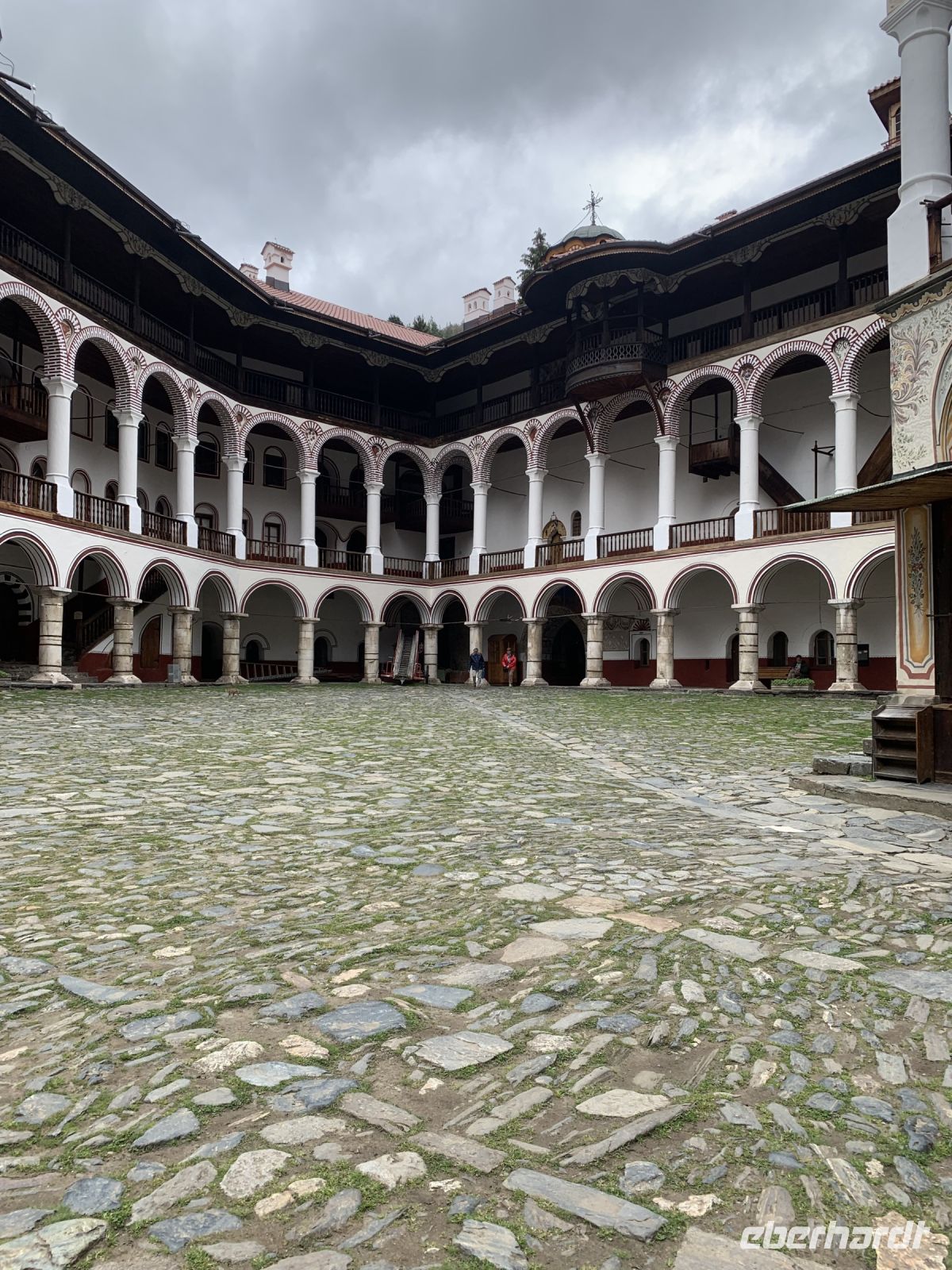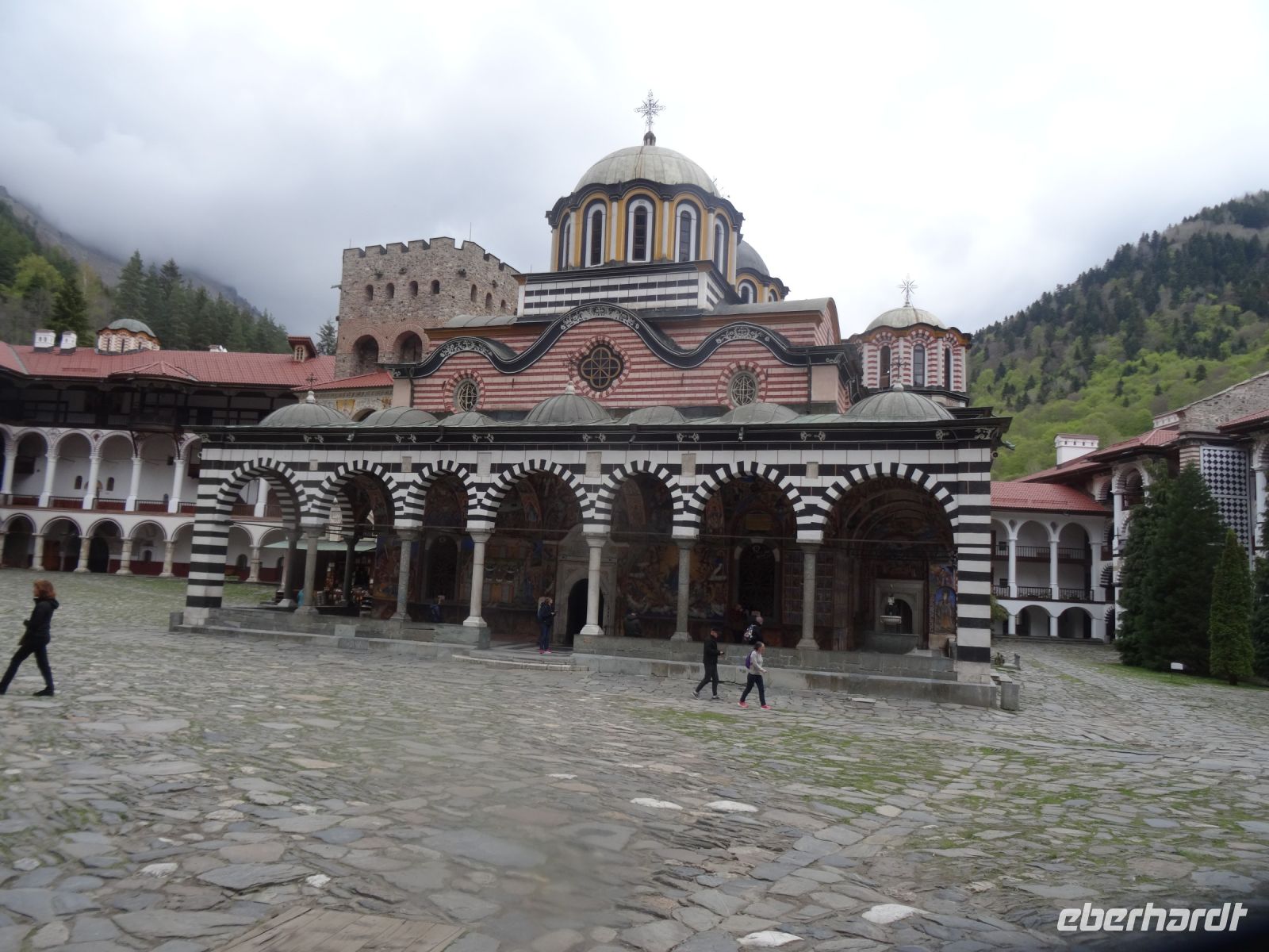 Im Rilagebirge fängt man in den klaren Gebirgsbächen köstliche Forellen - zum Mittagessen bestellen wir uns diese Köstlichkeit. Vorher aber besichtigen wir noch eines der beeindruckendsten Klöster Bulgariens, das Rila-Kloster. Es liegt 1150 m hoch und heute sind die umgebenden Berge von Wolken verhüllt. Der Eremit Johannes von Rila gründete das Kloster und führt ein, dass die Mönche ihren Lebensunterhalt durch ihre eigene Arbeit bestreiten. Wir sehen die Kirche mit ihren vielen bunten Fresken, den Innenhof mit seiner unverwechselbaren Architektur und den Hreljo-Turm in der Mitte.