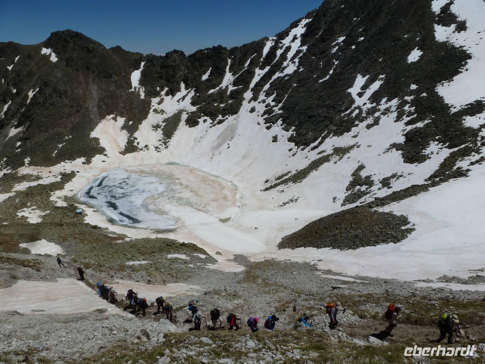 Der Abstieg war auch sehr schwierig, weil einige Schneefeld gegangen werden mussten. Loses Gestein erschwerte zum Teil den Abstieg. Mit den letzten Kraftreserven erreichten alle die Vihren Hütte, unseren Ausgangsort.