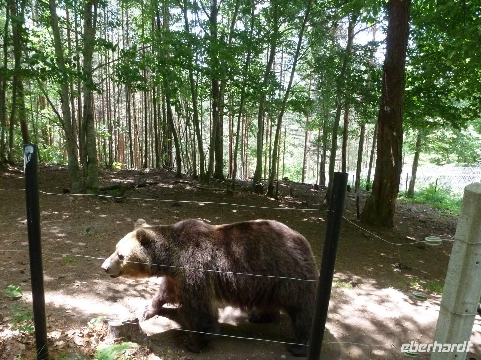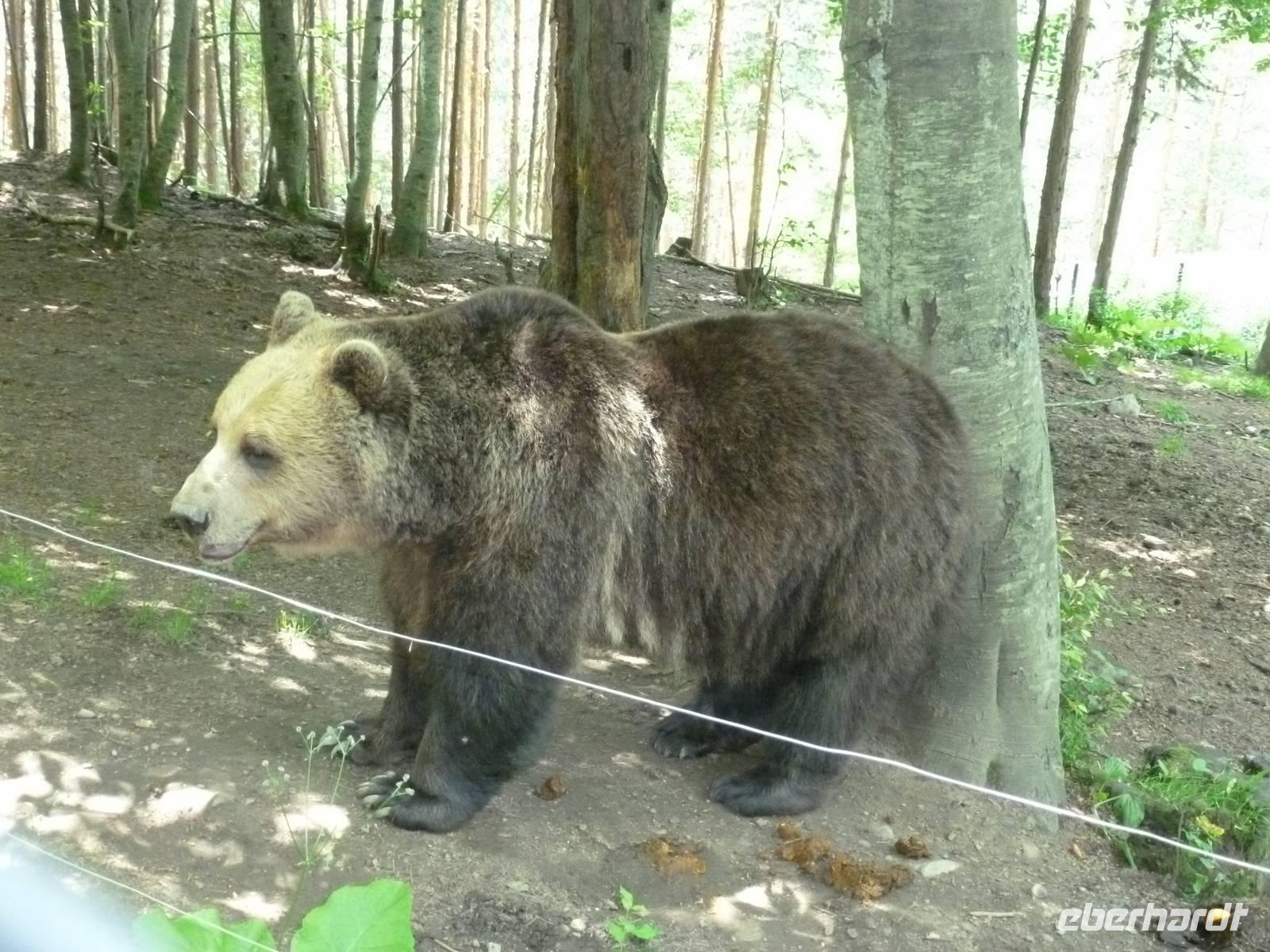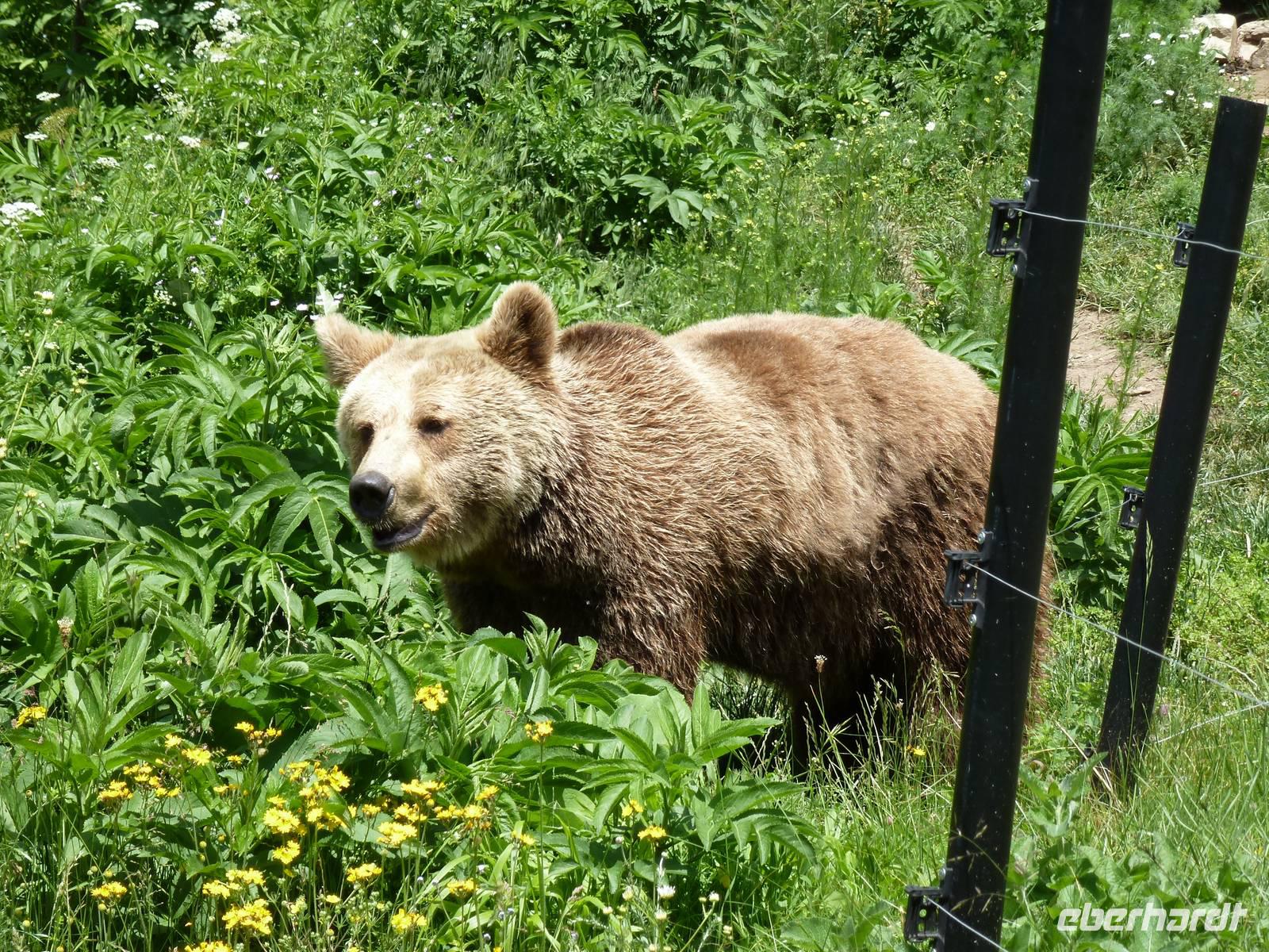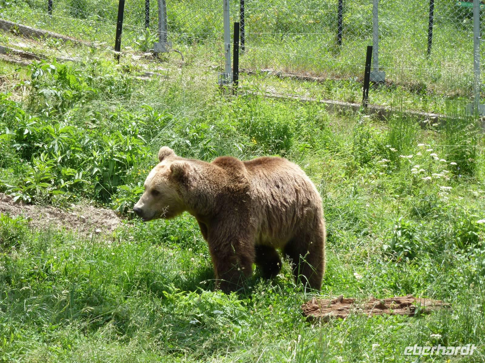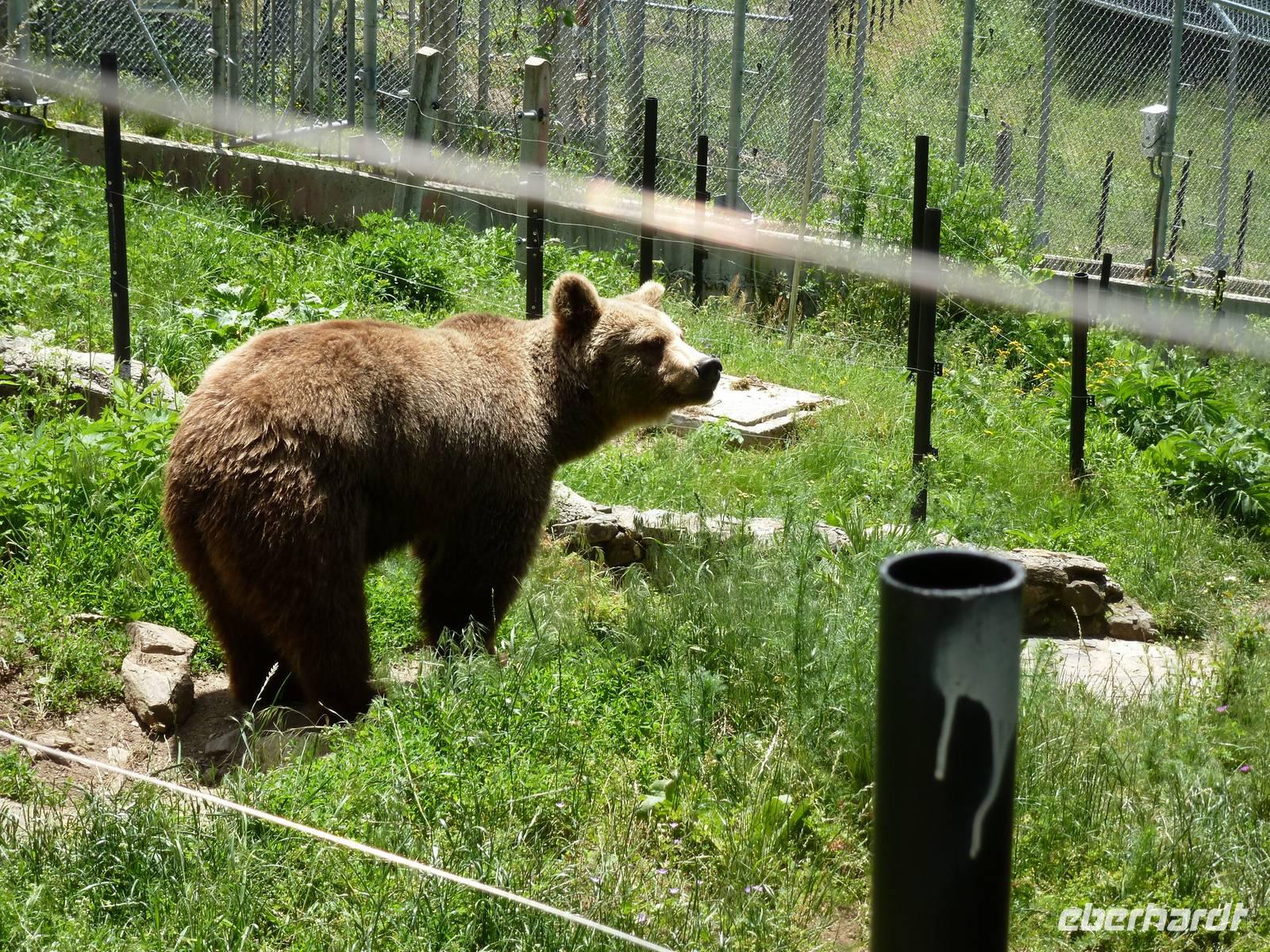 Das Gelände umfasst 120.000 Quadratmeter und ist in sieben Sektoren unterteilt. Bei unserem Rundweg konnten wir die umherstreifenden Bären beobachten und sahen zum Teil noch ihre Verletzungen durch die Nasenringe und Ketten.