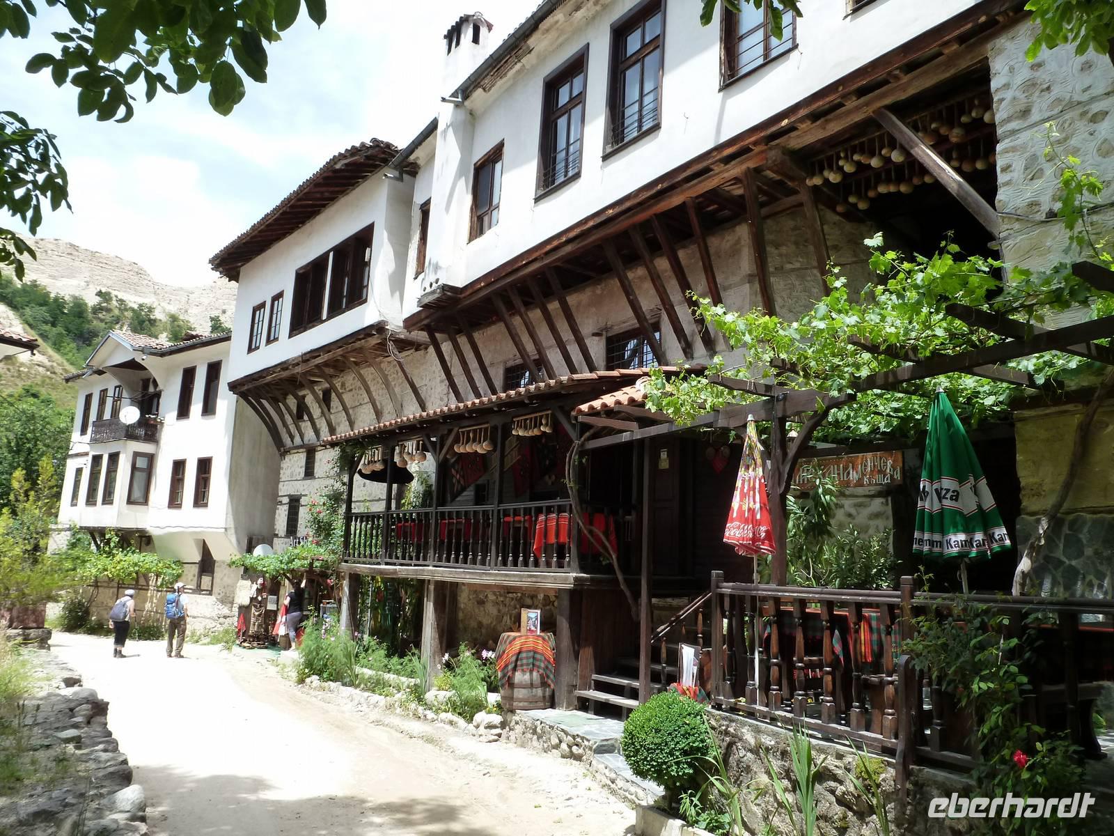 Unsere Mittagspause verbrachten wir auf dem Marktplatz, im Schatten sehr alter Platanen. Ein letzter Blick auf die wunderschönen alten Häuser mit den Holzbalkonen erinnert uns an das 18. bzw. 19.Jah. Jedes Haus in Melnik steht unter Denkmalschutz.