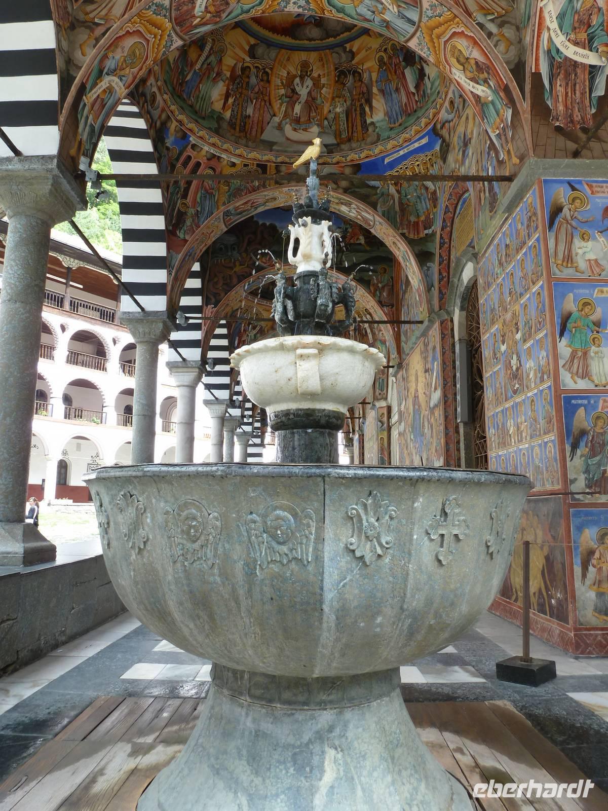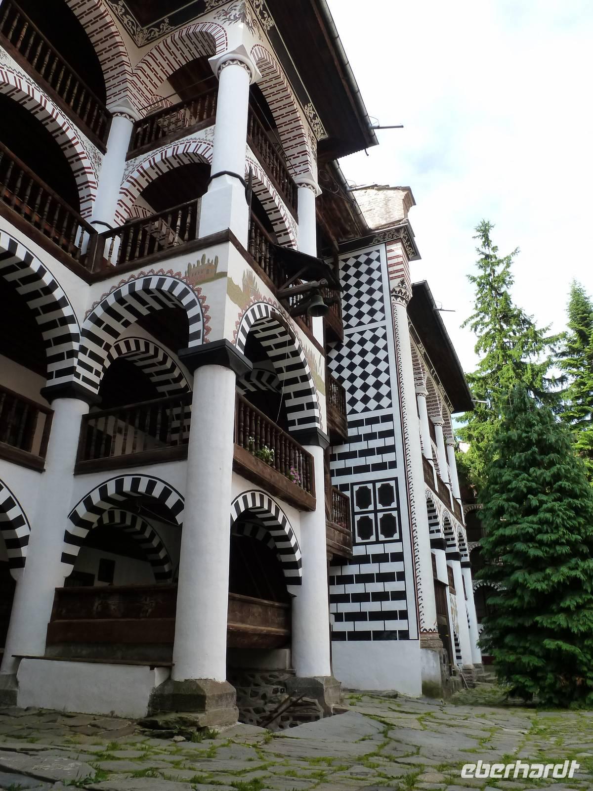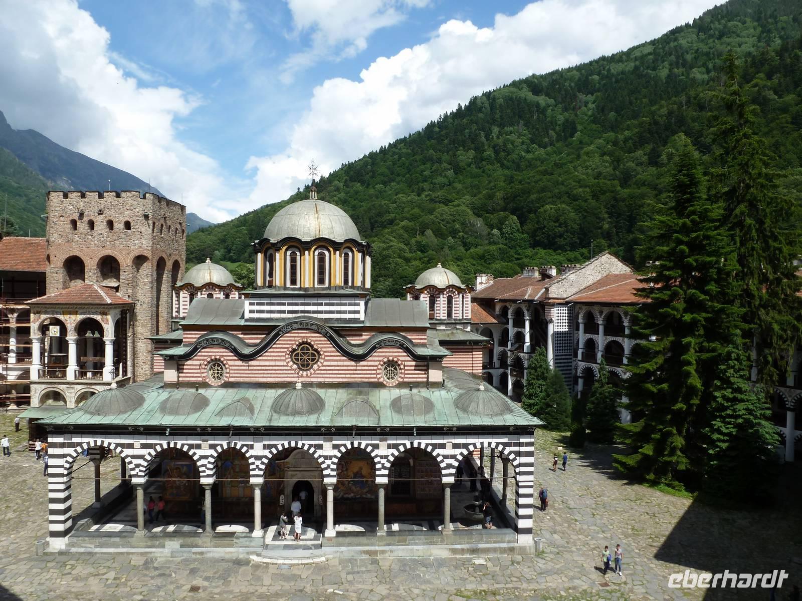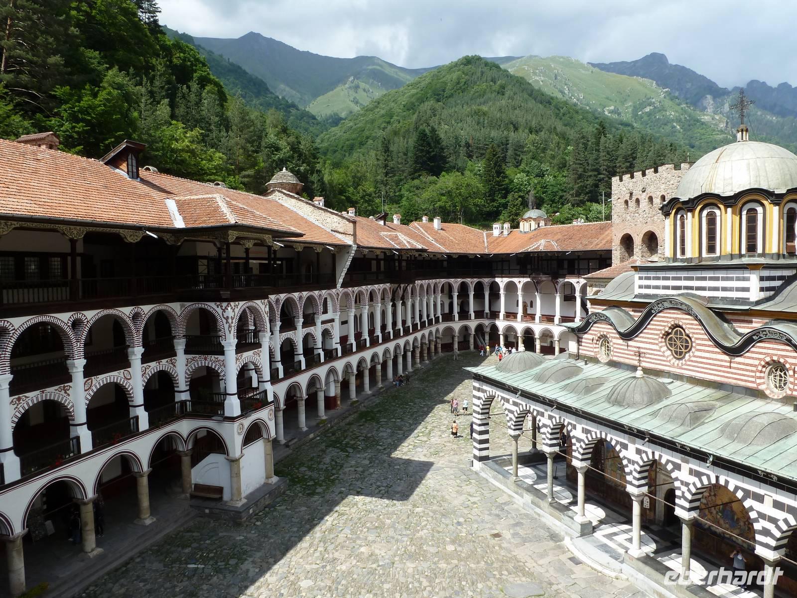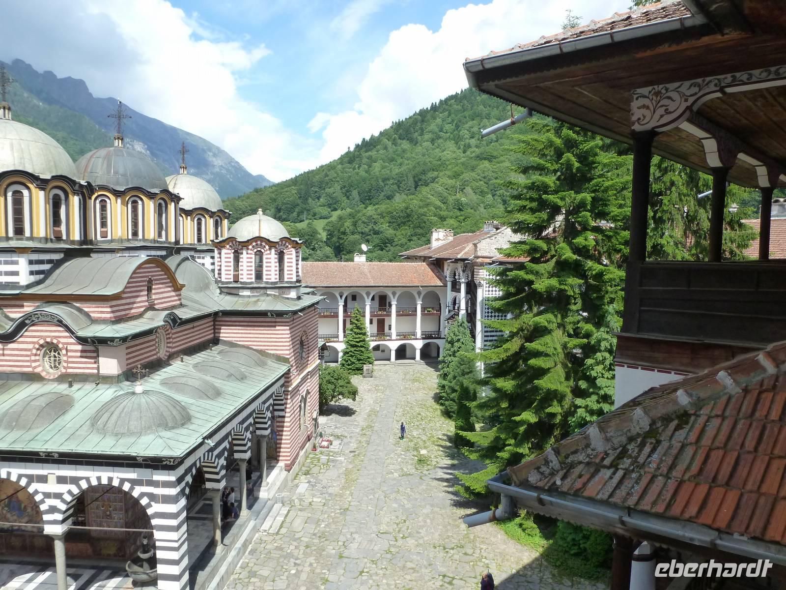 Von der 3. Etage des Klosters hatten wir den besten zusammenhängenden Blick, die Größe ist gewaltig und eingerahmt in die sanften Hänge des Rila Gebirges.