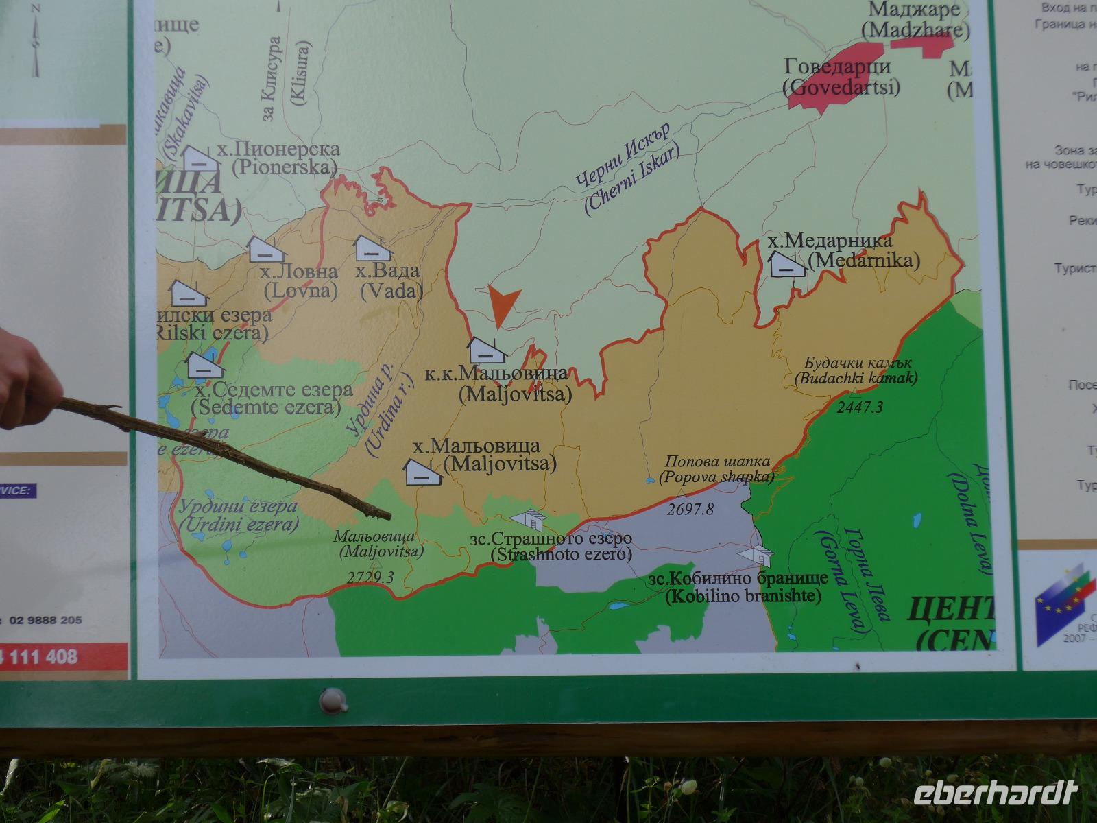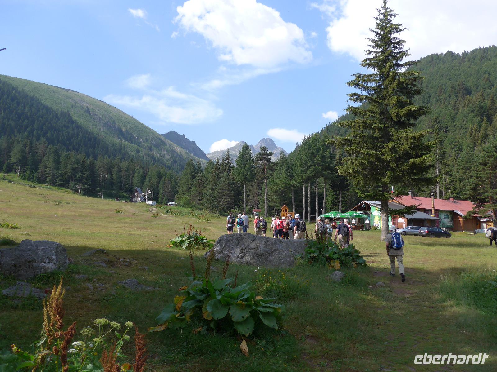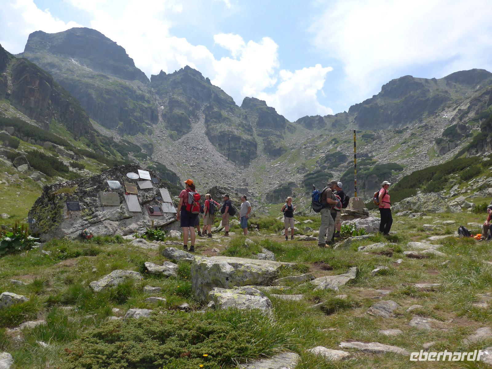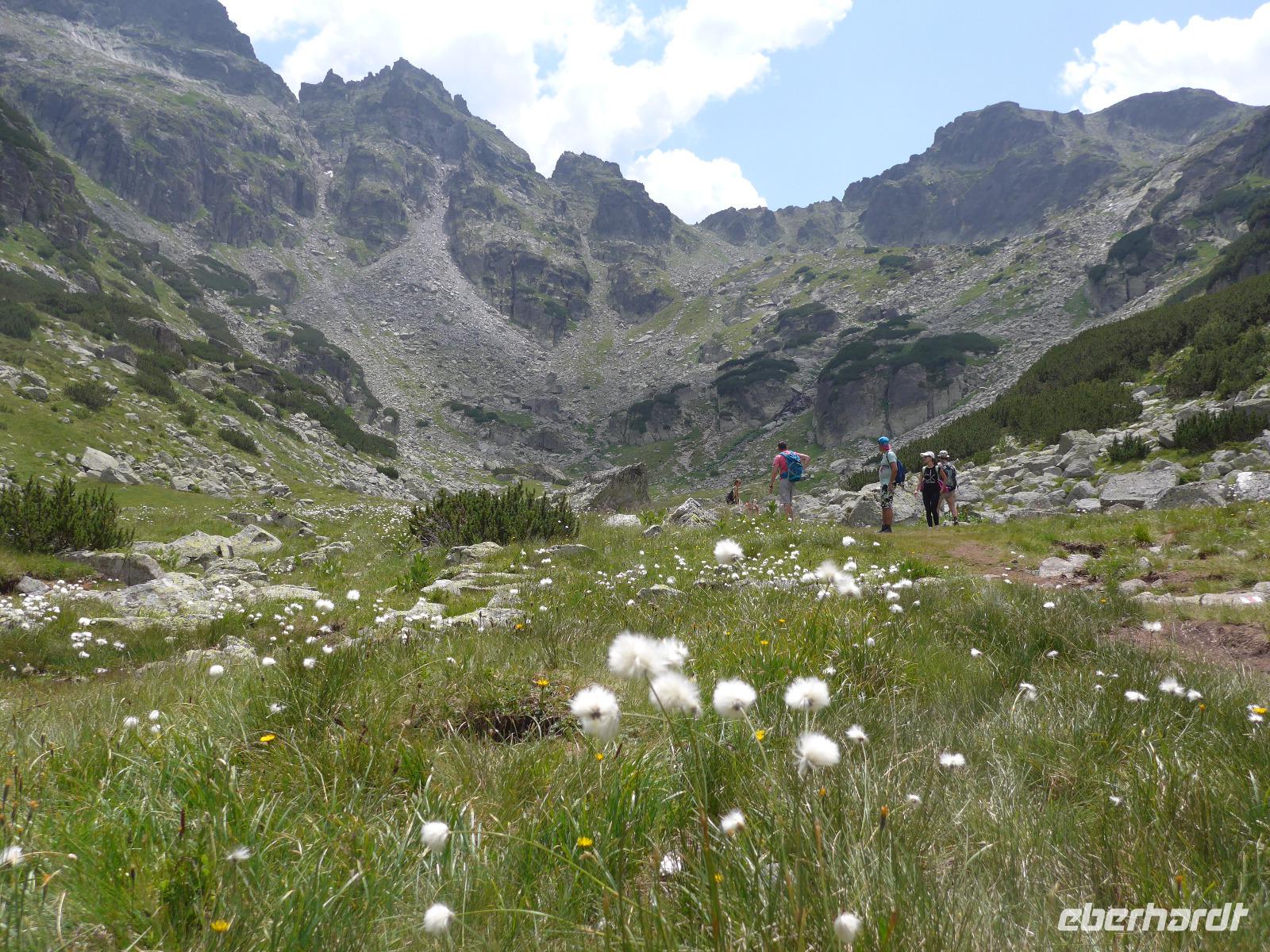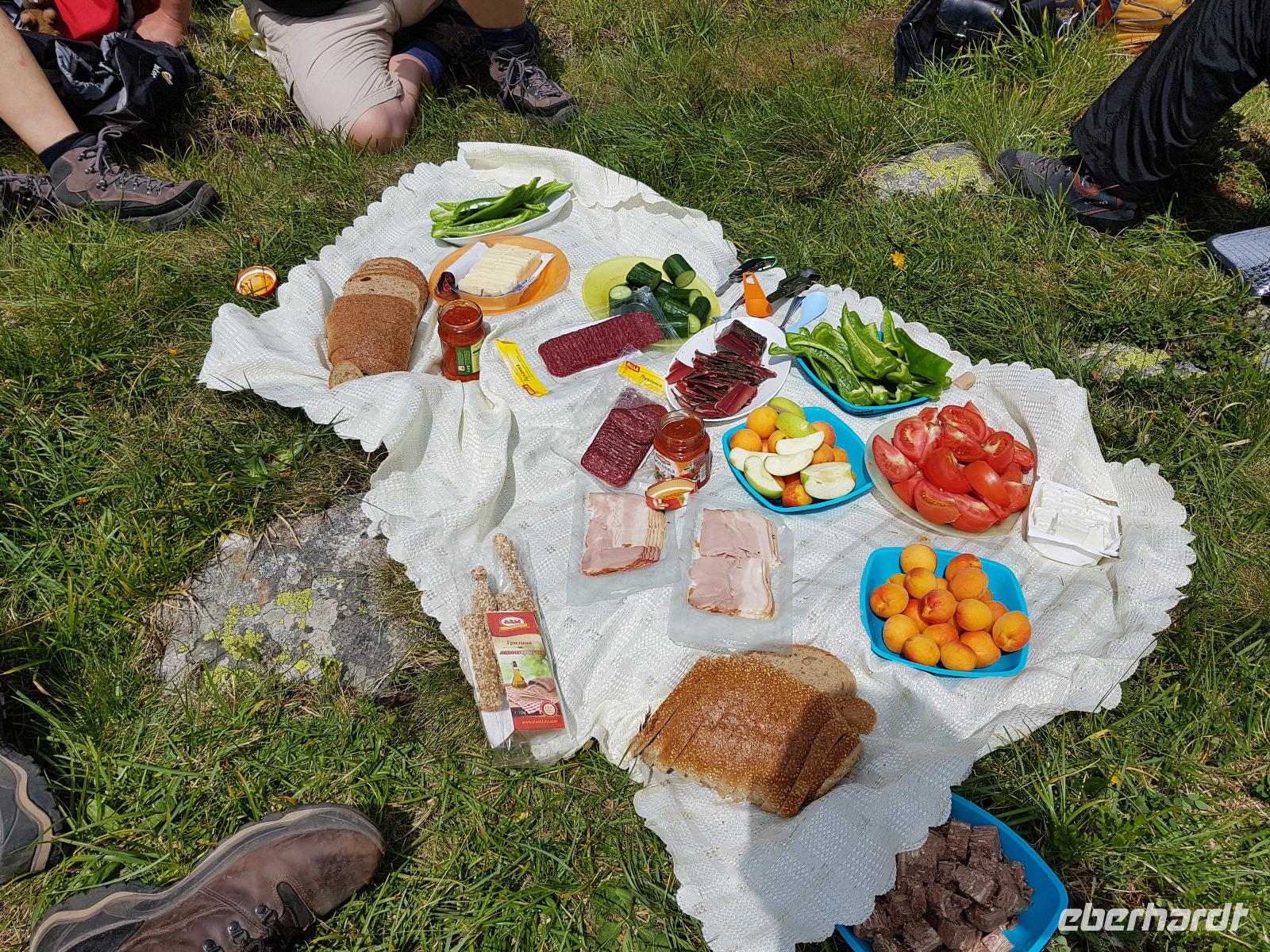 Für den heutigen Tag stand eine HALBTAGESWANDERUNG im Programm. Wir kauften morgens für ein Picknick ein und beschlossen, so weit zu laufen im Maljovitzatal wie wir Lust hatten. Unser Bus brachte uns zum Sportkomplex Maljovitza und dort startete unsere Wanderung immer talaufwärts. Der Gipfel der Maljovitza war immer gut zu erkennen. An der Maljovitza Berghütte beschlossen wir, eine oder zwei weitere Talstufen nach oben zu gehen. Auf einer Wiese mit Wollgras am Bach packte Milen seine "Wandertischdecke" und das "Geschirr" aus und viele fleißige Hände halfen, das Obst, Gemüse, Käse, Wurst, Brot usw. zu schneiden und zu portionieren. Wir hatten alles Produkte aus Bulgarien eingekauft und Milen erklärte uns die unbekannten Speisen. Dazu gab es ein Schlückchen Rotwein für jeden. Gut gestärkt nahmen wir so noch eine Etappe talaufwärts in Angriff und erreichten schließlich den Eleniosee auf 2480 Meter Höhe. 750 Höhenmeter waren wir gegangen und mächtig stolz auf diese Leistung.
