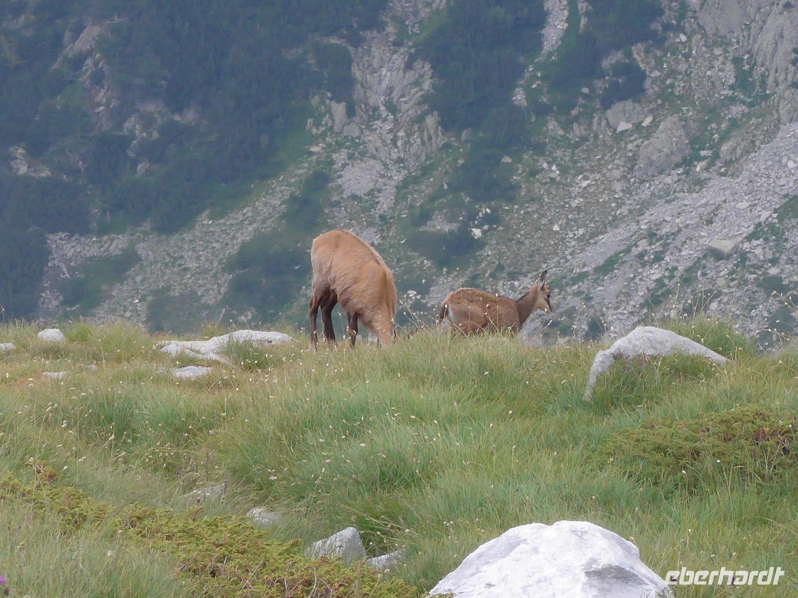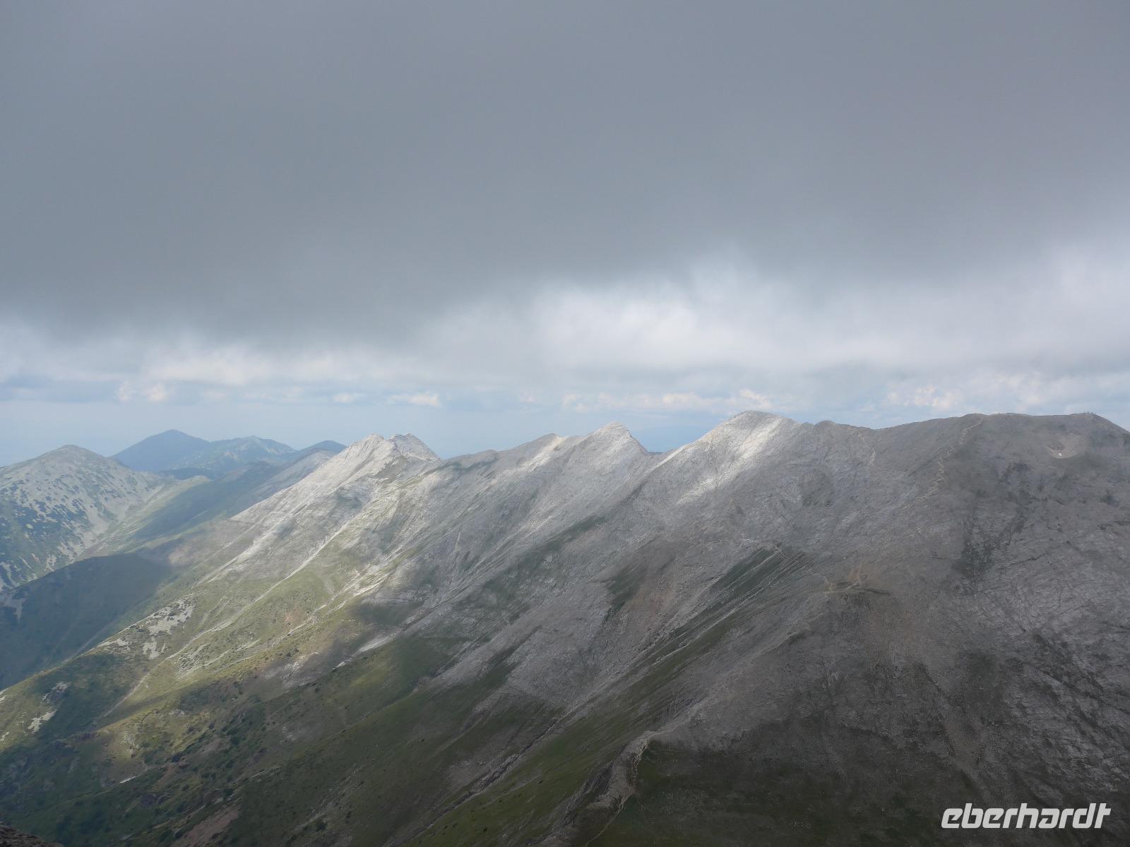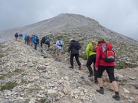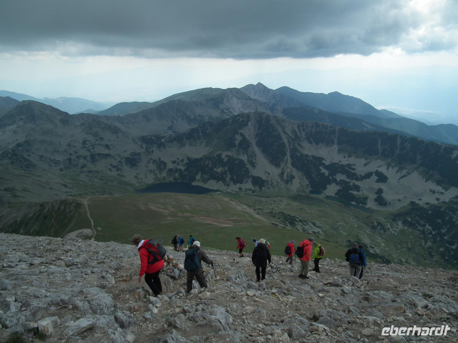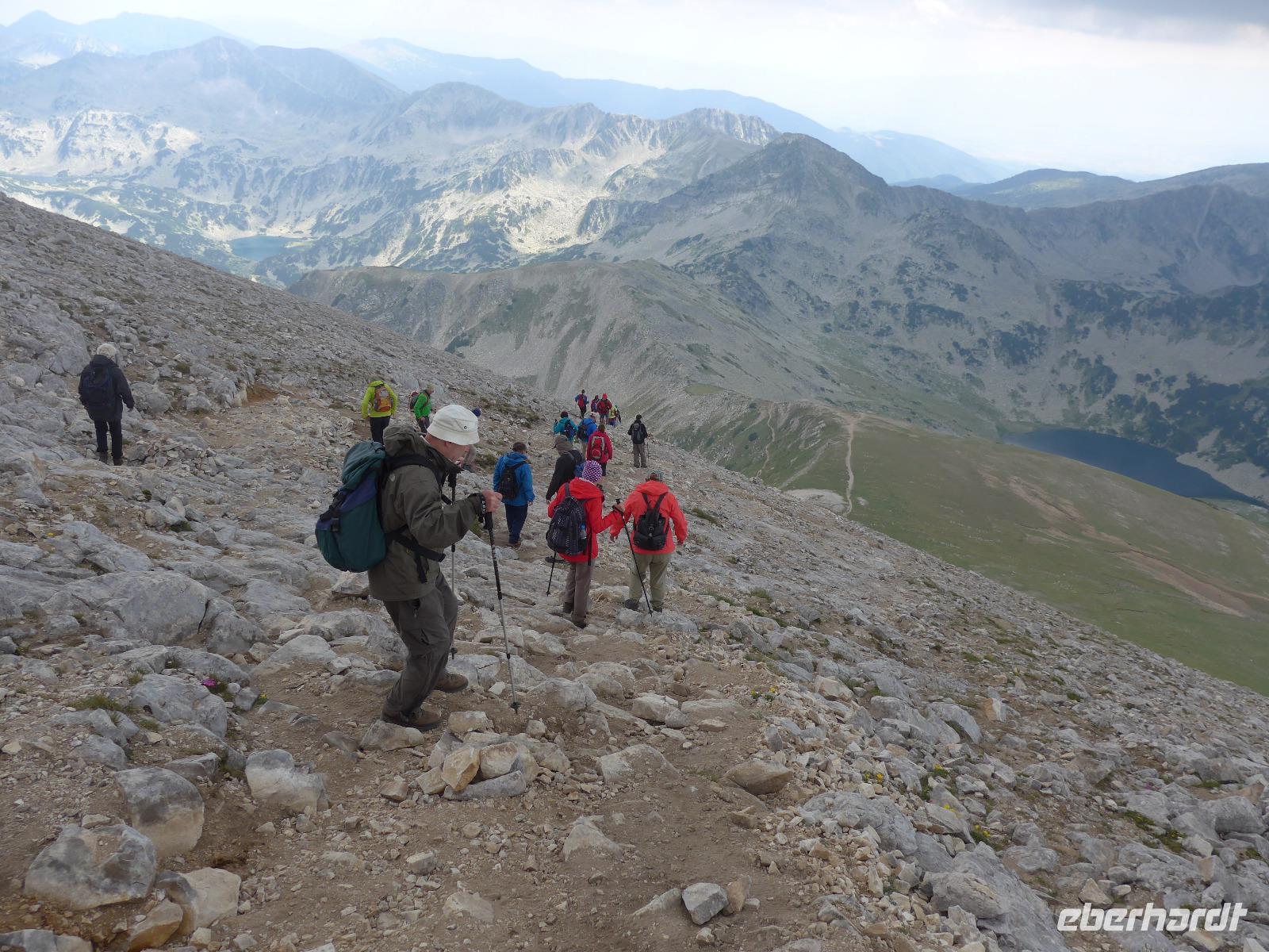 Gleich nach dem zeitigen Frühstück starteten wir Richtung Bansko und kamen nach 2 Stunden Fahrt im Hotel an, nahmen die Lunchpakete auf und fuhren weiter zur Vichren Berghütte. Noch schnell ein frisch gepresster Orangensaft an der Hütte. Dann ging es steil bergan bis zur Gabelung der Wege. Wir gingen rechts immer am steilen Hang entlang mit atemberaubenden Ausblicken bis zu einem Grat, von wo der von der Banderitza Hütte kommende Weg und der Vichrengipfel gut zu sehen waren. Der nächste Wegabschnitt, immer im Felsen entlang, bedurfte unserer vollen Aufmerksamkeit. Danach erreichten wir einen riesigen Kessel und machten unsere Mittagspause. Weiter ging es steil bergan zum Nord-Sattel des Vichren. Es kam Wind auf und wir zogen die Jacken an. Vom Sattel ging der Weg sehr steil bergan und kurz darauf waren Ketten zur Sicherung gespannt und wir kletterten im Fels nach oben. Ein unvergeßliches Erlebnis, was aber an unseren Kraftreserven zehrte. Schließlich aber war es geschafft und wir standen auf dem Gipfel des Vichren. Vor allem für die Teilnehmer, die diese Route vor Jahrzehnten schon einmal gegangen waren, war der Augenblick ergreifend. Wir hatten eine tolle Sicht in alle Richtungen und die Wolkendecke hoch über dem Gipfel gab dem ganzen etwas Magisches. Schnell fanden wir Fotografen für unser Gruppenfoto, denn mit dieser Besteigung krönten wir unsere Wanderreise in Bulgarien. Für den Abstieg wählte Milen die Südseite und am Sattel konnten wir Edelweiss und Gemsen bestaunen.