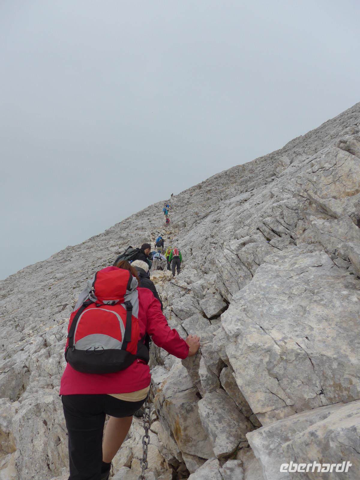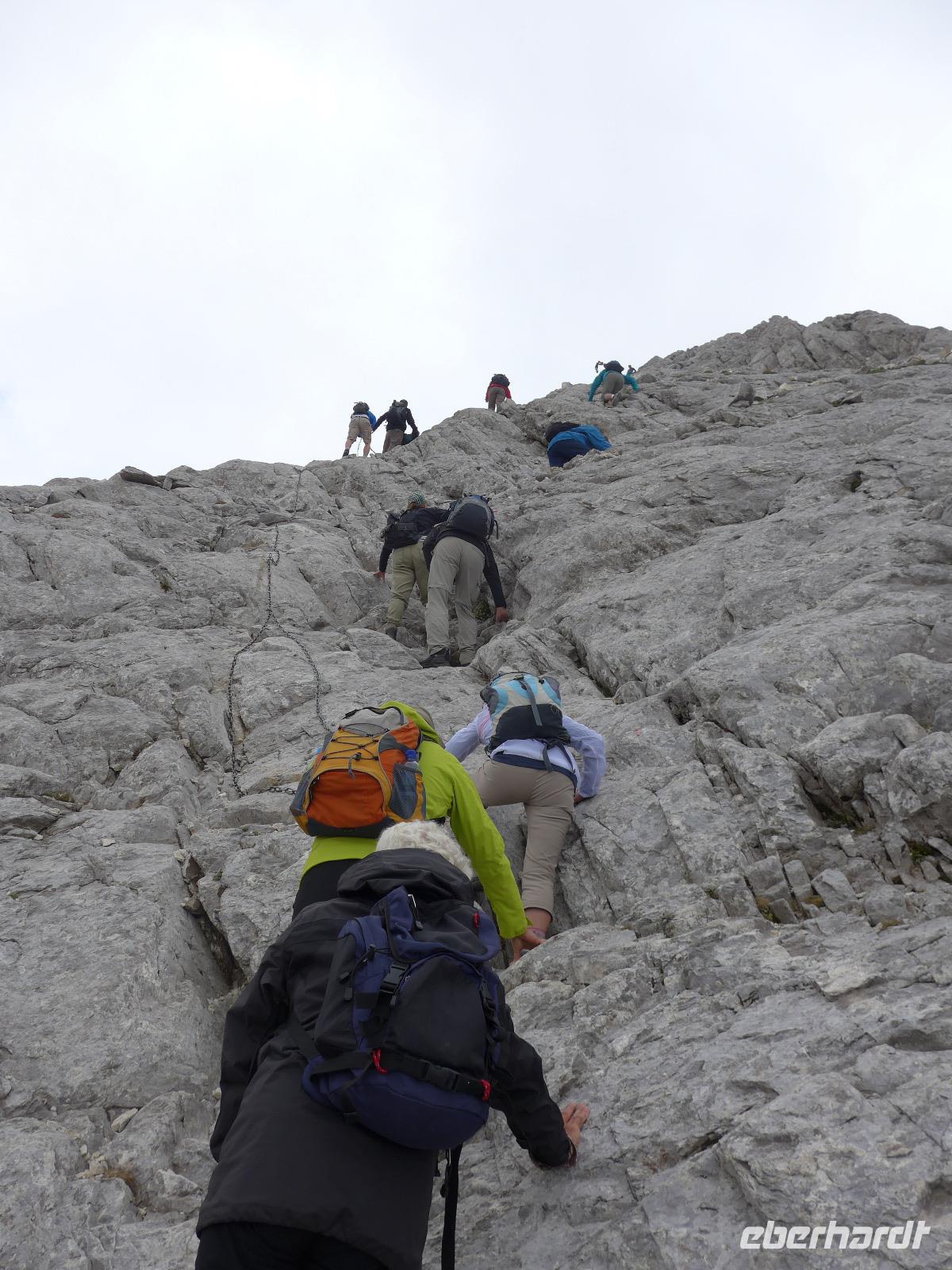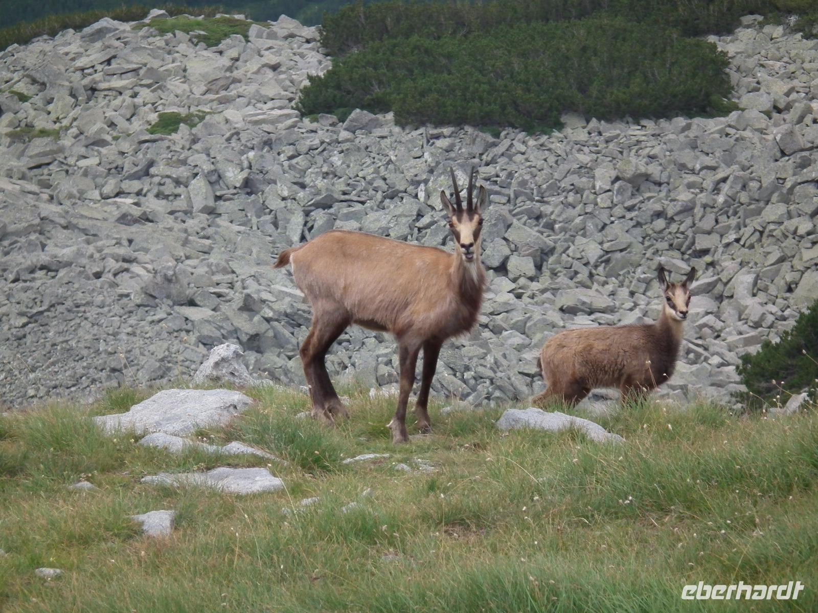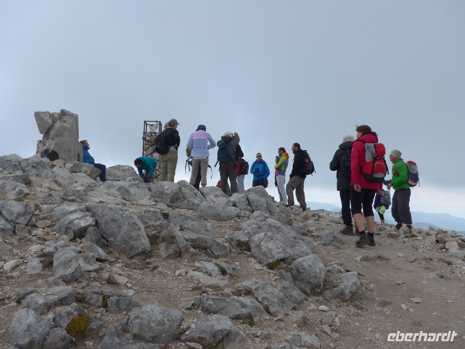 Gleich nach dem zeitigen Frühstück starteten wir Richtung Bansko und kamen nach 2 Stunden Fahrt im Hotel an, nahmen die Lunchpakete auf und fuhren weiter zur Vichren Berghütte. Noch schnell ein frisch gepresster Orangensaft an der Hütte. Dann ging es steil bergan bis zur Gabelung der Wege. Wir gingen rechts immer am steilen Hang entlang mit atemberaubenden Ausblicken bis zu einem Grat, von wo der von der Banderitza Hütte kommende Weg und der Vichrengipfel gut zu sehen waren. Der nächste Wegabschnitt, immer im Felsen entlang, bedurfte unserer vollen Aufmerksamkeit. Danach erreichten wir einen riesigen Kessel und machten unsere Mittagspause. Weiter ging es steil bergan zum Nord-Sattel des Vichren. Es kam Wind auf und wir zogen die Jacken an. Vom Sattel ging der Weg sehr steil bergan und kurz darauf waren Ketten zur Sicherung gespannt und wir kletterten im Fels nach oben. Ein unvergeßliches Erlebnis, was aber an unseren Kraftreserven zehrte. Schließlich aber war es geschafft und wir standen auf dem Gipfel des Vichren. Vor allem für die Teilnehmer, die diese Route vor Jahrzehnten schon einmal gegangen waren, war der Augenblick ergreifend. Wir hatten eine tolle Sicht in alle Richtungen und die Wolkendecke hoch über dem Gipfel gab dem ganzen etwas Magisches. Schnell fanden wir Fotografen für unser Gruppenfoto, denn mit dieser Besteigung krönten wir unsere Wanderreise in Bulgarien. Für den Abstieg wählte Milen die Südseite und am Sattel konnten wir Edelweiss und Gemsen bestaunen.