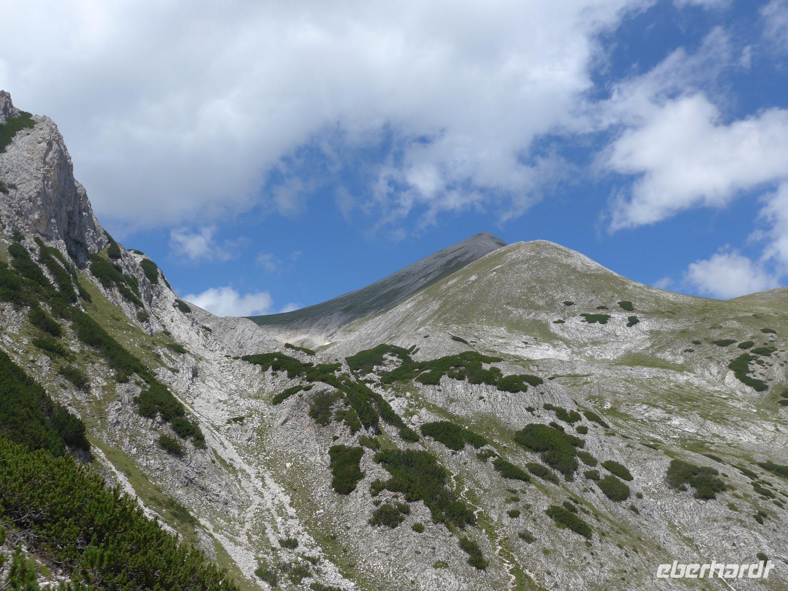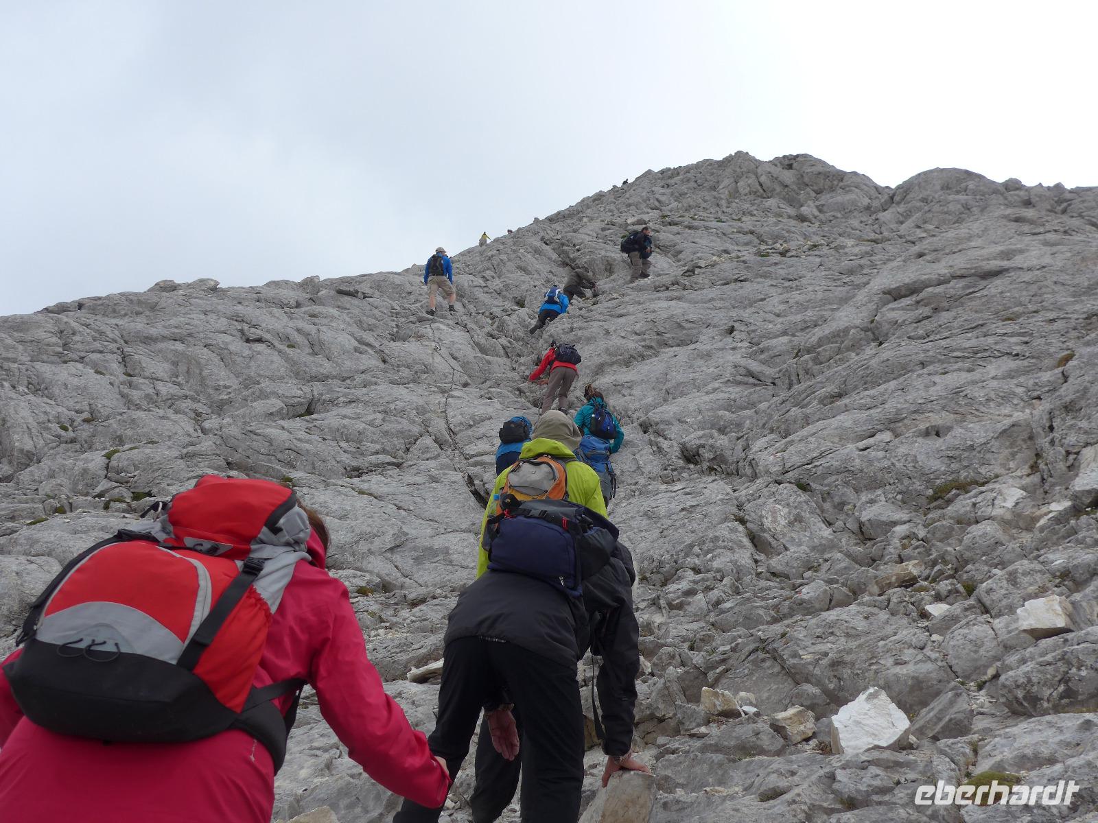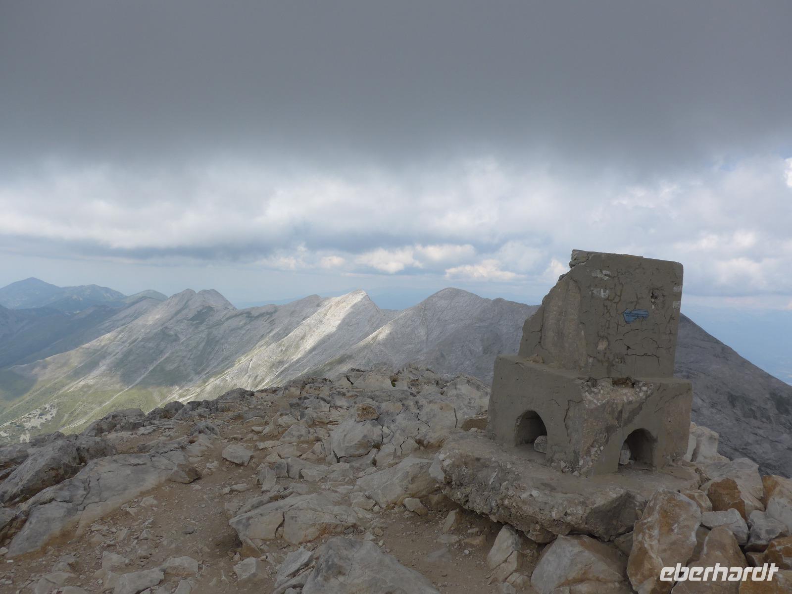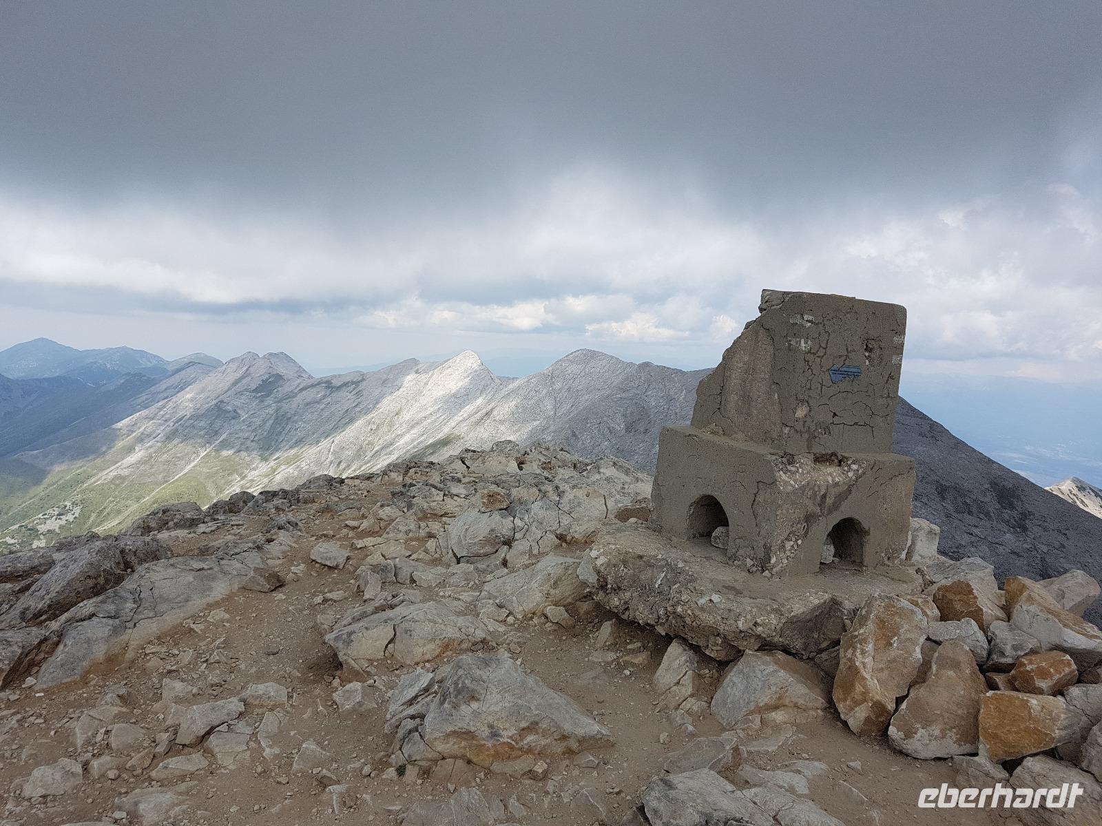Gleich nach dem zeitigen Frühstück starteten wir Richtung Bansko und kamen nach 2 Stunden Fahrt im Hotel an, nahmen die Lunchpakete auf und fuhren weiter zur Vichren Berghütte. Noch schnell ein frisch gepresster Orangensaft an der Hütte. Dann ging es steil bergan bis zur Gabelung der Wege. Wir gingen rechts immer am steilen Hang entlang mit atemberaubenden Ausblicken bis zu einem Grat, von wo der von der Banderitza Hütte kommende Weg und der Vichrengipfel gut zu sehen waren. Der nächste Wegabschnitt, immer im Felsen entlang, bedurfte unserer vollen Aufmerksamkeit. Danach erreichten wir einen riesigen Kessel und machten unsere Mittagspause. Weiter ging es steil bergan zum Nord-Sattel des Vichren. Es kam Wind auf und wir zogen die Jacken an. Vom Sattel ging der Weg sehr steil bergan und kurz darauf waren Ketten zur Sicherung gespannt und wir kletterten im Fels nach oben. Ein unvergeßliches Erlebnis, was aber an unseren Kraftreserven zehrte. Schließlich aber war es geschafft und wir standen auf dem Gipfel des Vichren. Vor allem für die Teilnehmer, die diese Route vor Jahrzehnten schon einmal gegangen waren, war der Augenblick ergreifend. Wir hatten eine tolle Sicht in alle Richtungen und die Wolkendecke hoch über dem Gipfel gab dem ganzen etwas Magisches. Schnell fanden wir Fotografen für unser Gruppenfoto, denn mit dieser Besteigung krönten wir unsere Wanderreise in Bulgarien. Für den Abstieg wählte Milen die Südseite und am Sattel konnten wir Edelweiss und Gemsen bestaunen.