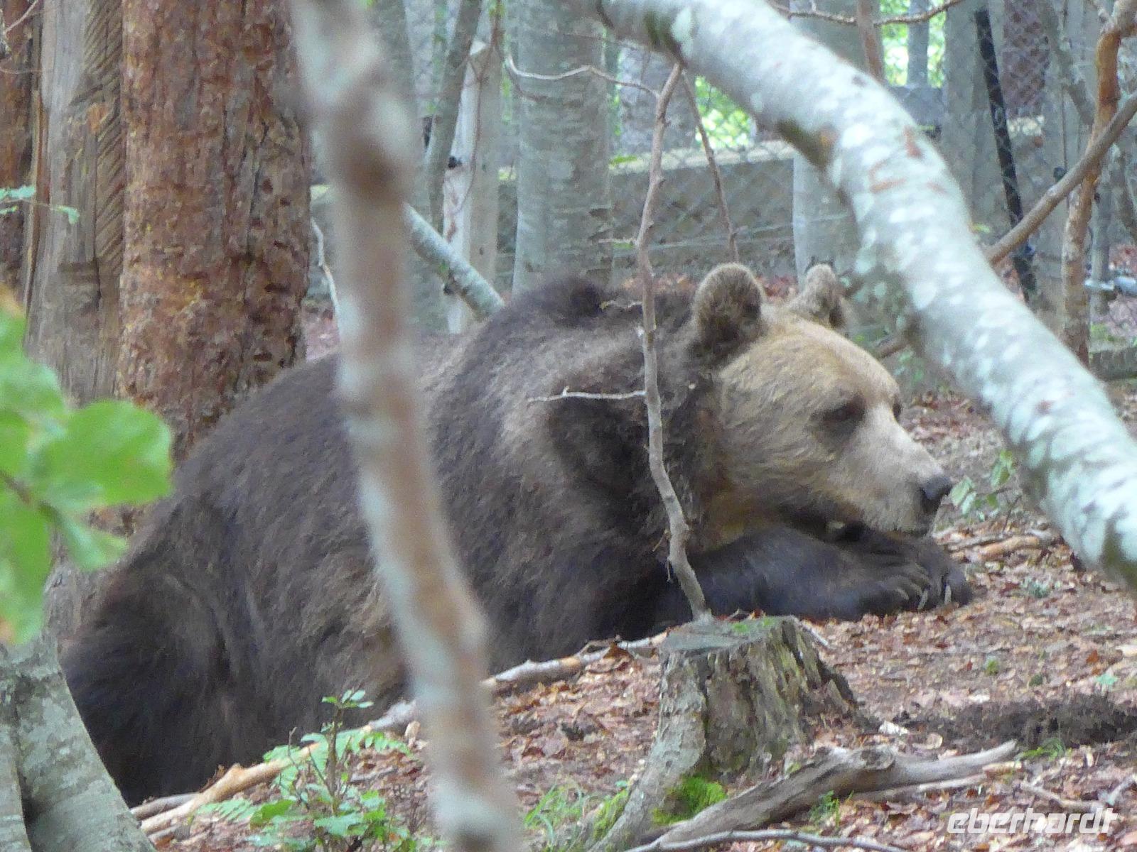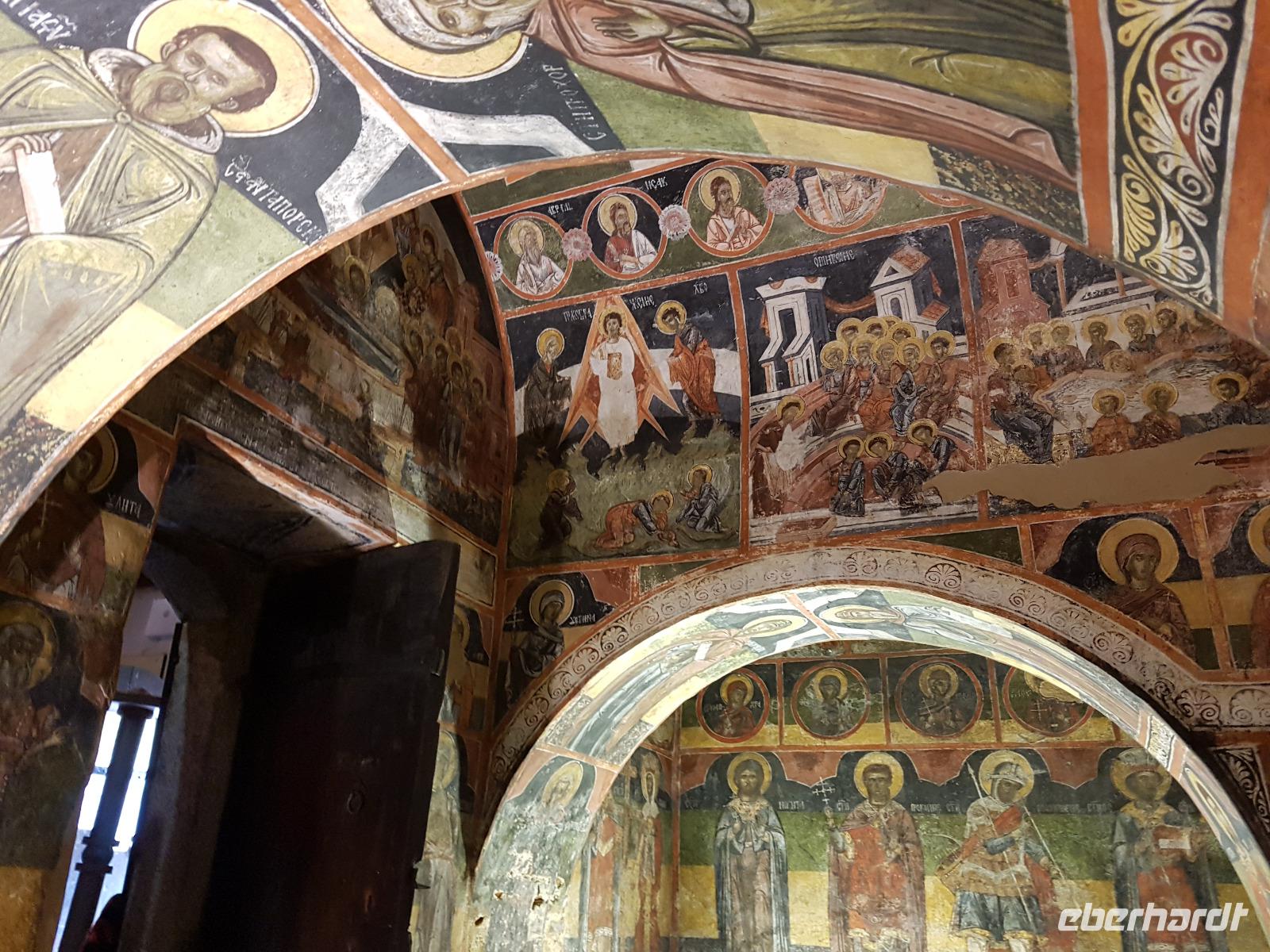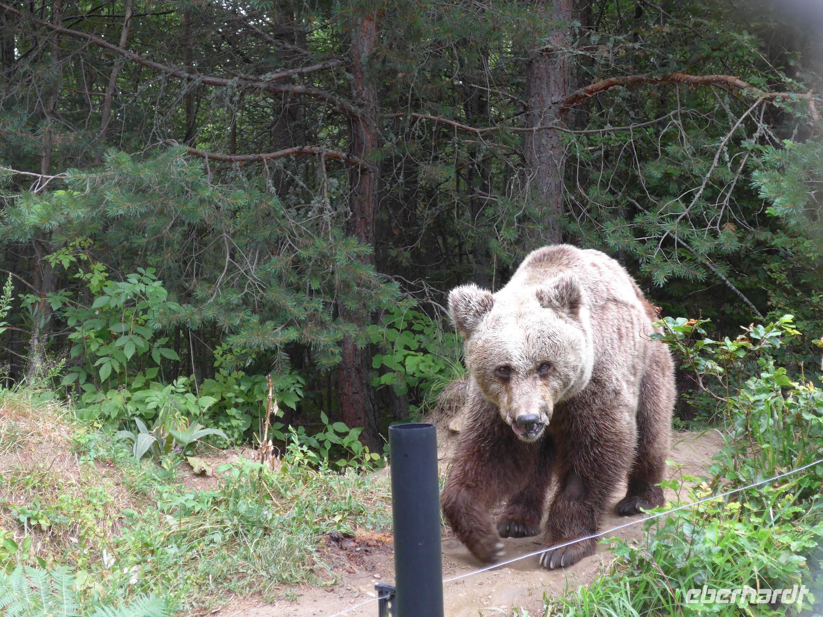 Heute hatten die Wanderschuhe Pause. Nach dem Frühstück fuhren wir zunächst in Bansko zur Post, um Briefmarken zu kaufen und nochmals Geld zu wechseln. Die Weiterfahrt entlang einer alten Schmalspurbahn ging dann bergan nach Belitza, wo wir den Park der einstigen Tanzbären besuchten. Die Organisation 4 Pfoten und die Brigitte-Bardot-Stiftung finanzieren das Projekt und ermöglichen den einst gequälten Bären einen würdigen Lebensabend. Beim Rundgang durch die Gehege sahen wir ehemalige Tanzbären und einen Jungbären aus Albanien, dessen Mutter von Jägern getötet wurde. In der Nähe des Parks kehrten wir zum Mittagsimbiß ein, bevor wir weiter fuhren nach Dobarsko. Das Dorf an den Hängen des Südrilas hat eine wertvolle Kirche und die singenden Omas zu bieten. Die dreischiffige Basilika aus dem Jahr 1612 ist ganz mit Fresken ausgemahlt und berühmt für die Darstellung der Chrsti Himmelfahrt in einer Rakete. Bei einer Führung in der Kirche wurden uns die Fresken ausführlich erläutert.