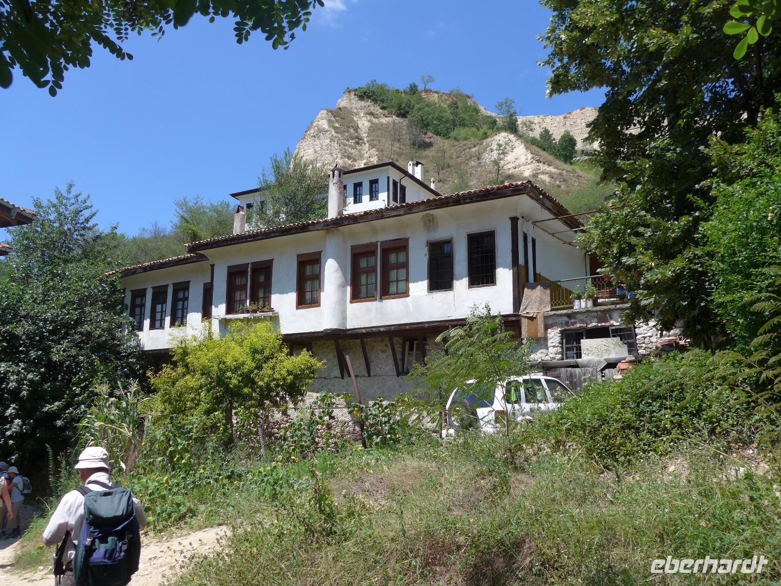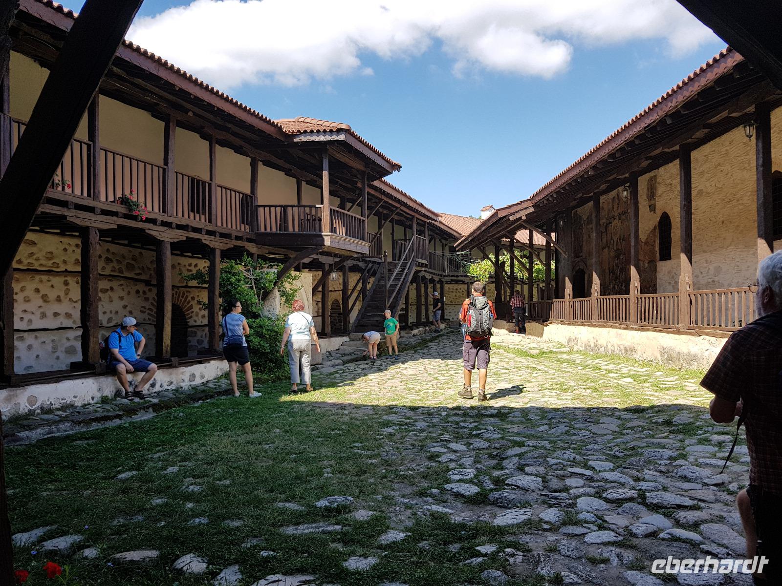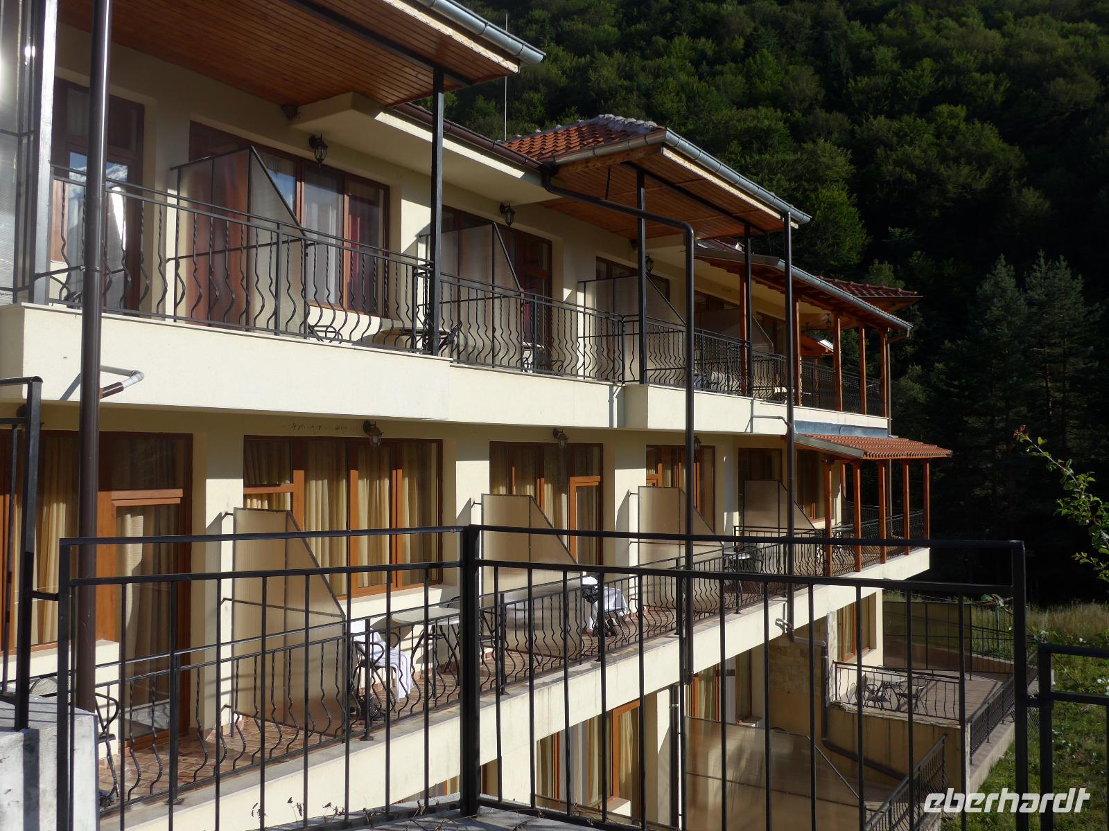 Wir fuhren von Bansko entlang des Piringebirges und weiter durch die Kresna Schlucht gen Süden zum Rozenkloster. Das kleine schlichte Kloster liegt inmitten einer traumhaften Landschaft. Wir spazierten durch die hölzernen Gänge, besuchten die Kirche mit vielen Fresken und einer wunderschönen Ikonostase und genossen die Stille im mit Wein bewachsenen Innenhof. Der Speisesaal der Mönche und der Backofen waren ebenfalls zu besichtigen. Zur Zeit gibt es nur einen Abt und einen Mönch im Kloster, dafür aber viele kleine hungrige Katzen. Nach der Besichtigung nahmen wir unsere Rucksäcke und stiegen zunächst bergauf zu einem Aussichtspunkt. An den südlichen Ausläufern des Pirin ist eine Wunderwelt von Pyramiden aus einem Sandstein-Lehm-Gemisch entstanden. Wir durchwanderten dieses Gebiet und konnten uns nicht satt sehen. Viele Fotostopps wurden eingelegt und ganz im Süden sahen wir die Berge von Griechenland. Beim steilen Abstieg nach Melnik säumten Perückensträucher den Weg und unten im Flußbett grünte und blühte es. In Melnik stärkten wir uns im Mexana beim Mittagessen, besichtigten das Kordopulow-Haus und fuhren dann zu einem neuen Weingut, wo es 3 Weine der Villa Melnik zu probieren gab. Danach folgte die Busfahrt ins Rilski Tal zu unserem letzten Hotel der Reise.