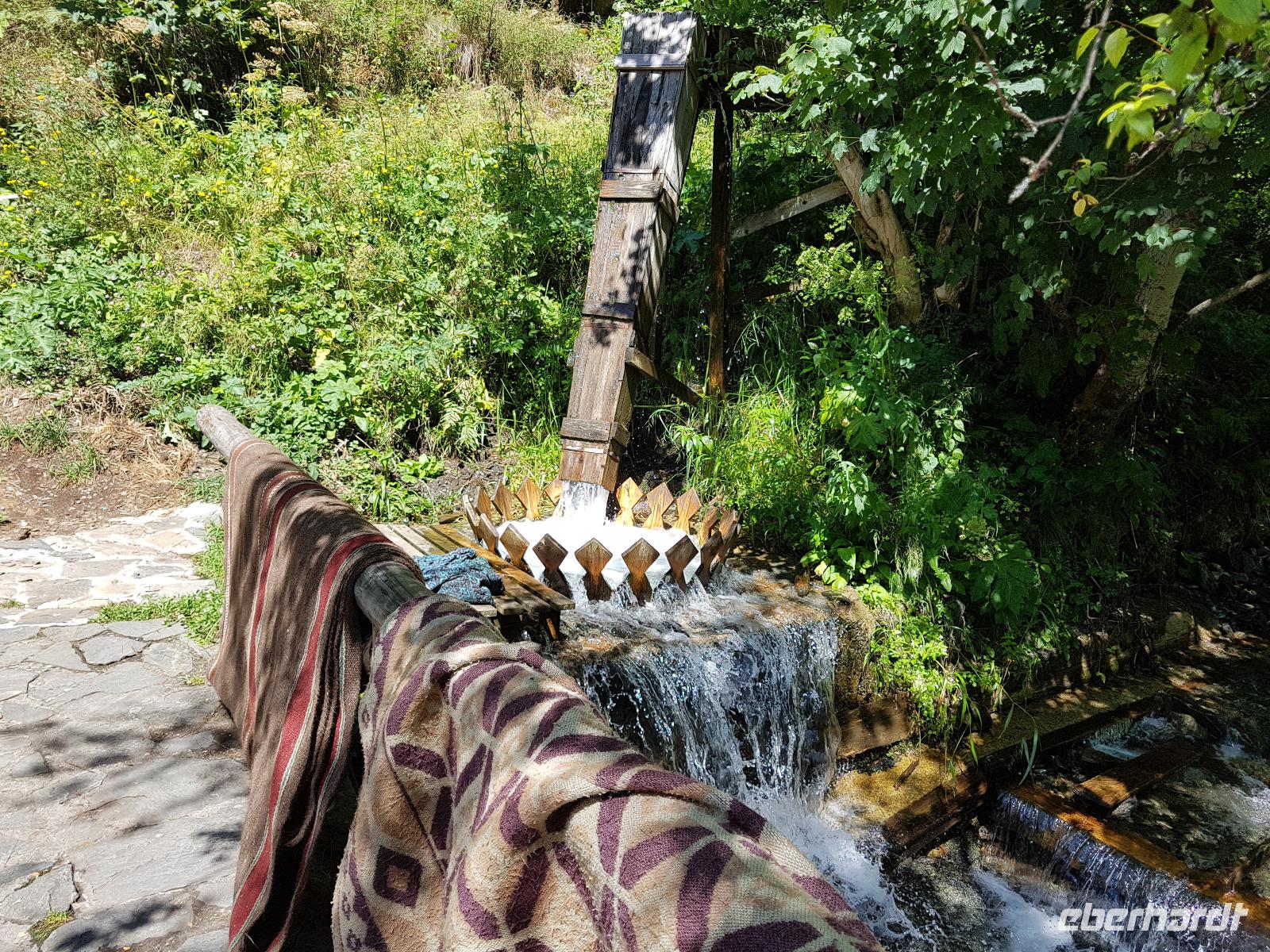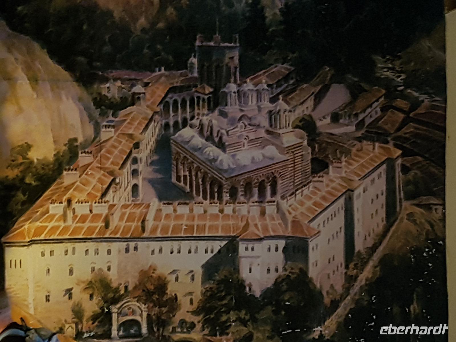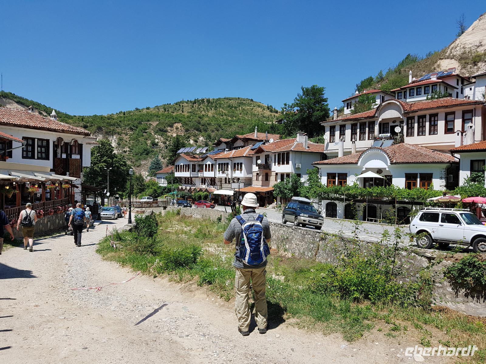 Wir fuhren von Bansko entlang des Piringebirges und weiter durch die Kresna Schlucht gen Süden zum Rozenkloster. Das kleine schlichte Kloster liegt inmitten einer traumhaften Landschaft. Wir spazierten durch die hölzernen Gänge, besuchten die Kirche mit vielen Fresken und einer wunderschönen Ikonostase und genossen die Stille im mit Wein bewachsenen Innenhof. Der Speisesaal der Mönche und der Backofen waren ebenfalls zu besichtigen. Zur Zeit gibt es nur einen Abt und einen Mönch im Kloster, dafür aber viele kleine hungrige Katzen. Nach der Besichtigung nahmen wir unsere Rucksäcke und stiegen zunächst bergauf zu einem Aussichtspunkt. An den südlichen Ausläufern des Pirin ist eine Wunderwelt von Pyramiden aus einem Sandstein-Lehm-Gemisch entstanden. Wir durchwanderten dieses Gebiet und konnten uns nicht satt sehen. Viele Fotostopps wurden eingelegt und ganz im Süden sahen wir die Berge von Griechenland. Beim steilen Abstieg nach Melnik säumten Perückensträucher den Weg und unten im Flußbett grünte und blühte es. In Melnik stärkten wir uns im Mexana beim Mittagessen, besichtigten das Kordopulow-Haus und fuhren dann zu einem neuen Weingut, wo es 3 Weine der Villa Melnik zu probieren gab. Danach folgte die Busfahrt ins Rilski Tal zu unserem letzten Hotel der Reise.