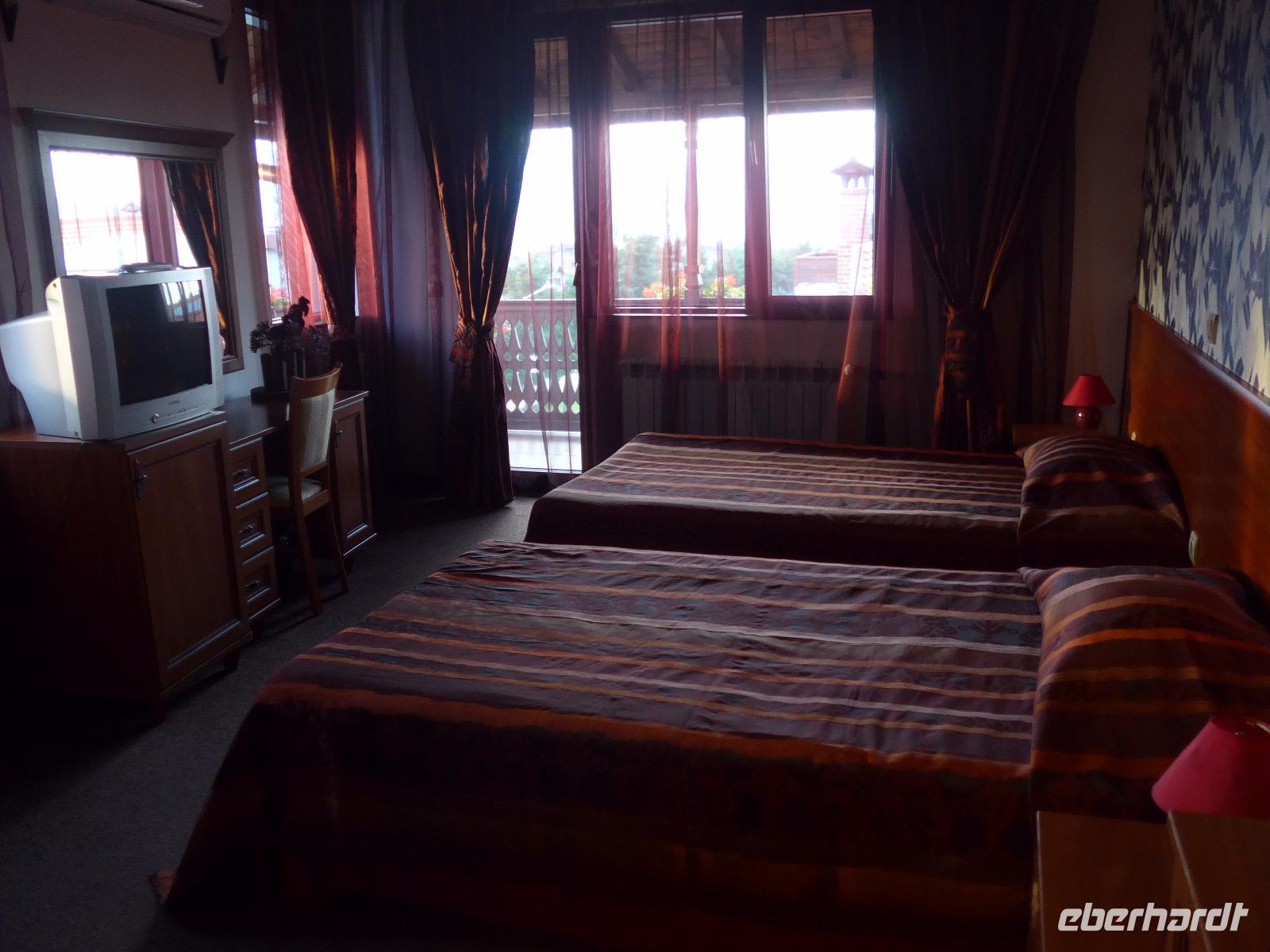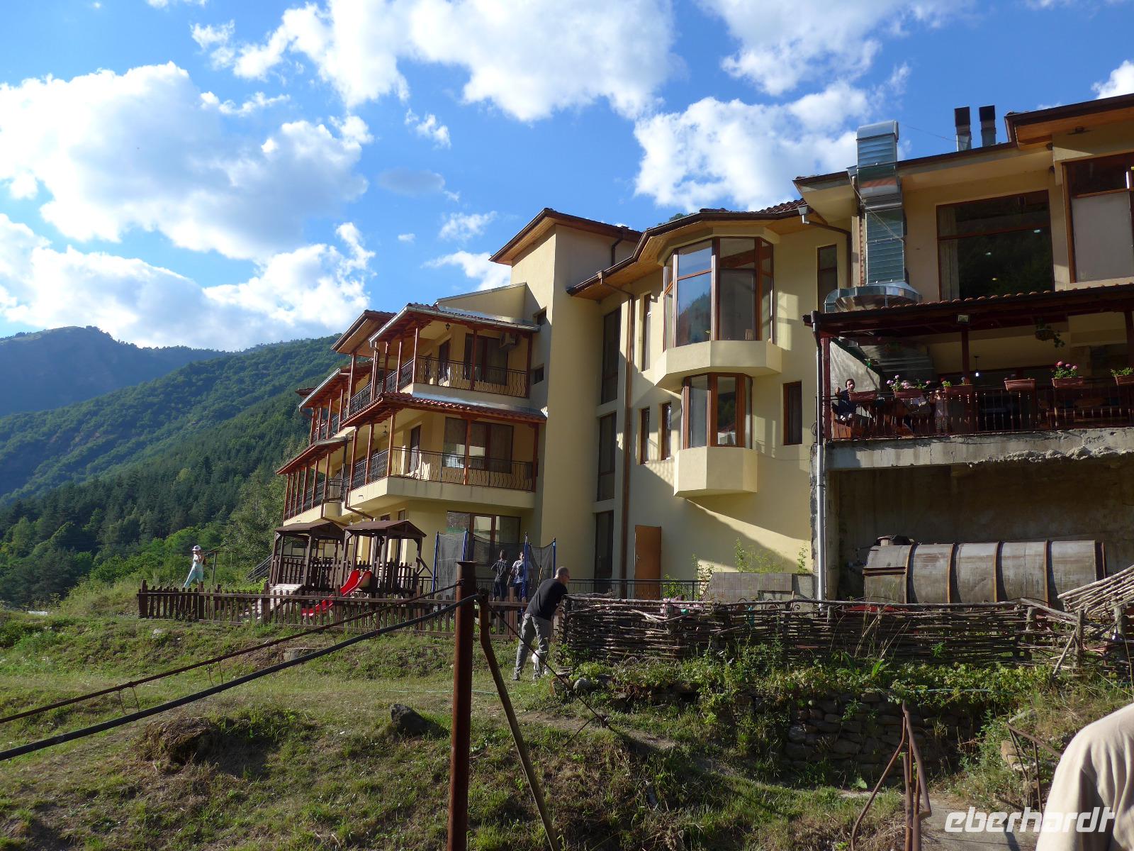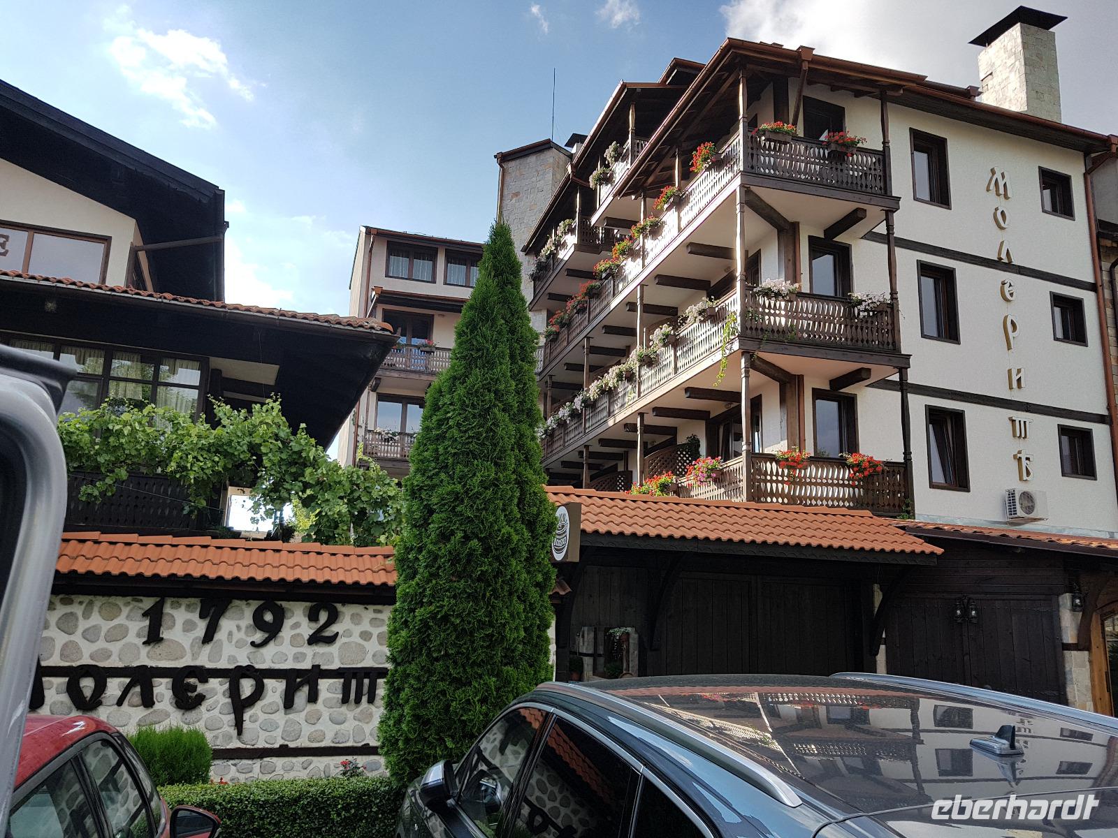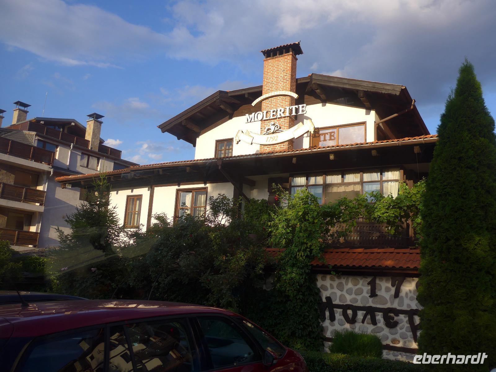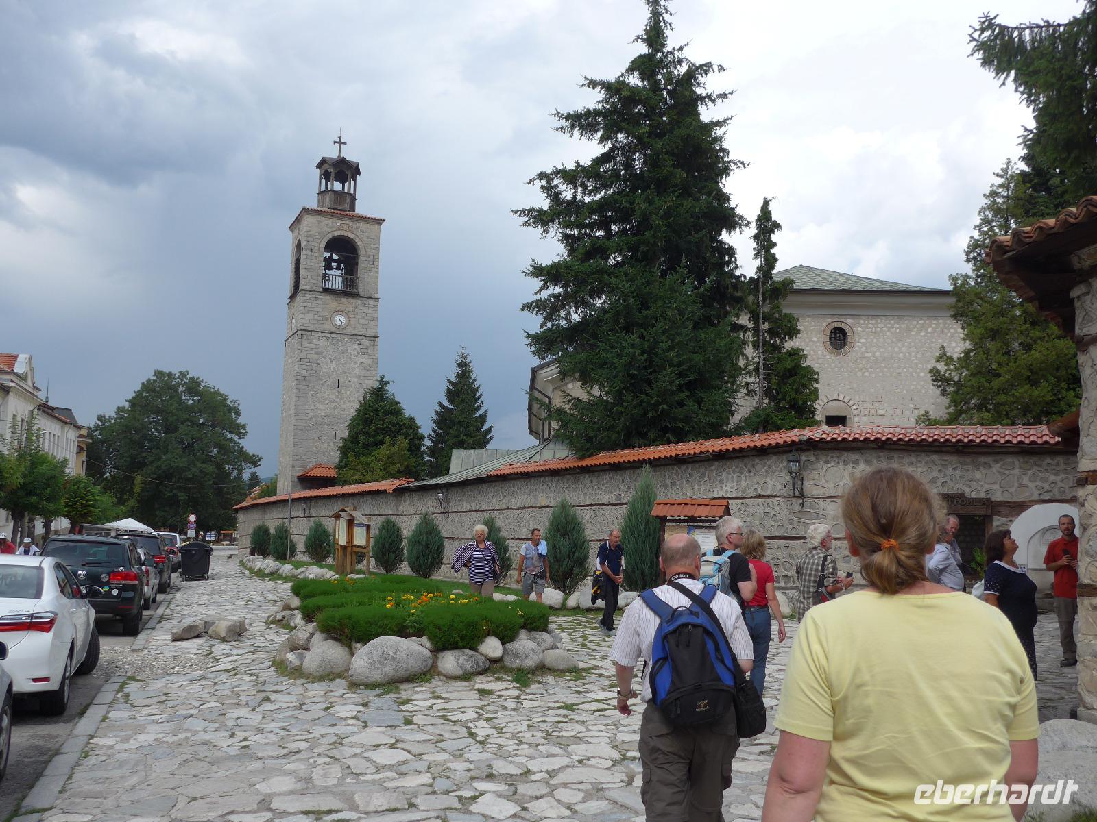 Der Bus brachte uns nach Bansko zurück und wer noch Lust hatte, brach mit Milen zu Fuß zu einem Stadtrundgang auf. Wir besuchten das Neofit Rilski Museum und erfuhren sehr vieles über die Zeit der Wiedergeburt in Bulgarien. Rilski machte sich um die Entwicklung des Schulwesens verdient und in seinem Geburtshaus ist ein sehr interessantes Museum über sein Leben eingerichtet. Gleich daneben steht die Dreifaltigkeitskirche, die wunderschön innen wieder restauriert wurde. Milen erzählte uns draußen die Geschichte und dann gingen wir auch hinein in die Kirche. Unser Stadtrundgang führte weiter über den Wiedergeburtsplatz mit dem gewaltigen Denkmal bis zum zentralen Platz mit dem Denkmal für Golovo Zarov. Noch ein Bummel durch die Fußgängerzone, ein paar Einkäufe und dann freuten wir uns schon auf das Abendessen im Hotel Molerite. Es gab als Hauptgericht "Schweinebraten nach deutscher Art" - eine Haxe, unglaublich, aber sehr lecker zubereitet. Danach mußten wir noch Koffer packen, denn es stand noch ein letzter Hotelwechsel unserer Reise an.
