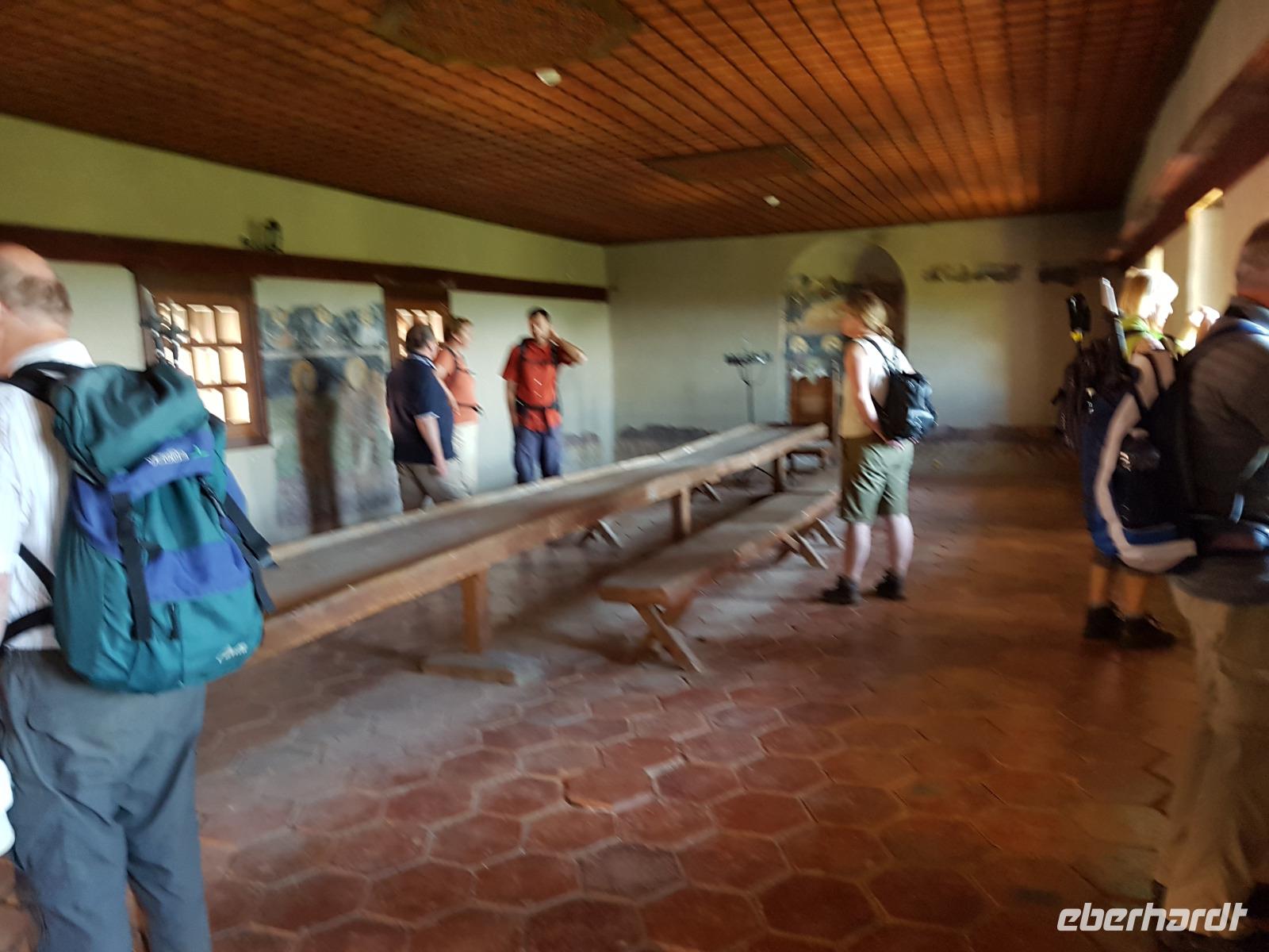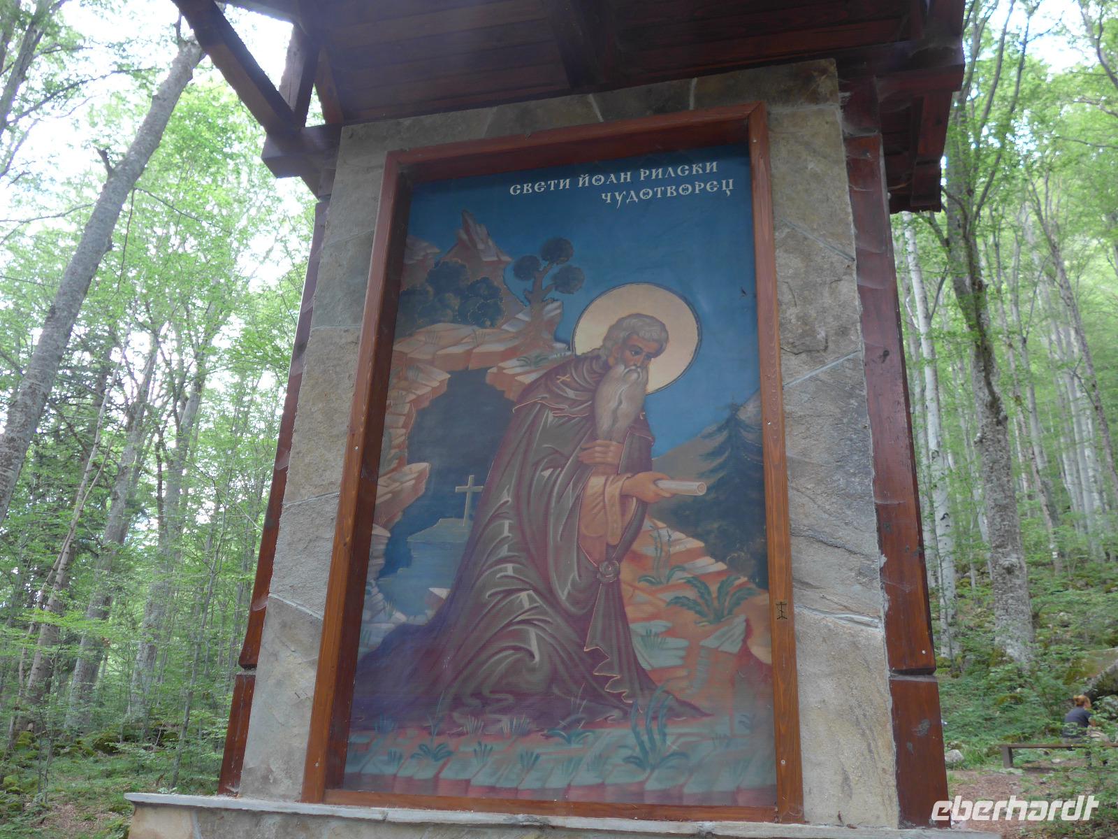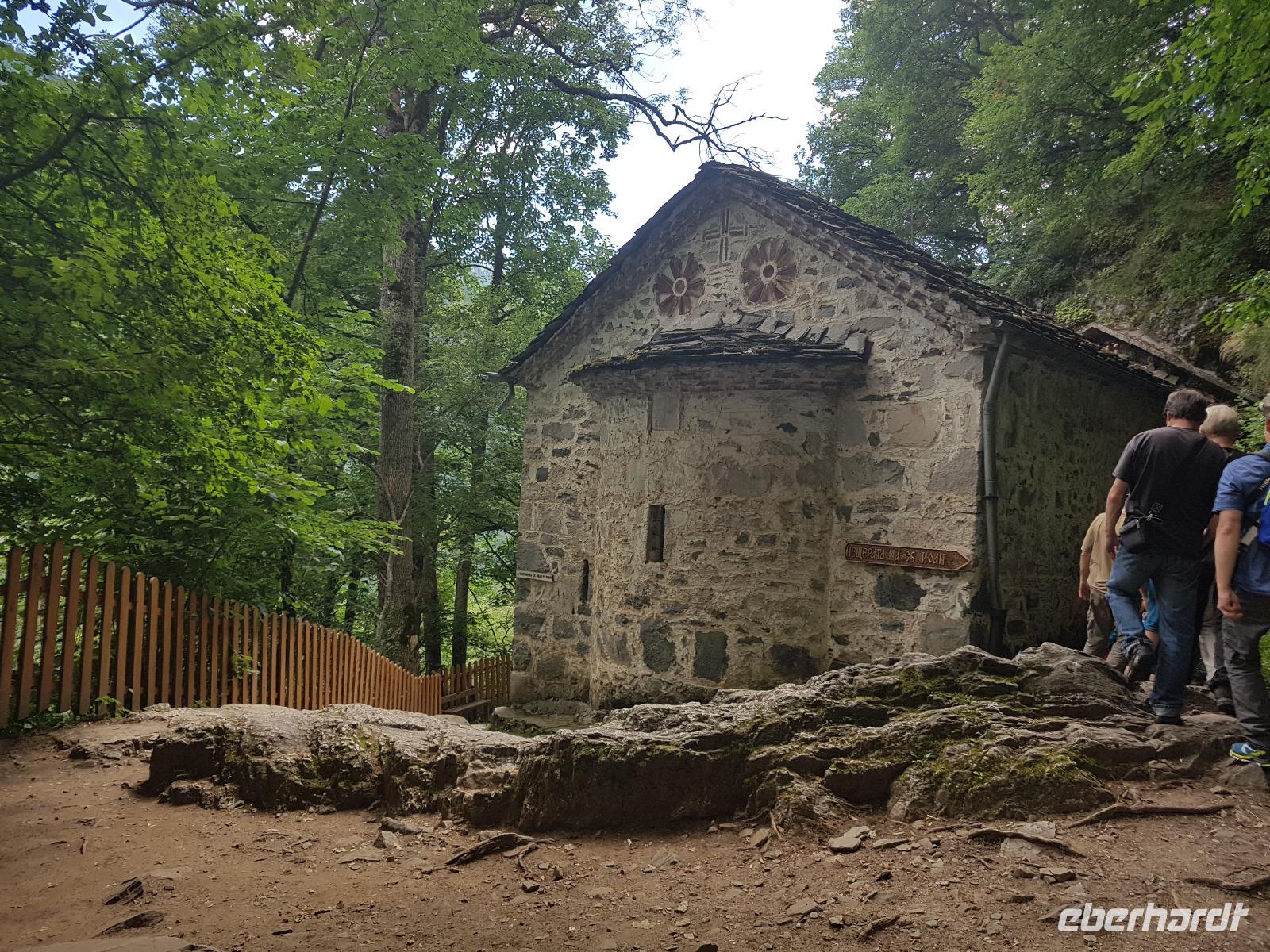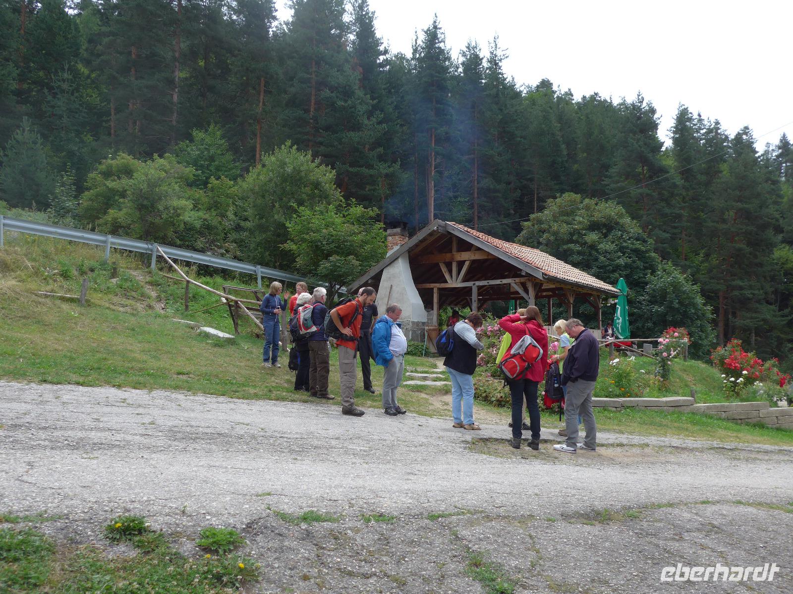 Nach einer Magenverstimmung vom Vortag waren nicht alle schon wieder voll leistungsfähig und so fuhren wir erst einmal zum Rila Kloster und machten eine umfangreiche Besichtigung unter Führung von Milen. Wir sahen den Innenhof, die Malereein an der Außenseite der Kirche, die Kirche innen und das Museum. Danach war Freizeit, um die Bäckerei oder/und die Waschmaschine zu besuchen. 12 Uhr brachte der Bus einige Gäste zurück ins Hotel Gorski Kut und die anderen bis zum Talende zur Kirilov Wiese. Wir suchten uns einen schönen Picknicktisch und nahmen dort unser Abschieds Picknick ein. Der Platz war umgeben von den hohen Gipfeln des Rilagebirges und gleich neben dem Tisch konnten wir frische Himbeeren ernten. Gut gestärkt begannen wir unsere letzte Wanderung talabwärts. Der Weg führte durch einen Buchenwald und unberührte Natur. Wir wanderten dann noch einmal steil bergan zur Einsiedelei von Johannes (Ivan) Rilski und besuchten die Kapelle, die Höhle - wo er gelebt hatte - und die heilige Quelle. Um durch den schmalen Höhlenausgang zu gelangen, mußten wir uns wie eine Schlange winden. Ein schöner Spaß ! Dann gingen wir noch weiter bergab an einer weiteren Kapelle mit Schule vorbei bis kurz vor das Rila Kloster. Dort erwartete uns Asen mit dem Bus und brachte uns zum Hotel zurück. Beim Abendessen waren wir alle wieder vereint.