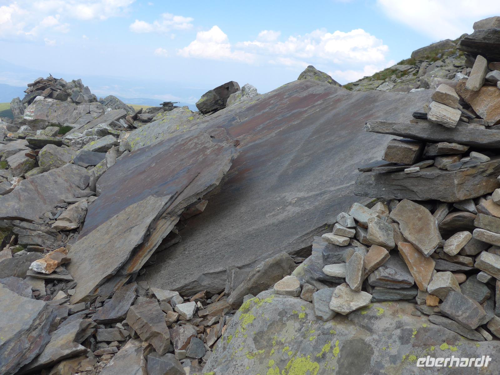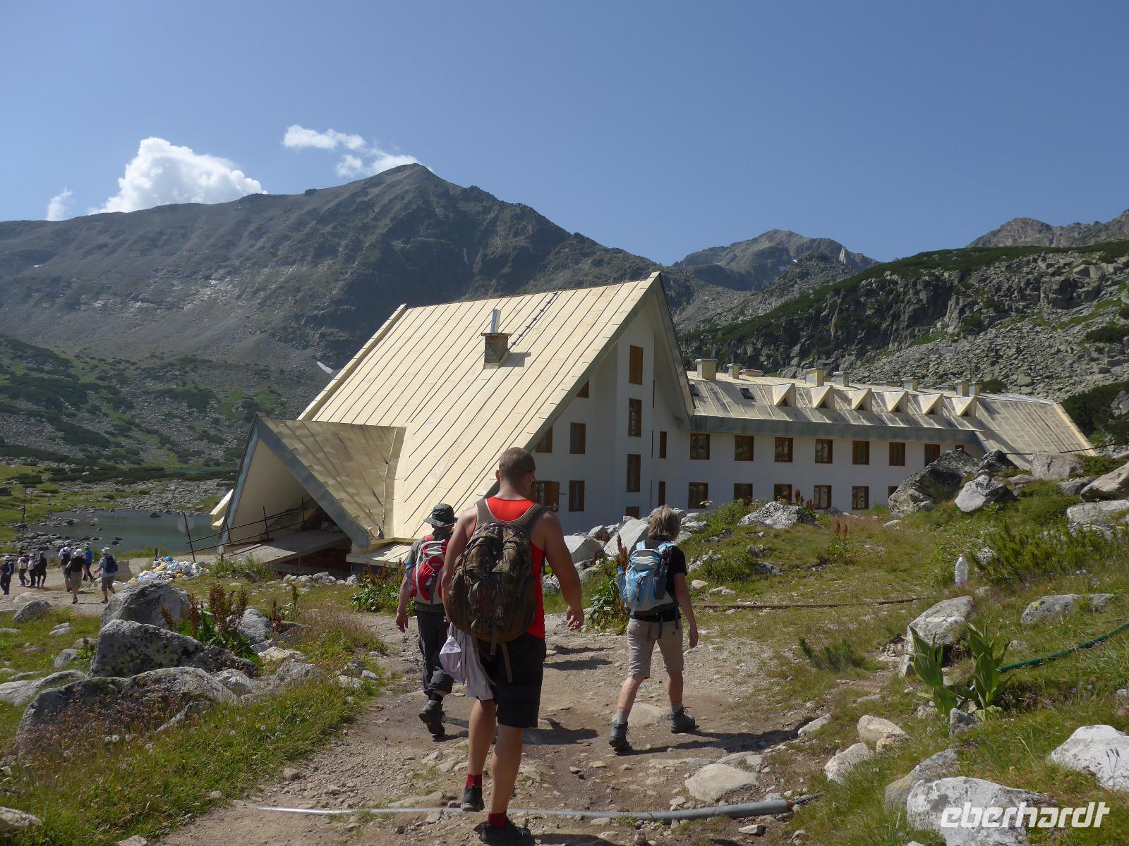 Eigentlich beginnt eine Wanderwoche mit einer Eingehtour zur Aklimatisation. Für unsere Tour brauchten wir aber den Lift auf den Jastrebets und der fuhr nur am Sonntag und war Mo/Di wegen Revision geschlossen. Also starteten wir mit der Besteigung des höchsten Berges auf dem Balkan. Von der oberen Liftstation wanderten wir zunächst fast eben hin bis zur Musala Hütte. Unterwegs erläuterte Milen uns den Weg anhand einer Karte. Nach einer Pause an der Musalahütte ging es immer in Abschnitten bergan in steinigem Gelände vorbei an kleineren und größeren Seen. Das letzte Stück des Aufstieges war sehr steil und rutschig und forderte unsere letzten Kraftreserven und die volle Aufmerksamkeit. Nach dreieinhalb Stunden erreichten alle den Gipfel und waren überglücklich. Es war Sonntag, die Sonne schien und es war warm. So wanderten mit uns auch viele Bulgaren auf den höchsten Berg ihres Landes. Unsere Gruppe nahm Aufstellung für ein Gipfel Gruppenfoto, dann holten wir uns den Gipfelstempel in der Berghütte und danach hieß es nur noch die Aussicht genießen und den Inhalt des Lunchpaketes zu verzehren. Gut gestärkt begannen wir den Abstieg auf gleichem Weg und der Lift brachte uns wieder hinunter ins Tal nach Borovets.