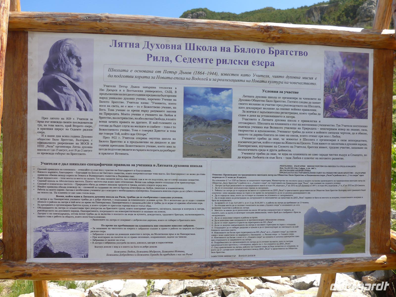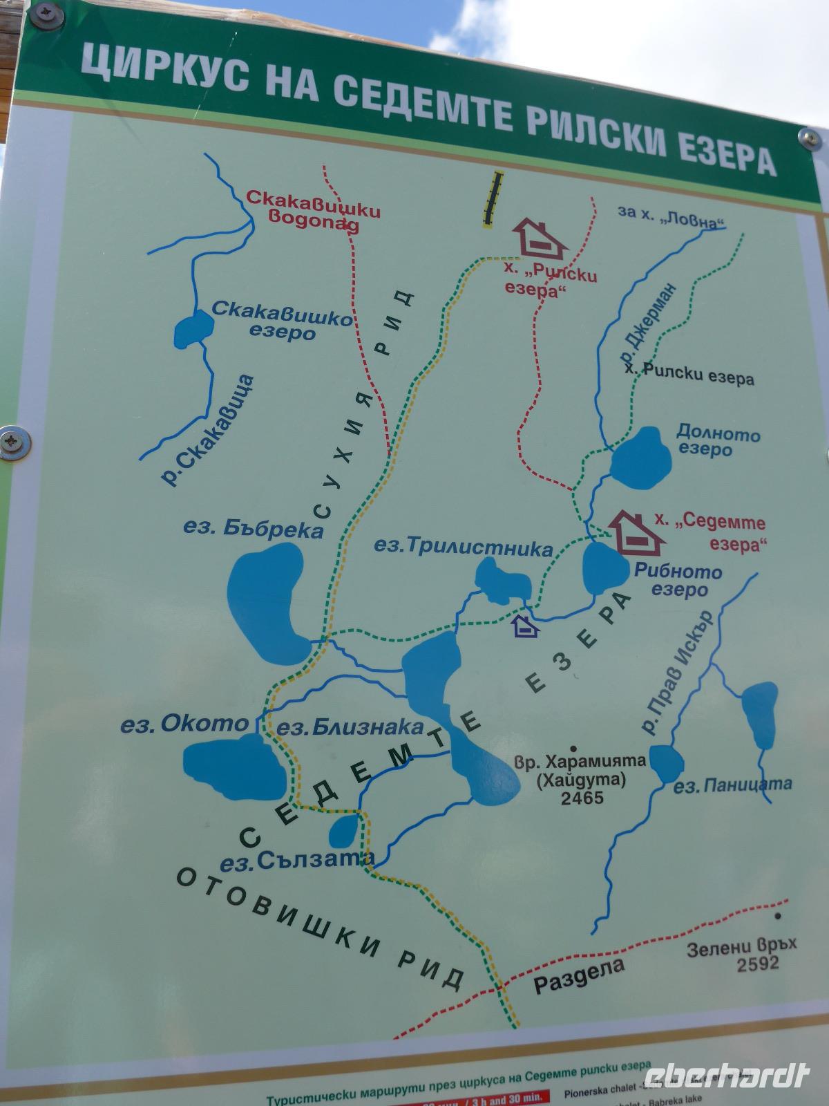 Ein weiterer Höhepunkt stand auf dem Programm. Wir nahmen die Lunchpakete vom Hotel und fuhren mit unserem Bus zur Berghütte Pionerska. Von dort ging ein Sessellift hinauf zur neuen 7 Seen Hütte. Nach einer WC Pause an der Hütte begann unsere Wanderung zunächst oberhalb des unteren Sees bis zum Fischsee und der gleichnamigen Hütte. Dort berichtete Milen über die Weisse Bruderschaft, deren Mitglieder sich alljährlich im August am Fischsee treffen. Weiter liefen wir zur Quelle, dann hinauf über den Dreiblattsee zum Zwillingssee und weiter zur "Niere". Auf einer Wiese abseits verspeisten wir unser Lunchpaket und dann stiegen wir weiter hinauf zum "Auge" und schließlich zur "Träne". Dank Milens geschickter Runde hatten wir alle 7 Rila Seen geschafft und von oben konnten wir die Hochebene gut erkennen, über die unser Rückweg zur Bergstation des Sessellifts führte. Auf dieser Hochebene waren Steinkreise gelegt, wo die Weisse Bruderschaft sich zu den rituellen Tänzen trifft.