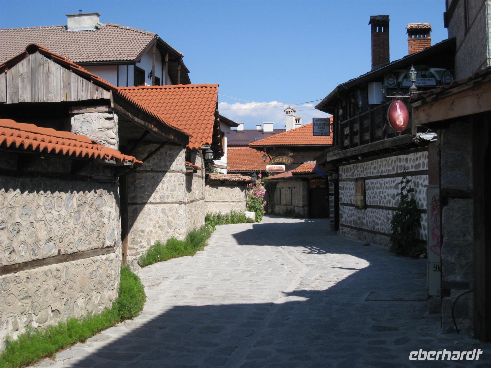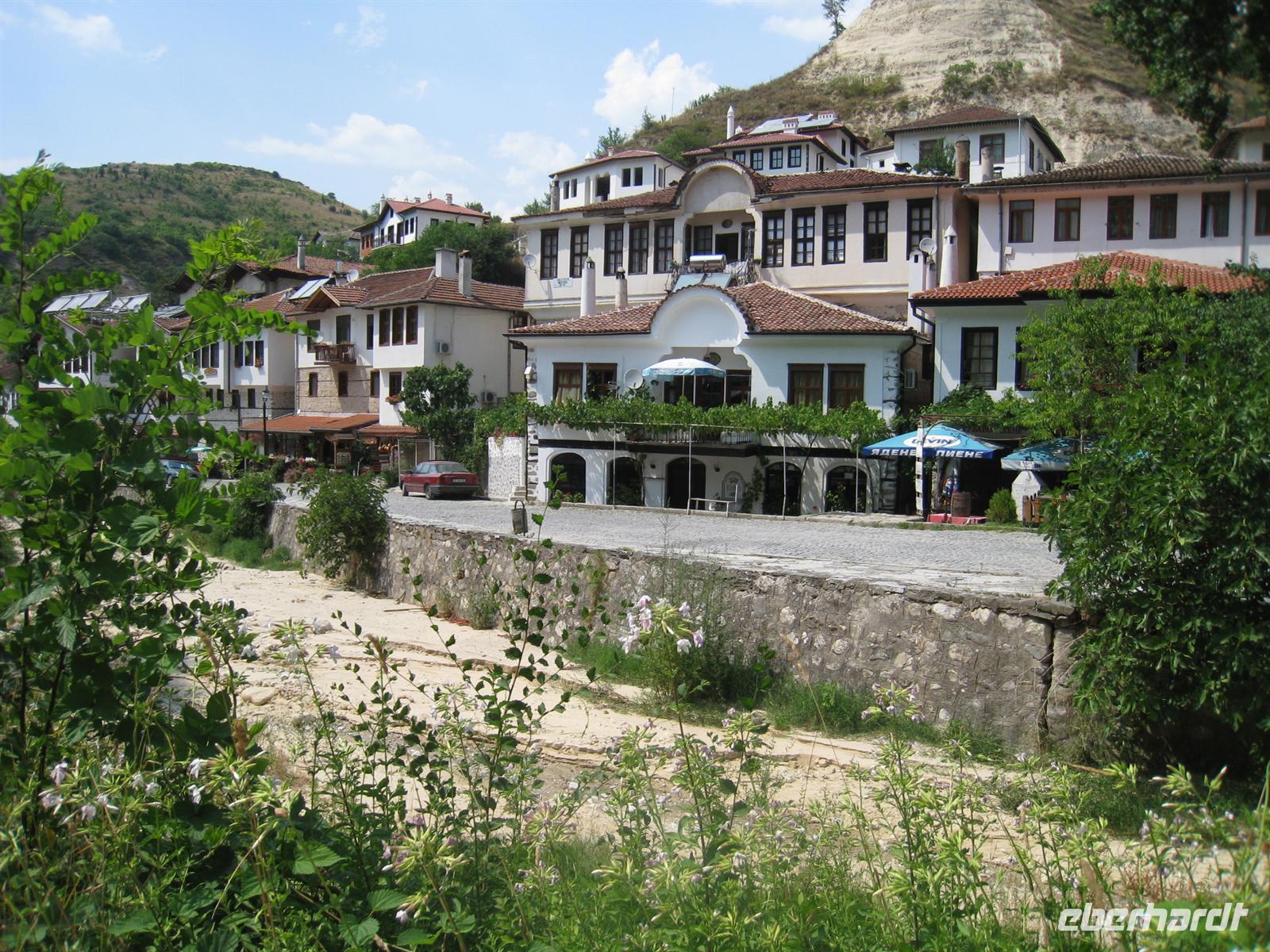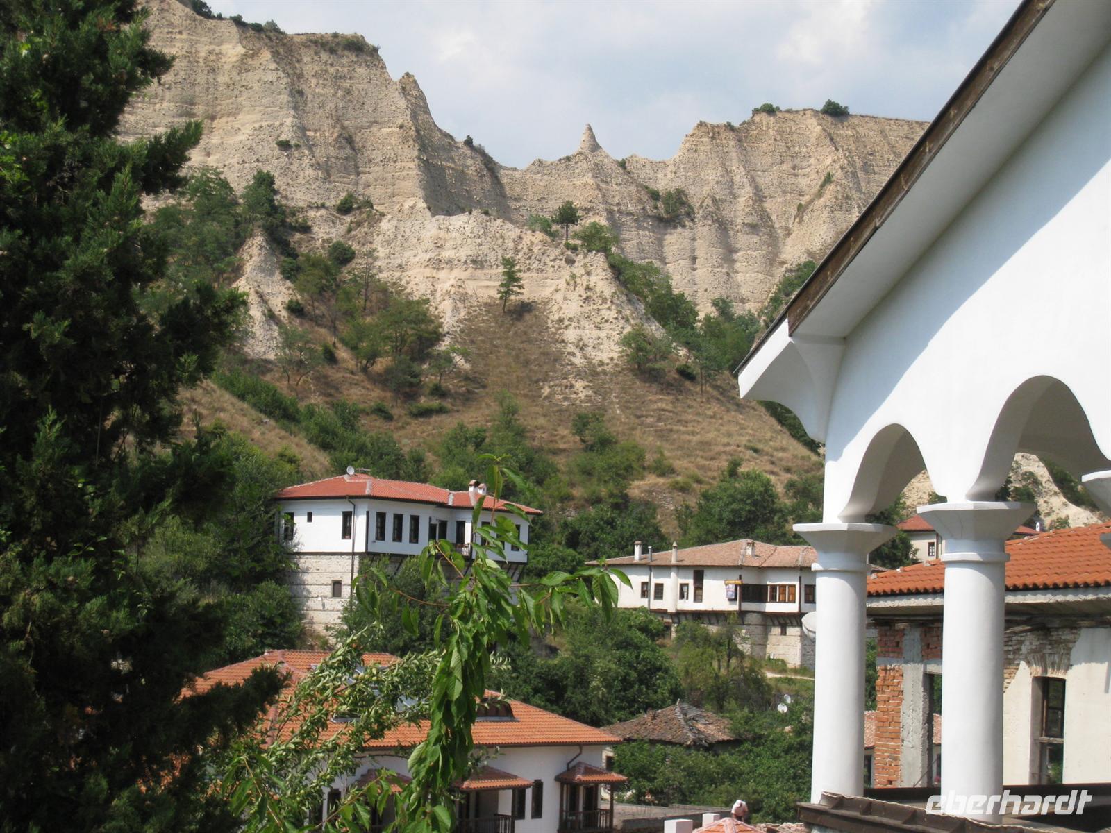 Über den Predel-Pass ging es in das Tal der Struma und weiter in das Dreiländereck Bulgariens mit Mazedonien und Griechenland. Unser Besuch galt dem Komplex der Hellseherin Baba Vanga in Rupite mit expressionistisch bemalter Kirche. Als wir weiter wollten, streikte der Bus, aber Abhilfe wurde schnell gefunden. Wir fanden dann Einlass und Unterkunft im Hotel beim Despoten Slaw in Melnik. Melnik ist mit nur 220 Einwohnern die kleinste Stadt Bulgariens und steht mit der faszinierenden Architektur unter Denkmalschutz. Allein schon die Lage Melniks, eingebettet in fantastische Gesteinsformationen, kann in den Bann ziehen. Wir bummelten durch den kleinen Ort unterhalb gelbleuchtender Sandsteinpyramiden. Vom Glanz zeugen heute noch original renovierte Häuser und von manchem Expansionsgedanken einige Investruinen. Unter den zahlreichen sehenswerten Gebäuden beeindruckte uns vor allem das Kordopulov-Haus. Es ist das größte bulgarische Haus aus der Zeit der Wiedergeburt. Wir besichtigten das Haus und seinen großen Weinkeller und genossen ein Glas des großblättrigen ("Gloßbrettrigen") Melniker Rebensaftes. Nur wenige Schritte vom Hause entfernt fanden wir noch einen Ausschank oberhalb der Stadt bei warmer Sommerluft...und auch das Abendessen auf der Terrasse war lecker und nicht ohne Wein und Rakia.