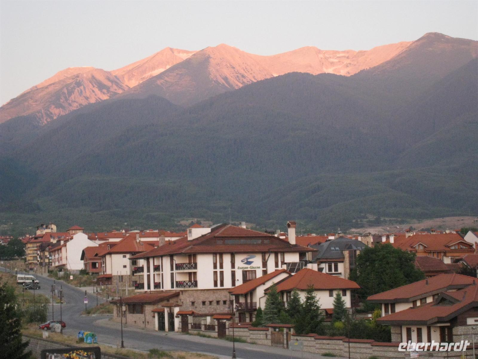 Die Halbtageswanderung führte uns vom Hotelkomplex Maljowica über die große Bärenwiese in das Maljowica-Tal. Schon bald sahen wir erstmals den stattlichen Gipfel der Maljowica, noch wolkenverhangen. Entlang eines rauschenden Baches ging es aufwärts und bald hatten wir die Baumgrenze erreicht. Nun zog uns der Gipfel (2729 m) vor uns immer mehr in seinen Bann. Als wir die gleichnamige Berghütte erreichten, stand der Gipfel vor blauem Himmel. Nach langer Ruhezeit stiegen wir wieder hinab und erschreckten eine Schlange, die sich im Sonnenschein räkelte. Wieder auf der Bärenwiese ließen wir uns bulgarische Spezialitäten wie Kawarma und Kebabgerichte munden. Auf unserem Weg nach Borovec legten wir eine Pause in Samokov ein, um über dem Markt zu bummeln und eine hübsche Moschee zu sehen. Dann ging es hinauf in den Ort Borovec, dessen Skipisten uns schon bei der Anfahrt grüßten. Der Ort lebt wohl doch mehr vom Wintersport und ist im Sommer eine Ansammlung großer Hotels, von Chalets und zwei Gassen halbrustikaler Geschäfte, Kneipen und Etablissements... Chance für individuelles Erkunden bis zum Morgengrauen?
