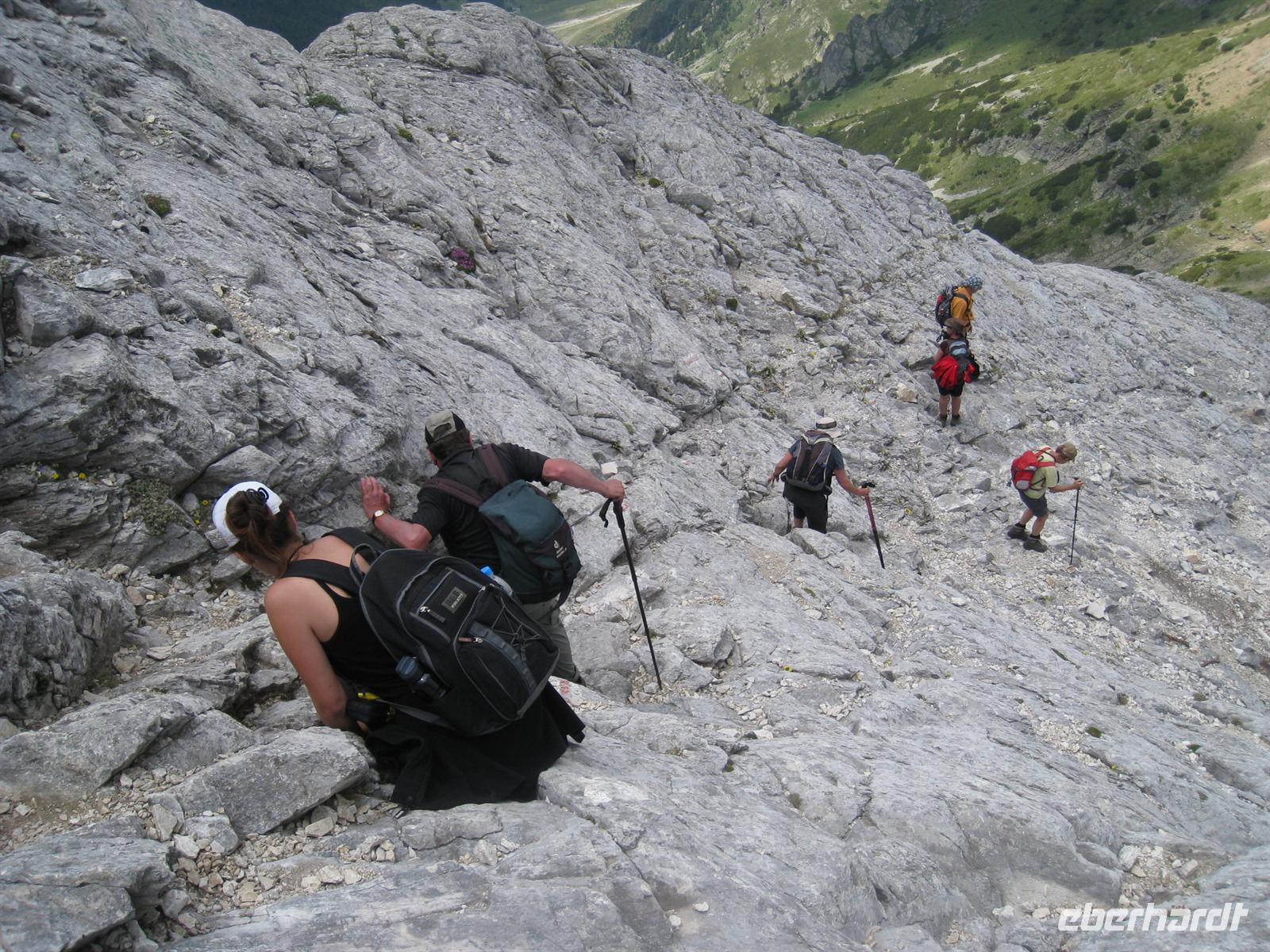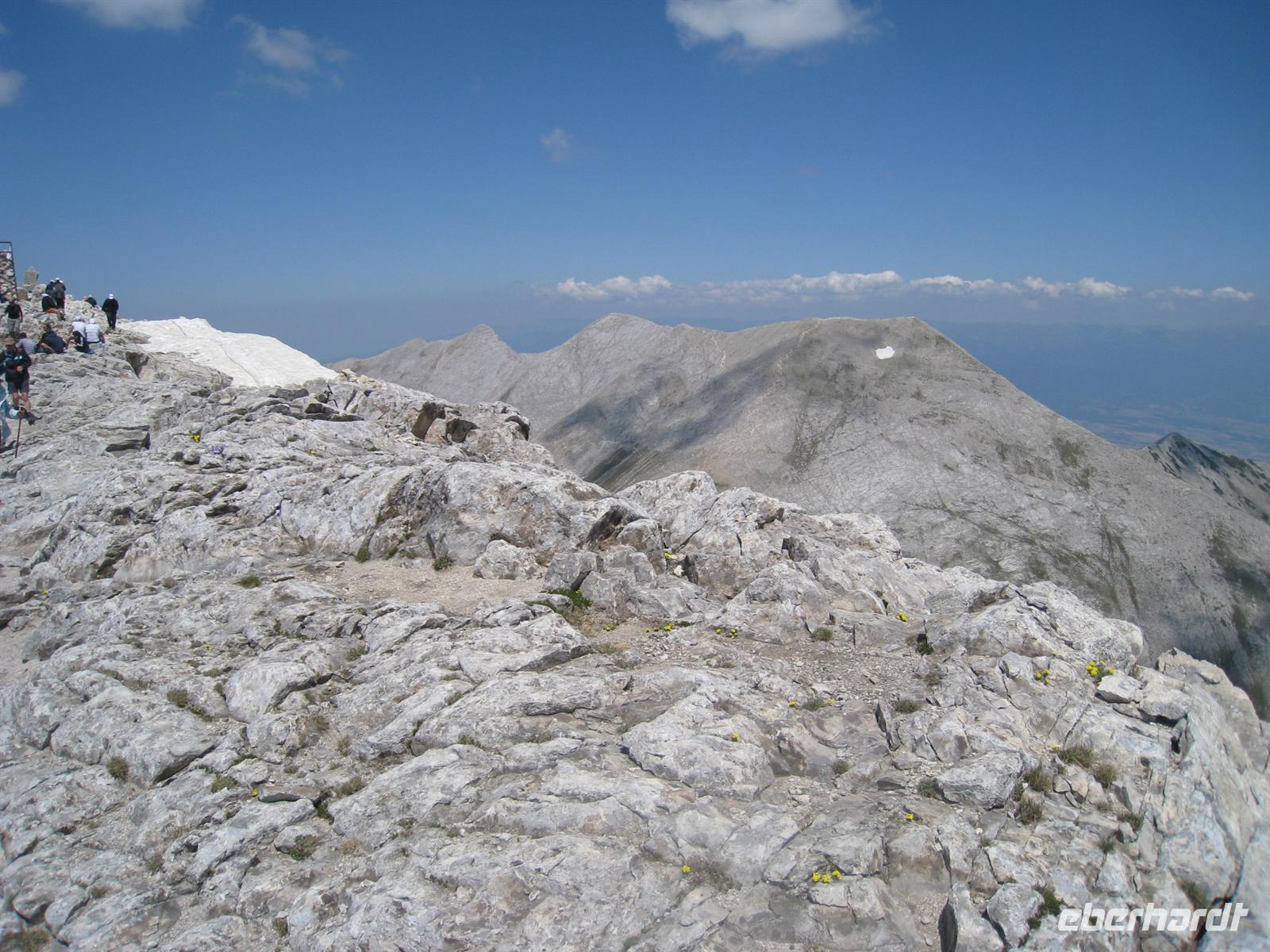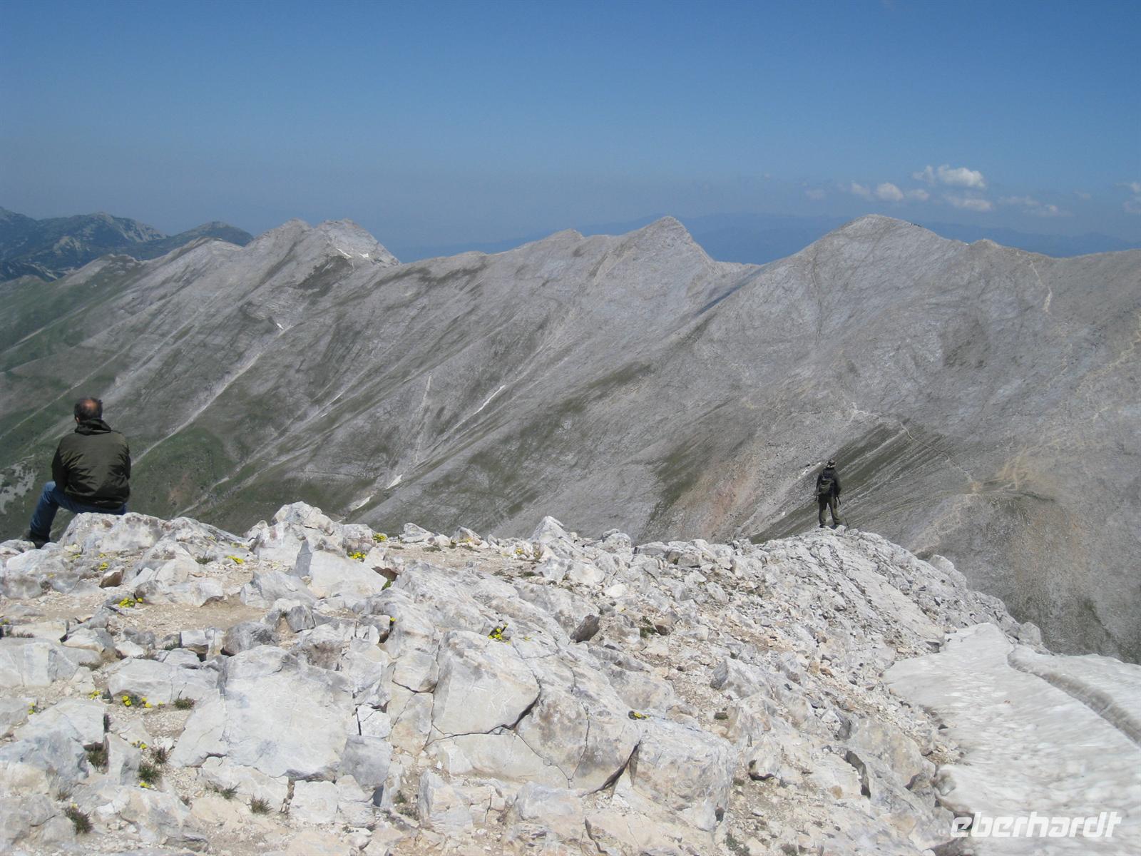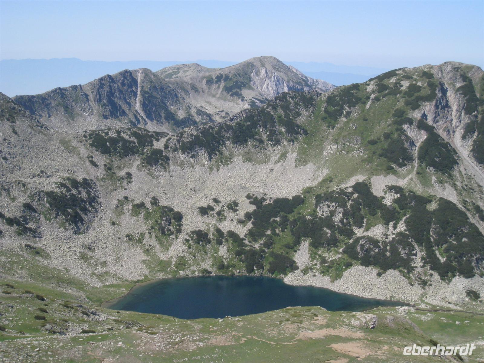 Wir hatten im Katalog eine spektakuläre Gipfellandschaft versprochen. Können wir dies halten? Stoiko brachte uns mit dem Kleinbus bis zur Vihren-Hütte in 1950 Meter Höhe. Hier begann der Aufstieg auf die Kuppel des Vihren. Nach zwei Stunden hatten wir die Passhöhe erreicht, von der wir in der Tiefe die Augen des Piringebirges, wunderschöne Seen, eingebettet in eine steinige Mondlandschaft, betrachteten. Tiefgrün schimmerten sie an diesem Tage. Vor uns lag nun die lange schräge Platte der Südwand des Vihren, die es in Serpentinen zu bezwingen galt. Zur sonntaglichen Mittagszeit um 12 Uhr wurde das Ziel erreicht. In der Ferne ahnten wir die Berge Griechenlands, unmittelbar 1000 Höhenmeter unter uns sahen wir die Vihren-Hütte, unseren heutigen Startpunkt. Nördlich dann die beeindruckende Galerie von Bergen jenseits der 2700 -Meter-Grenze mit dem Felsgrat Konceto (Pferdchen). Immer wieder sahen wir Wanderer als einsame Bezwinger dieses spektakulären Weges. Aber, wie werden wir selbst wohl aus der Ferne ausgesehen haben, als wir über den Nord-Ost-Grat nach unten stiegen? Eine sehr sportliche, fast alpinistische Leistung brachte uns durch das Kazana-Kar zur Banderica -Hütte, wo ein Pirinsko und der Bus wartete.