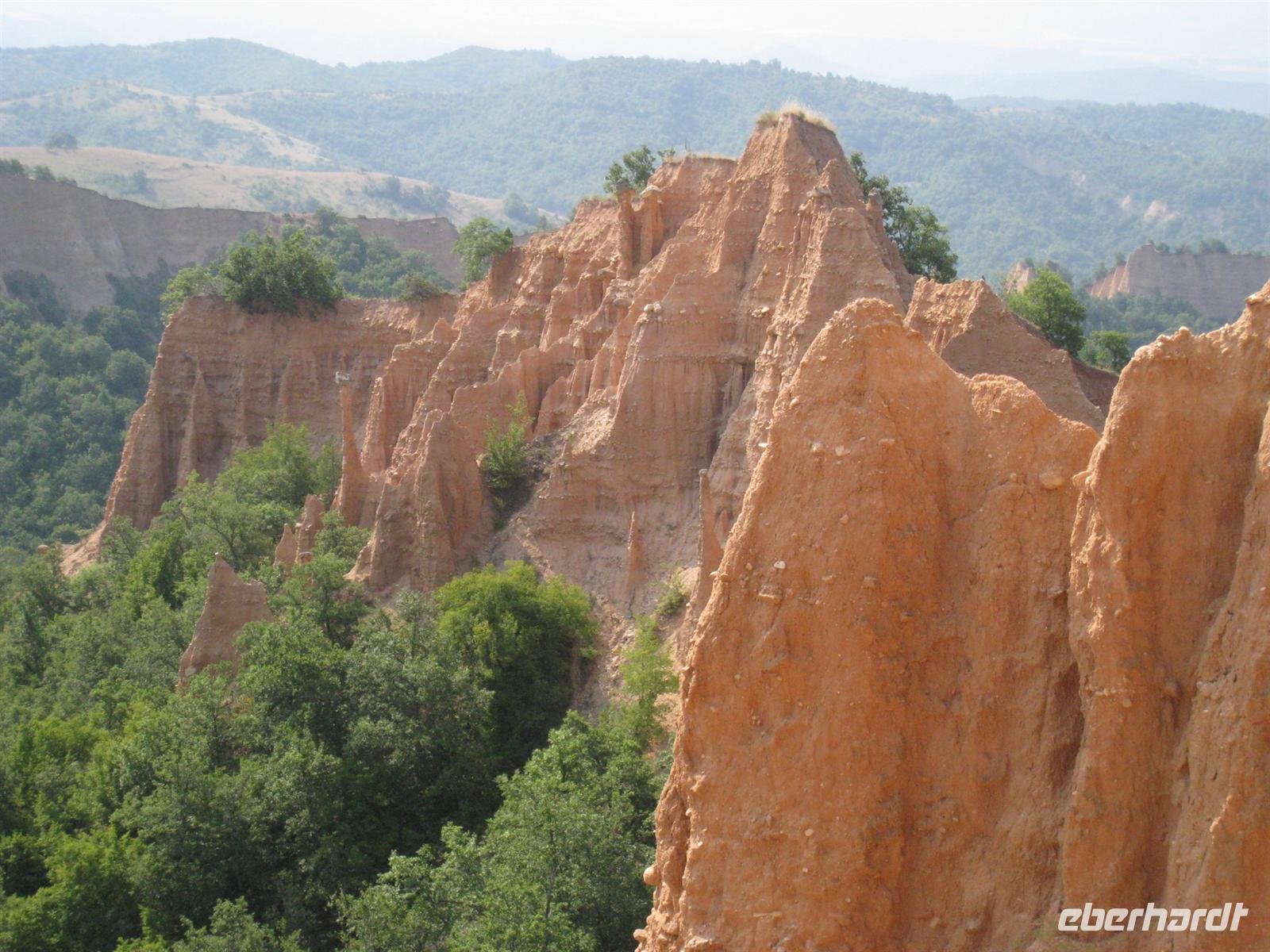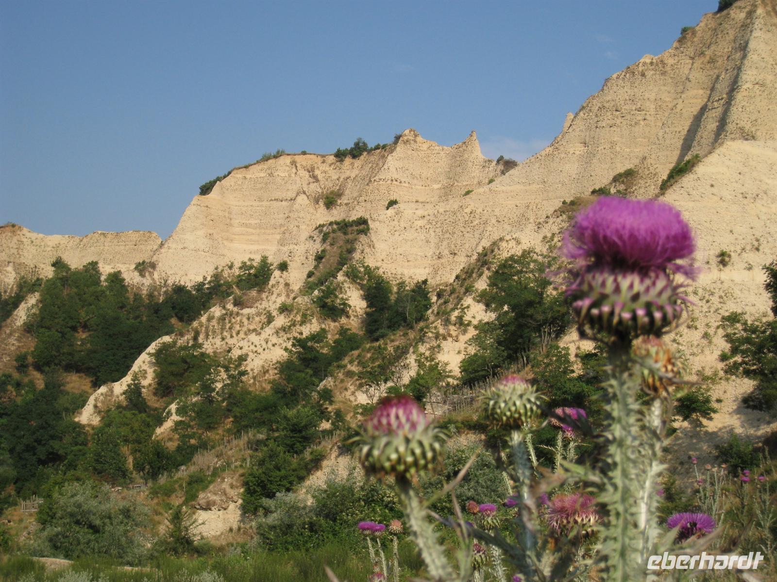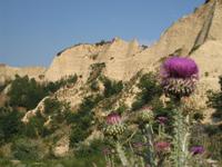 Am Vormittag wurde das Gepäck bereits verpackt und wir starteten zu einer reizvollen Wanderung durch die Sandsteinfelsen vorbei an den Erdpyramiden von Melnik. Durch trockene Bachläufe, vorbei an mannshohen Disteln ging es leicht aufwärts. Von einem Bergrücken blickten wir zunächst zurück, wo wir die letzten Häuser von Melnik erkennen konnten und dann in Richtung Roshenkloster. Unter uns mannigfaltige Nadeln und kleine Pyramiden aus Sandstein, die manchen an ähnliche Formationen in Utah oder Südtirol erinnerten. Abseits dörflichen Lebens dann das Roshenkloster. Der Ursprung des Klosters liegt bereits im 13. Jahrhundert. Das grob gehauene Holz und die Schatten spendenden Weinreben geben dem Klosterhof eine gemütliche Atmosphäre, die auch uns gefangen nahm. Wir besichtigten den Innenhof des Klosters und die Kirche Geburt der Heiligen Jungfrau mit Fresken aus dem Jahre 1730 und wertvollen Ikonen. Am Ausgang wartete bereits Stoiko, der uns über Sandanski mit seinem Spartakus-Denkmal zu einem Grillrestaurant an der Sofia und Griechenland verbindenden Straße brachte. Bald war dann auch unser Hotel-Hüttenkomplex im Tal des Rilabaches erreicht. Nach dem Abendessen starteten wir mit dem Bus zum Rilakloster. Der erste Eindruck beim Ankommen und Betreten des Innenhofes wird sich tief einprägen: einer der weltgrößten othodoxen Klosterkomplexe, hinter dem sich mächtig die Berge der Maljovica erheben. Bei einem Becher Wein, direkt am hinteren Tor des Klosters getrunken, ließen wir die abendliche Stille in den Bergen einziehen.