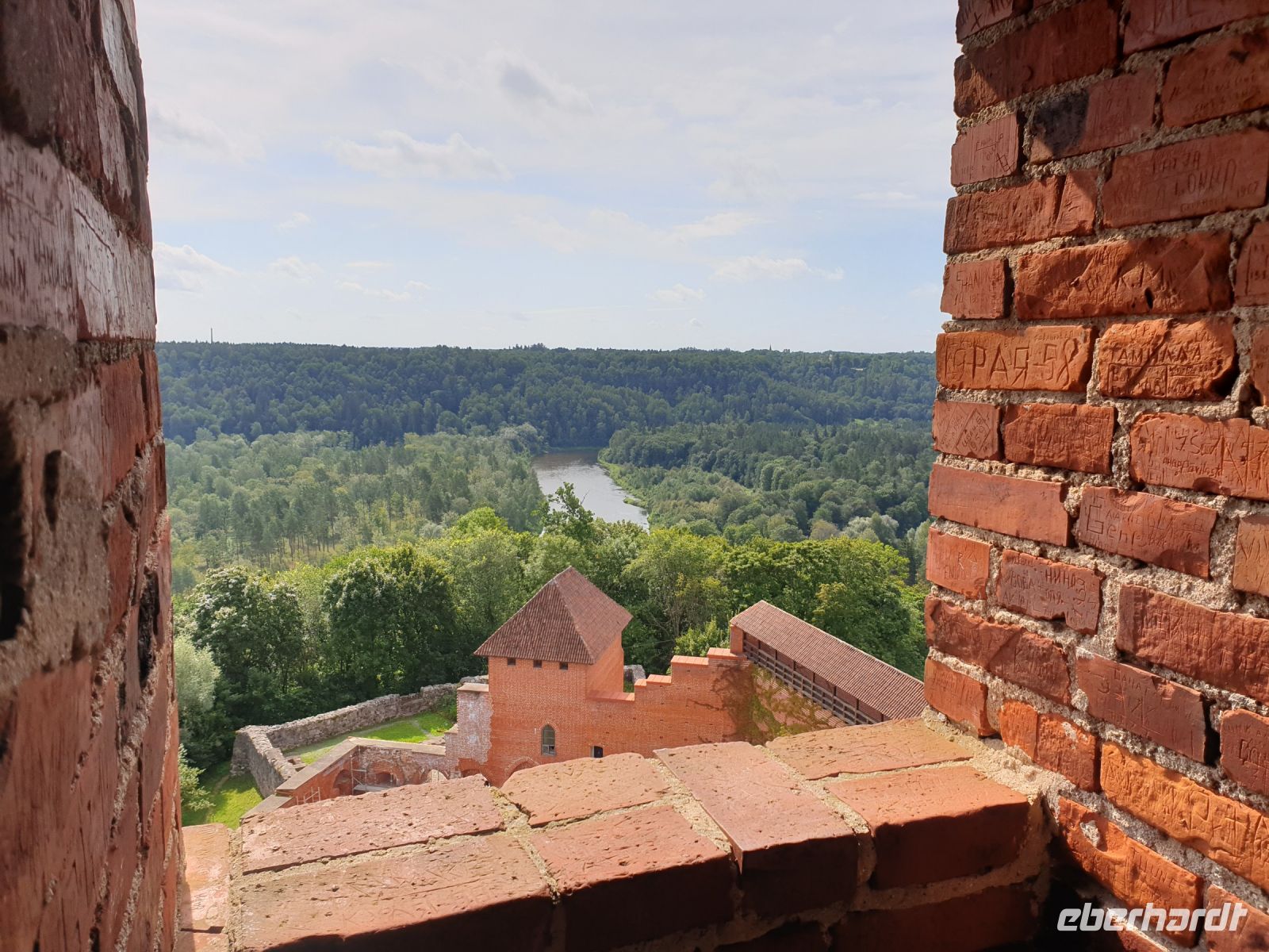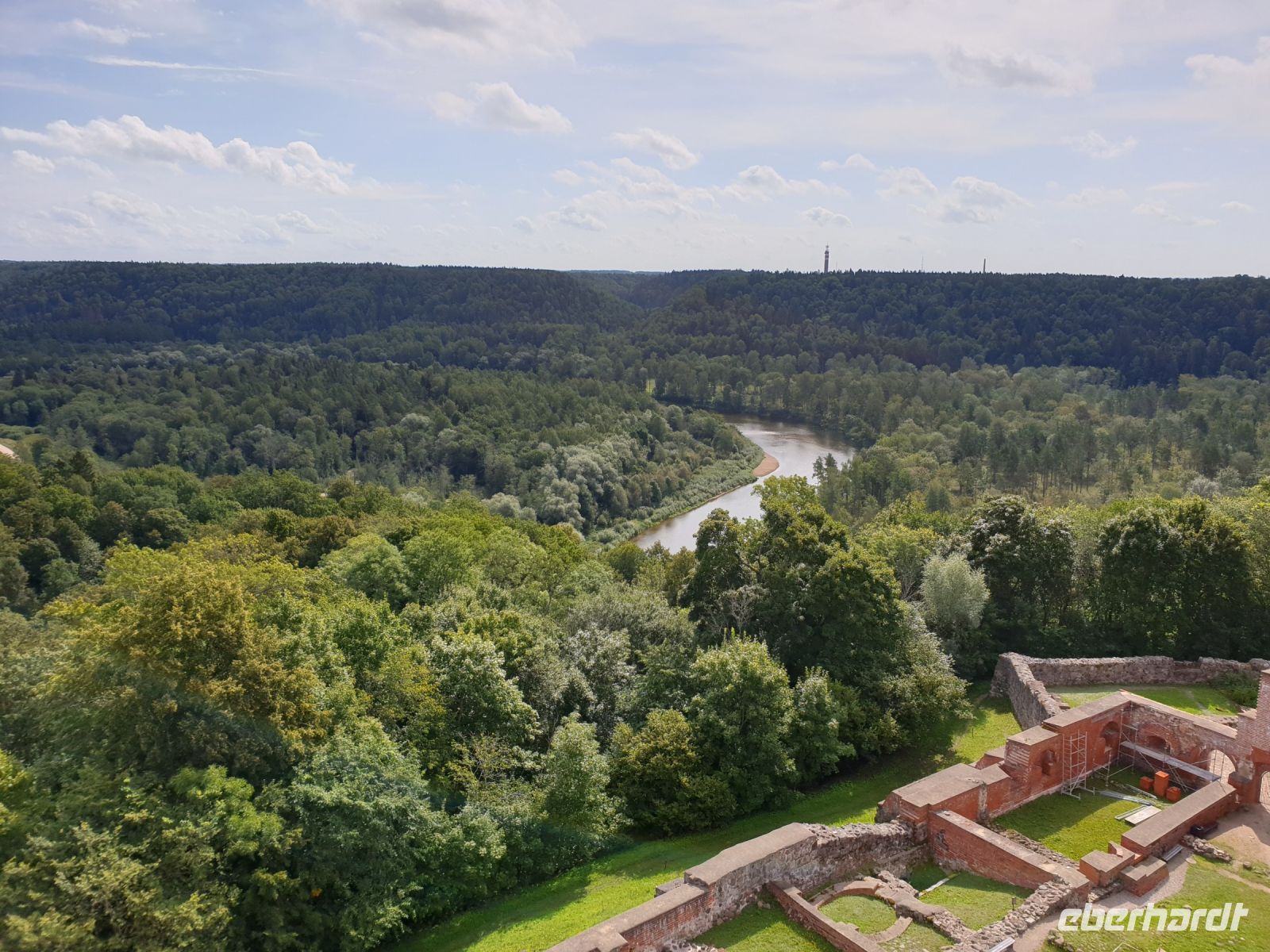 Bekannte Sigulda. Wir besuchen die nahegelegene Burg Turaida mit ihrem schönen Skulpturenpark, die Fußgänger genießen den Blick vom alten Wehrturm auf die Gauja.