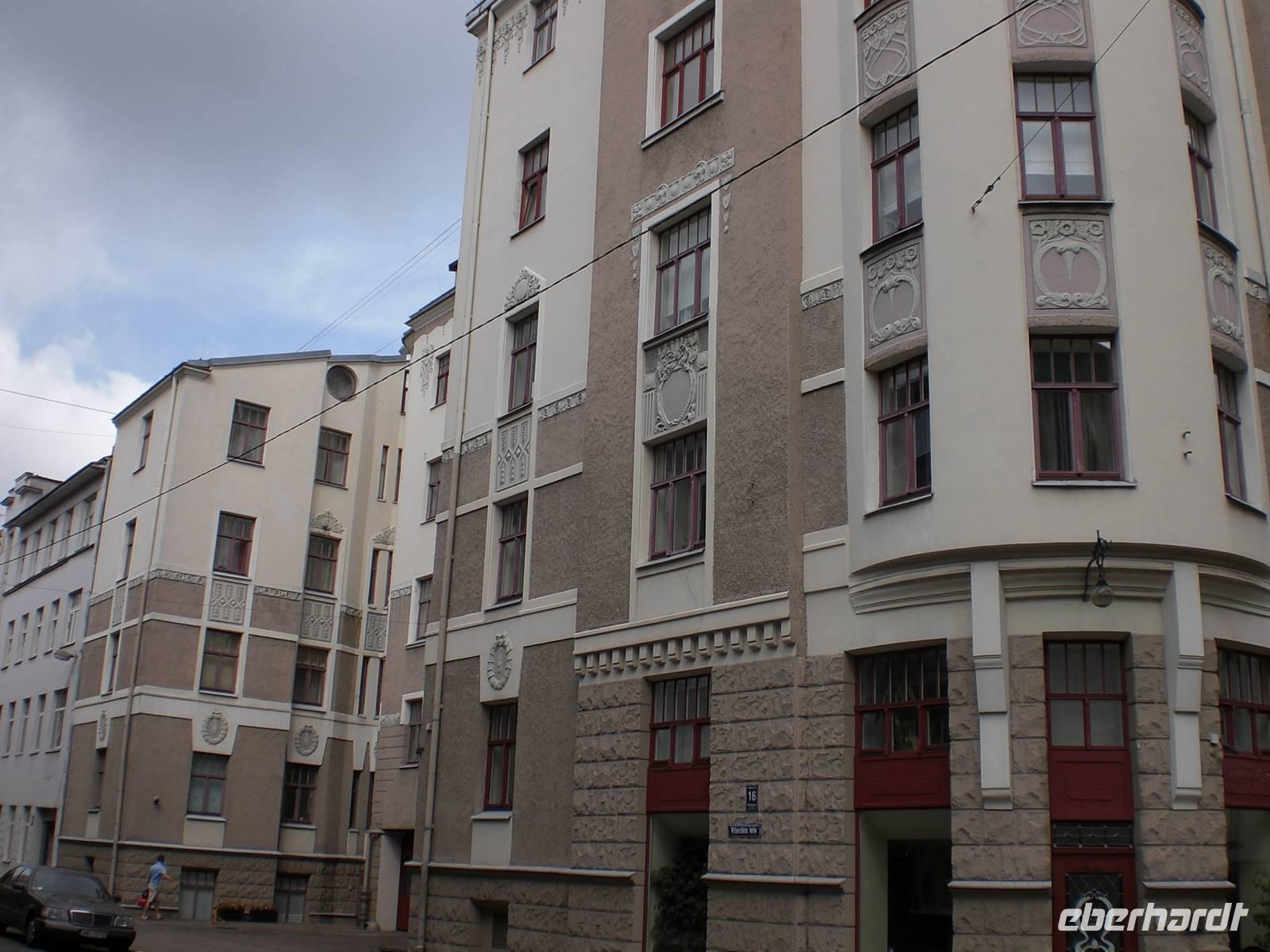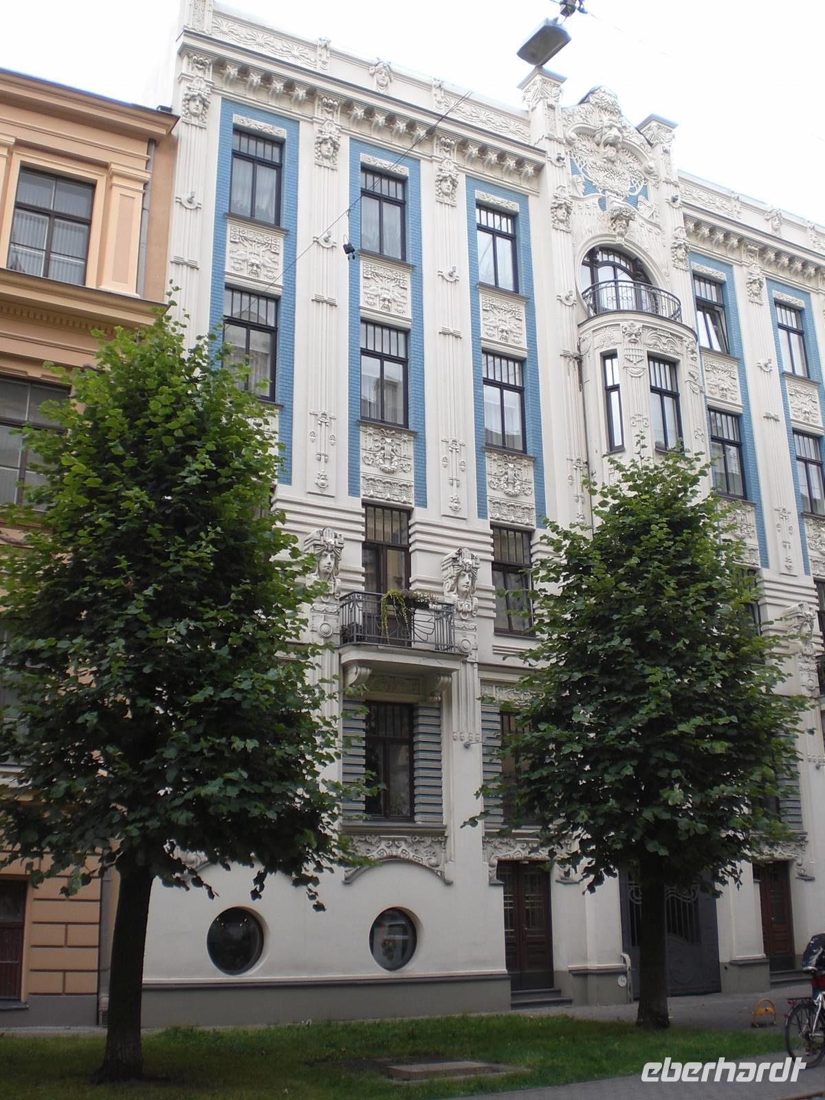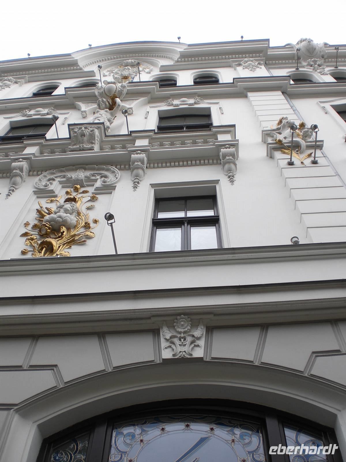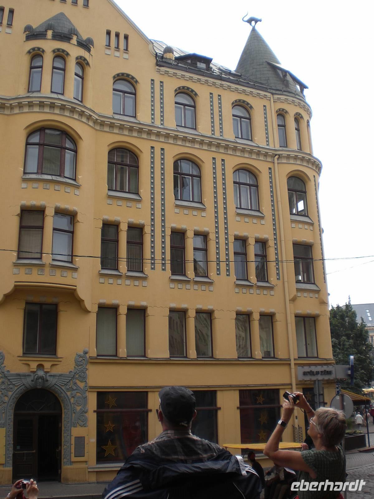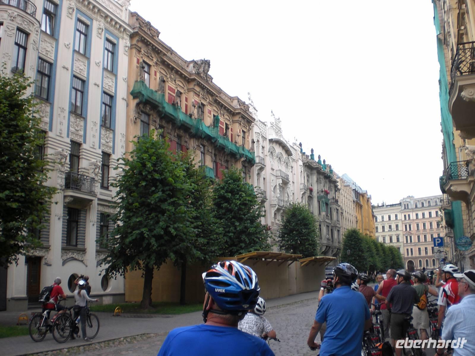 Zum Nachmittag traffen wir uns alle wieder und diesmal ging es mit den Rädern zum Jugendstilviertel - und das bei sonnigem Wetter, denn der Regen hatte aufgehört. Diese reich verzierten Häuser waren sehr beeindruckend und boten uns viele Fotomotive. Doch auch hier überraschte uns unsere Reisebegleitung wieder.