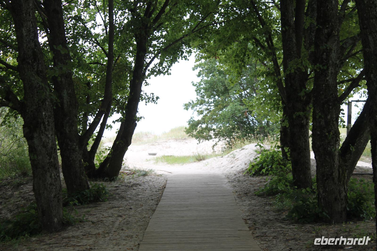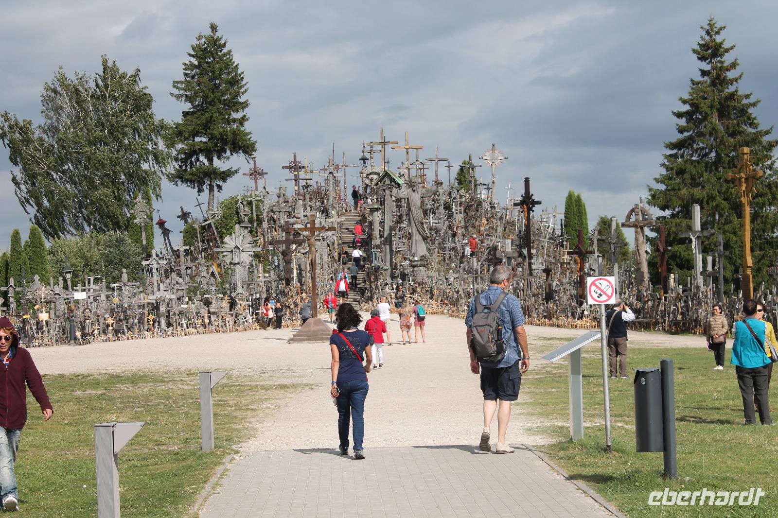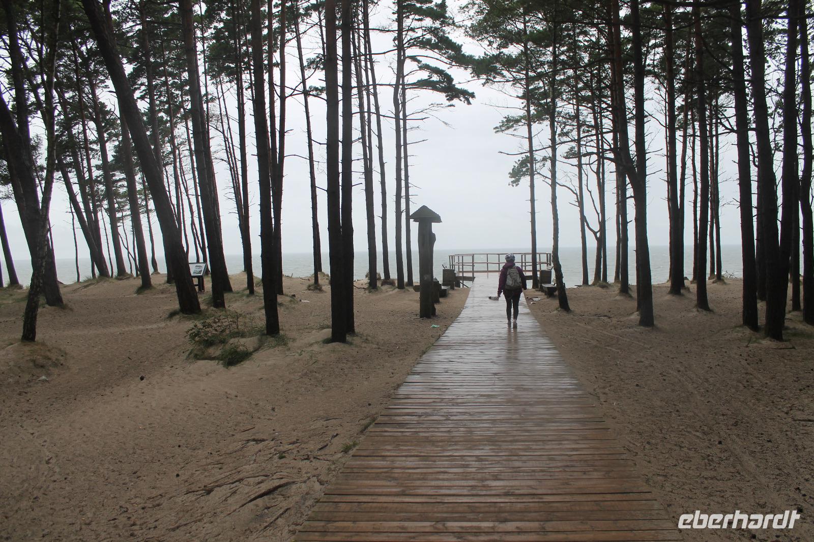 Trotz Nieselregen schwangen wir uns nach dem Frühstück auf die Räder und fuhren durch Klaipeda in Richtung Palanga. Am Stadtrand grenzt Klaipeda an einen Wald, den wir auf einem herrlichen Radweg durchquerten. Leider wurde das Wetter nicht wirklich besser und so machte der Besuch der 'Holländischen Mütze' nur halb so viel Freude. Diese 'Mütze' ist eine Steilküste, mit wunderbarem Blick auf die raue Ostsee. Immer weiter ging es durch das nasse Grün, bis zum Stadtpark von Palanga. Hier trafen wir endlich beim Bernsteinmuseum ein und entkamen so einem starken Regenschauer. Den Mittag verbrachten wir auf der Fußgängerpromenade von Palanga und machten das Beste aus dem Wetter. Die Busfahrt verlief ganz ruhig - so ein Wetter macht einen müde. Als unsere Reiseleiterin dann noch das Märchen der Natterkönigin vorlas, fielen bei manchen die Luken zu. Spätestens beim Berg der Kreuze waren alle wieder wach. Dieser einzigartige und etwas mystische Ort beherbergt mehr als 1500 große, und unzählige kleine Kreuze. Einheimische bringen die Kreuze, um um etwas zu bitten, sich für etwas zu bedanken oder um jemandem zu gedenken. Im Anschluss war es nicht mehr weit bis zur lettischen Grenze. Wir hörten abschließend litauische Volksmusik und plötzlich sahen wir die Landschaft mit ganz anderen Augen.