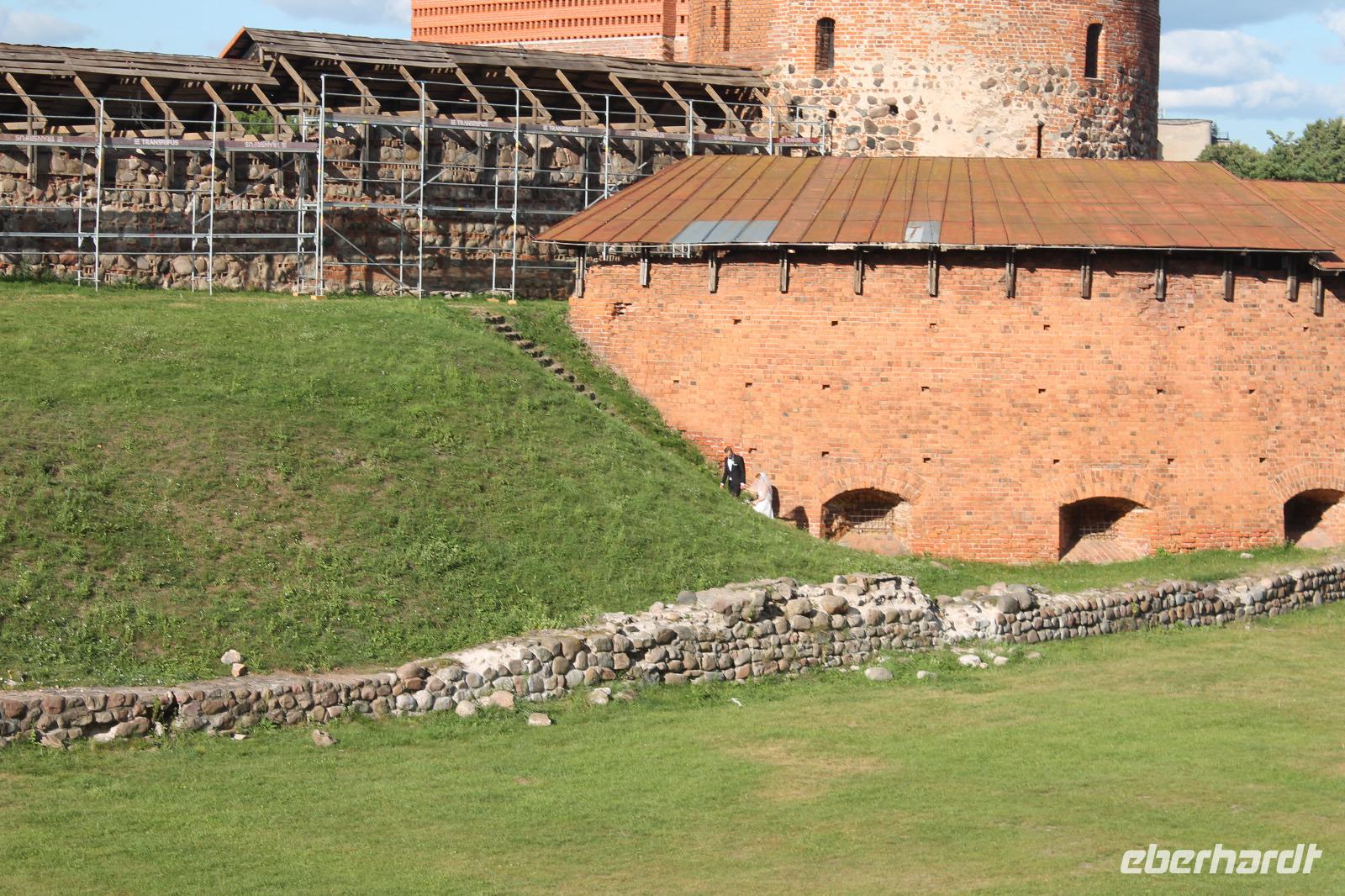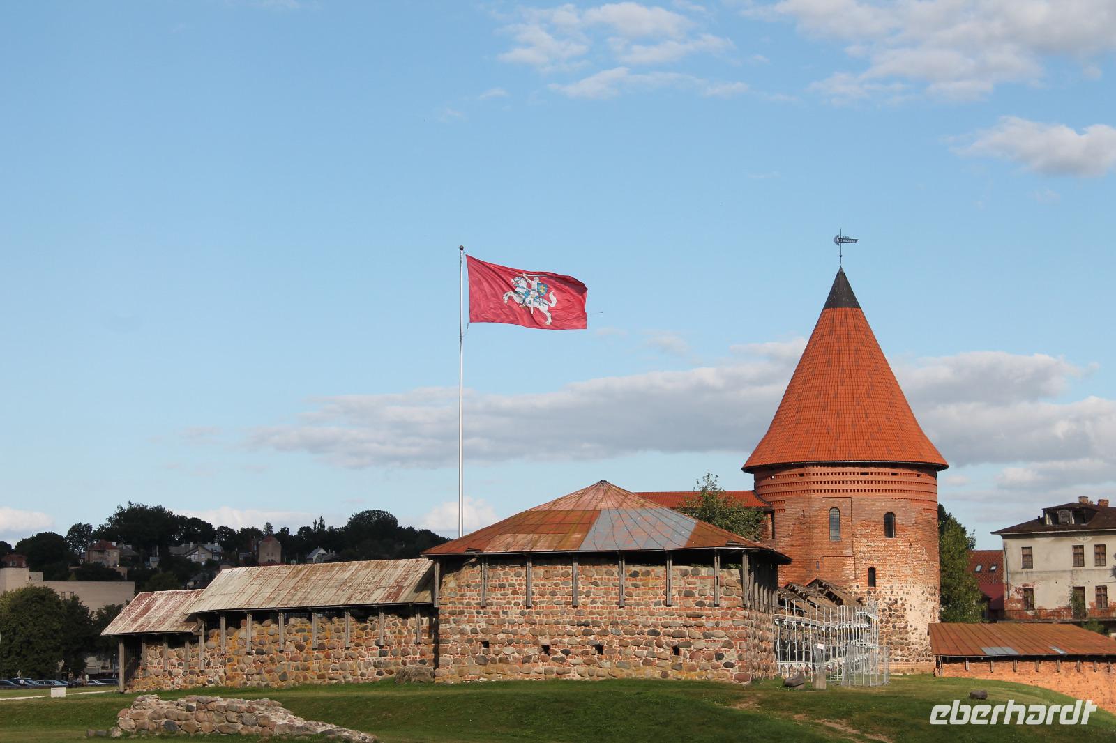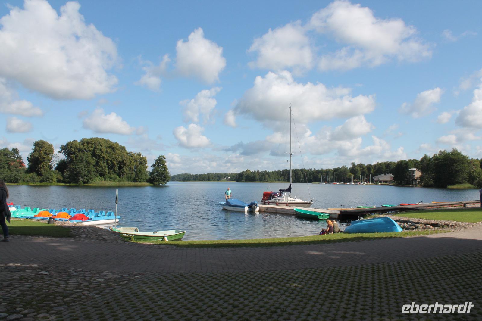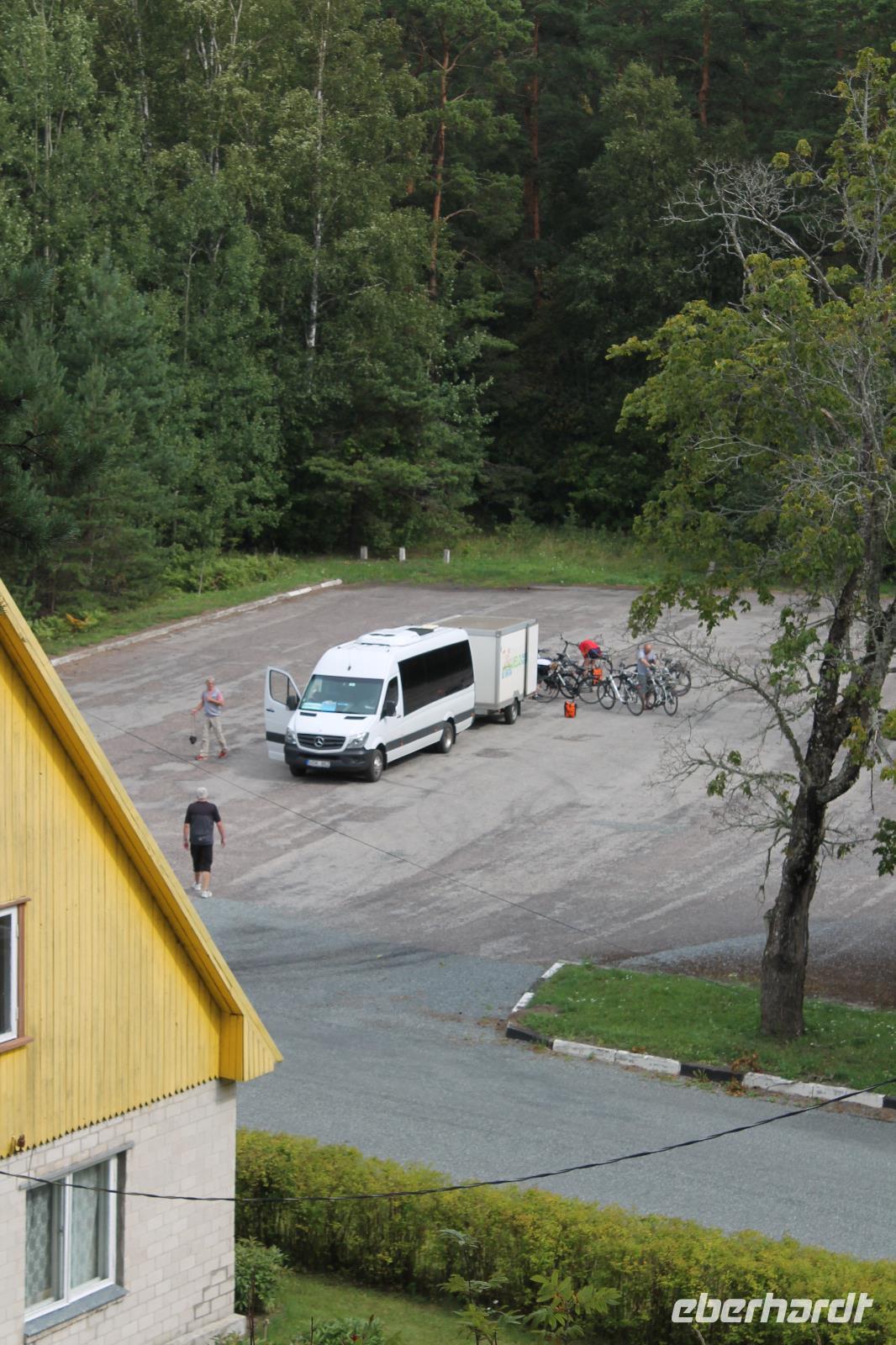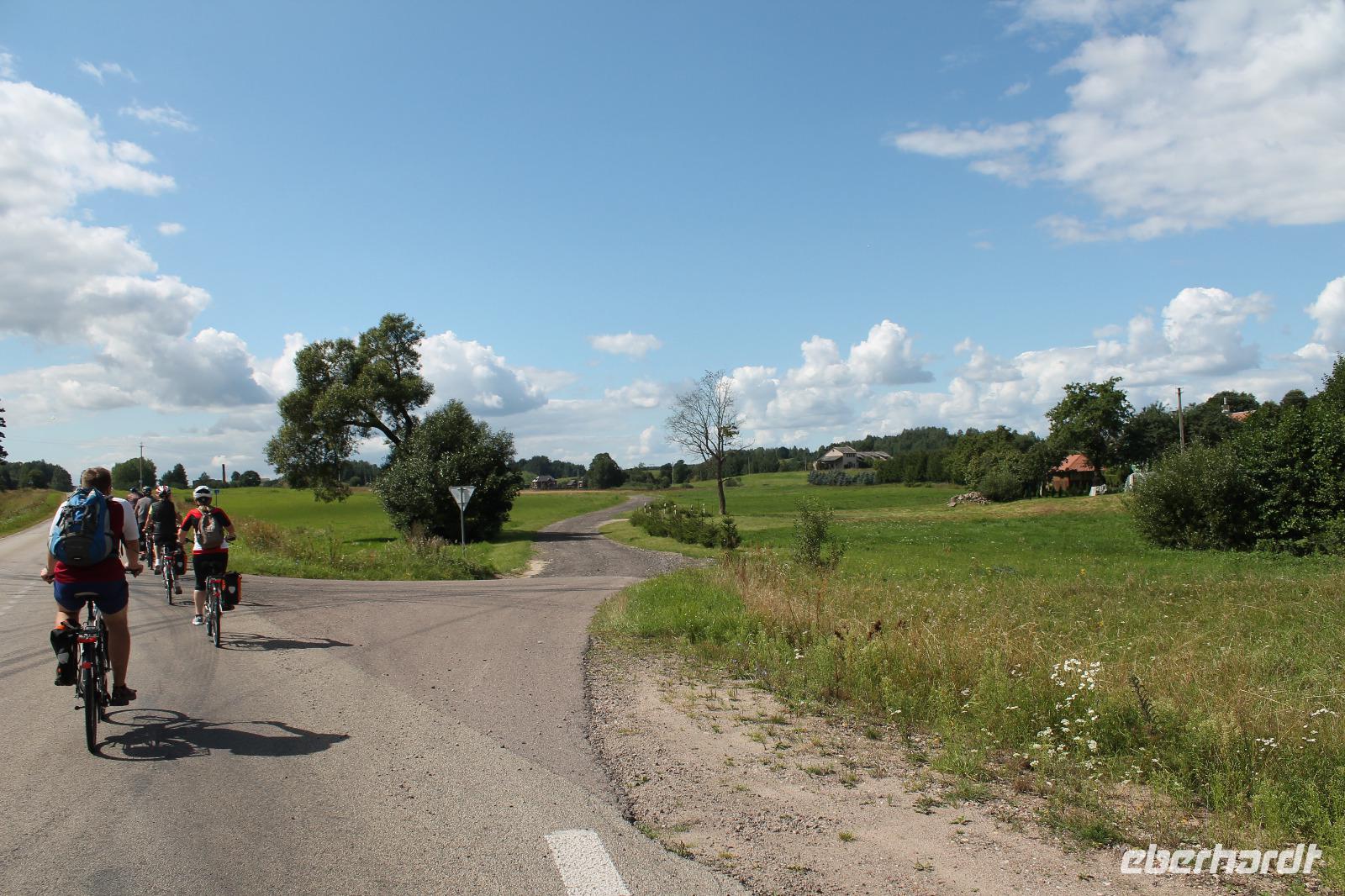 Am Morgen lernten wir zuerst unseren Chauffeur Edvard kennen, als wir unseren Kleinbus beluden und Richtung Trakai aufbrachen. Wir fuhren aus Vilnius hinaus, vorbei am Bernadinensee bis zur berühmten Wasserburg. Diese ehemalige Verteidigungsanlage ist heute ein Heimatmuseum und kostenfrei zu besichtigen. So schlenderten wir in der idyllischen Umgebung umher, verschafften uns einen Eindruck vom Inneren der Burg - und das alles bei strahlend blauem Himmel. Dementsprechend schön blieb das Wetter auch während unserer ersten Fahrradtour Richtung Kaunas. Bei Gegenwind und hügeliger Strecke, durchquerten wir wunderschöne Landschaften. Wir kamen an vielen Feldern vorbei, an Holzhütten und Bauernhöfen, Wiesen und Wäldern, Seen und herrlichen Flecken Erde, an denen man am liebsten hätte länger verweilen wollen. Nach einem kleinen Stopp, um unsere Flaschen wieder zu füllen, fuhren wir die letzte Etappe der knapp 30-Kilometer-Tagestour. An einem Treffpunkt umrundet von mehreren Seen, empfing uns unser Chauffeur und lud die Räder auf. Währenddessen ging man schwimmen oder schlenderte durch die wundervolle, grüne Natur. Mit meinen Dehnübungen konnte ich leider kaum jemanden zum Mitmachen begeistern :-) ... Weiter fuhren wir mit dem Bus in die Stadt Kaunas hin zum Schloss. Hier beobachteten wir ein frisch vermähltes Hochzeitspaar beim Fotoshooting und liefen zum Abschluss des Tages durch die relativ ruhige Stadt.