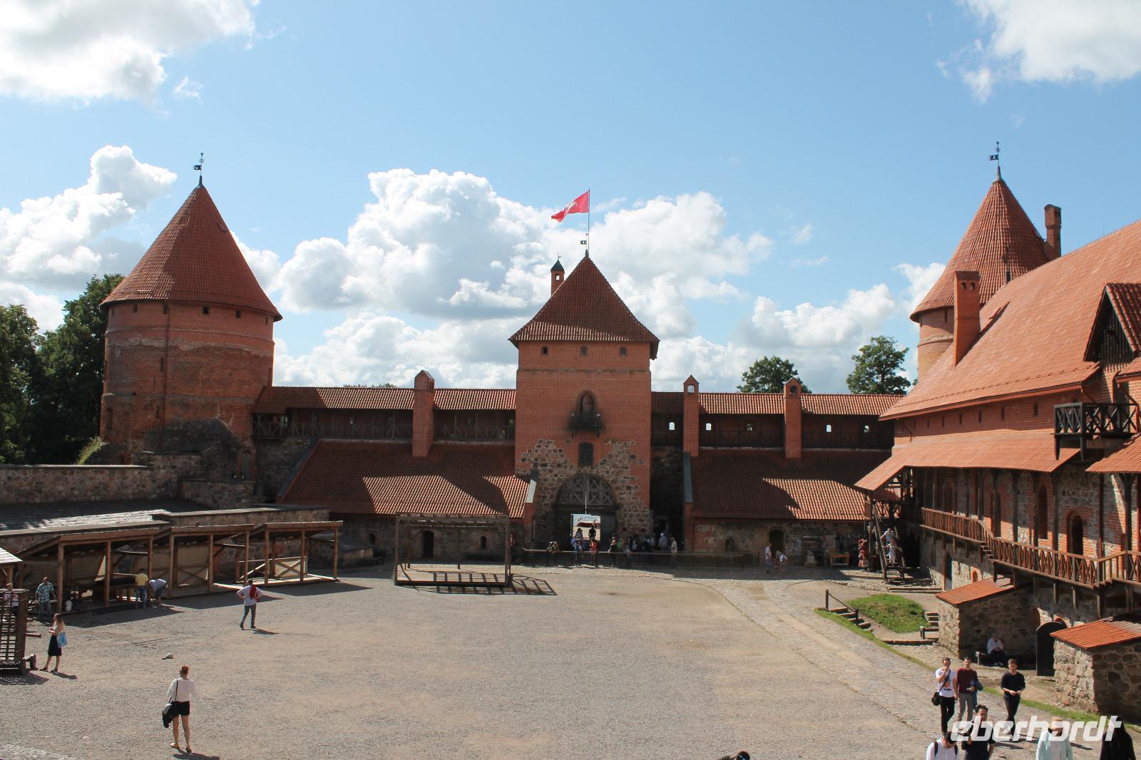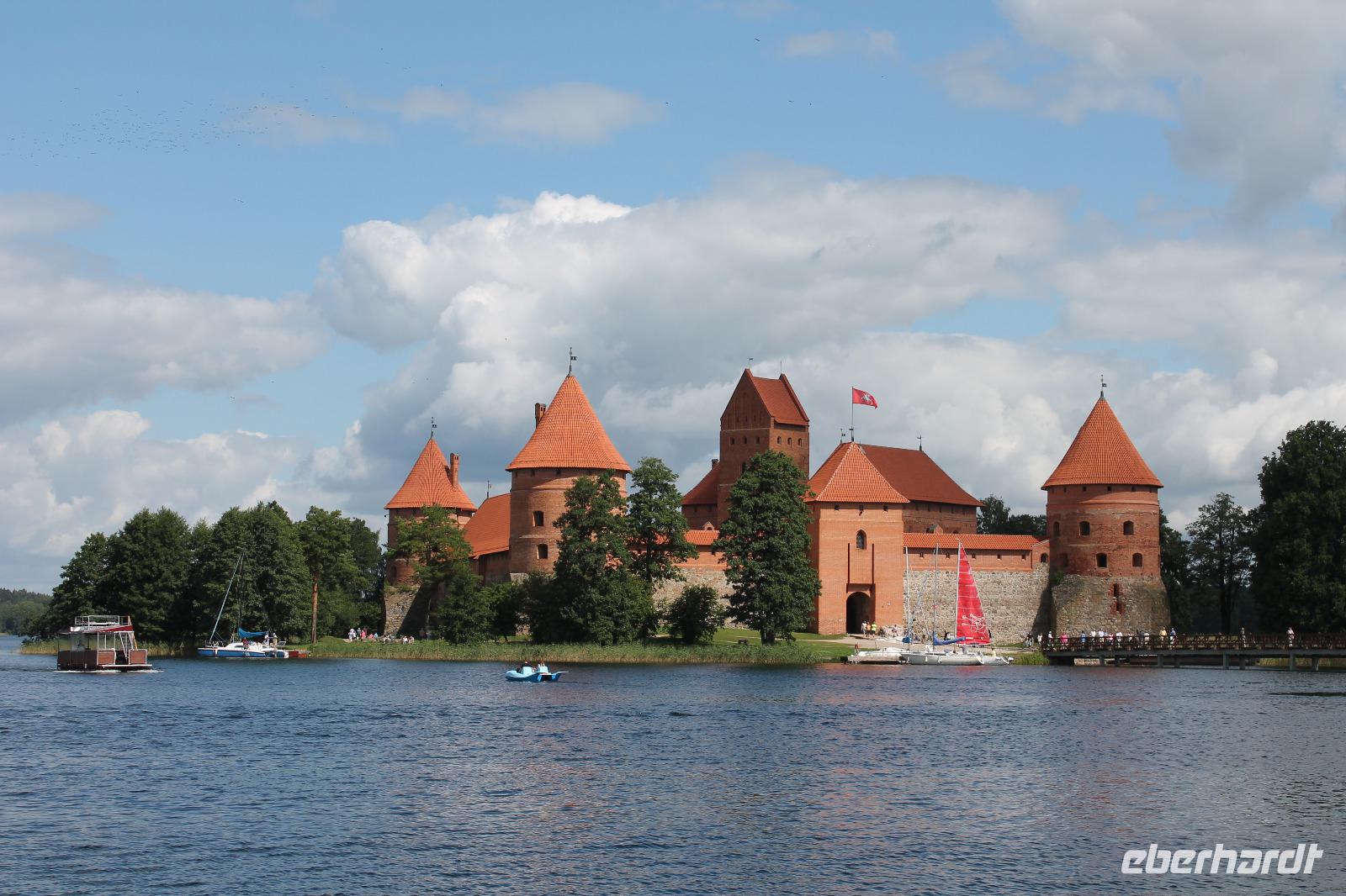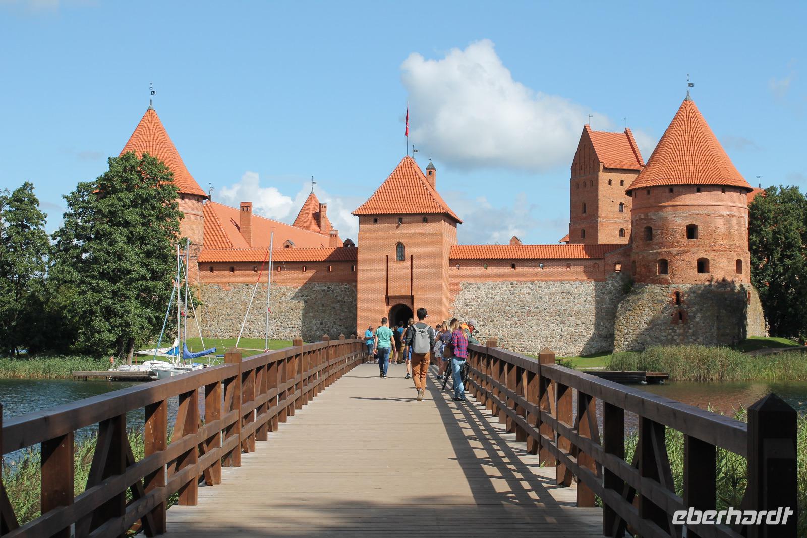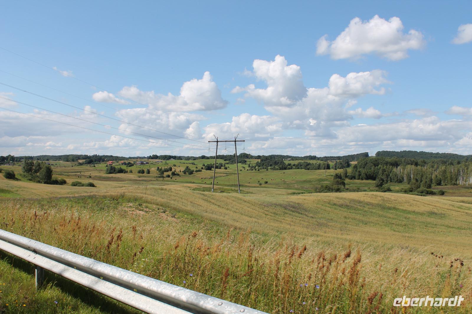 Am Morgen lernten wir zuerst unseren Chauffeur Edvard kennen, als wir unseren Kleinbus beluden und Richtung Trakai aufbrachen. Wir fuhren aus Vilnius hinaus, vorbei am Bernadinensee bis zur berühmten Wasserburg. Diese ehemalige Verteidigungsanlage ist heute ein Heimatmuseum und kostenfrei zu besichtigen. So schlenderten wir in der idyllischen Umgebung umher, verschafften uns einen Eindruck vom Inneren der Burg - und das alles bei strahlend blauem Himmel. Dementsprechend schön blieb das Wetter auch während unserer ersten Fahrradtour Richtung Kaunas. Bei Gegenwind und hügeliger Strecke, durchquerten wir wunderschöne Landschaften. Wir kamen an vielen Feldern vorbei, an Holzhütten und Bauernhöfen, Wiesen und Wäldern, Seen und herrlichen Flecken Erde, an denen man am liebsten hätte länger verweilen wollen. Nach einem kleinen Stopp, um unsere Flaschen wieder zu füllen, fuhren wir die letzte Etappe der knapp 30-Kilometer-Tagestour. An einem Treffpunkt umrundet von mehreren Seen, empfing uns unser Chauffeur und lud die Räder auf. Währenddessen ging man schwimmen oder schlenderte durch die wundervolle, grüne Natur. Mit meinen Dehnübungen konnte ich leider kaum jemanden zum Mitmachen begeistern :-) ... Weiter fuhren wir mit dem Bus in die Stadt Kaunas hin zum Schloss. Hier beobachteten wir ein frisch vermähltes Hochzeitspaar beim Fotoshooting und liefen zum Abschluss des Tages durch die relativ ruhige Stadt.
