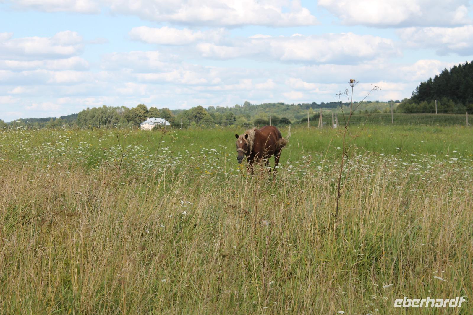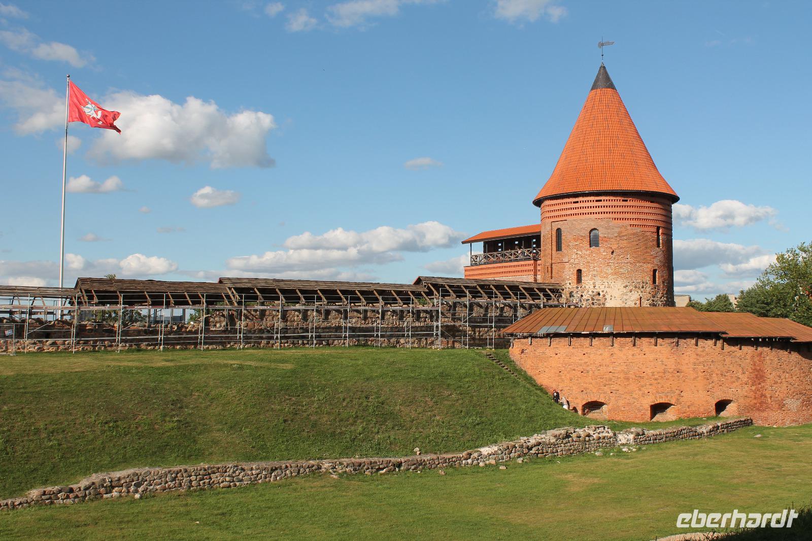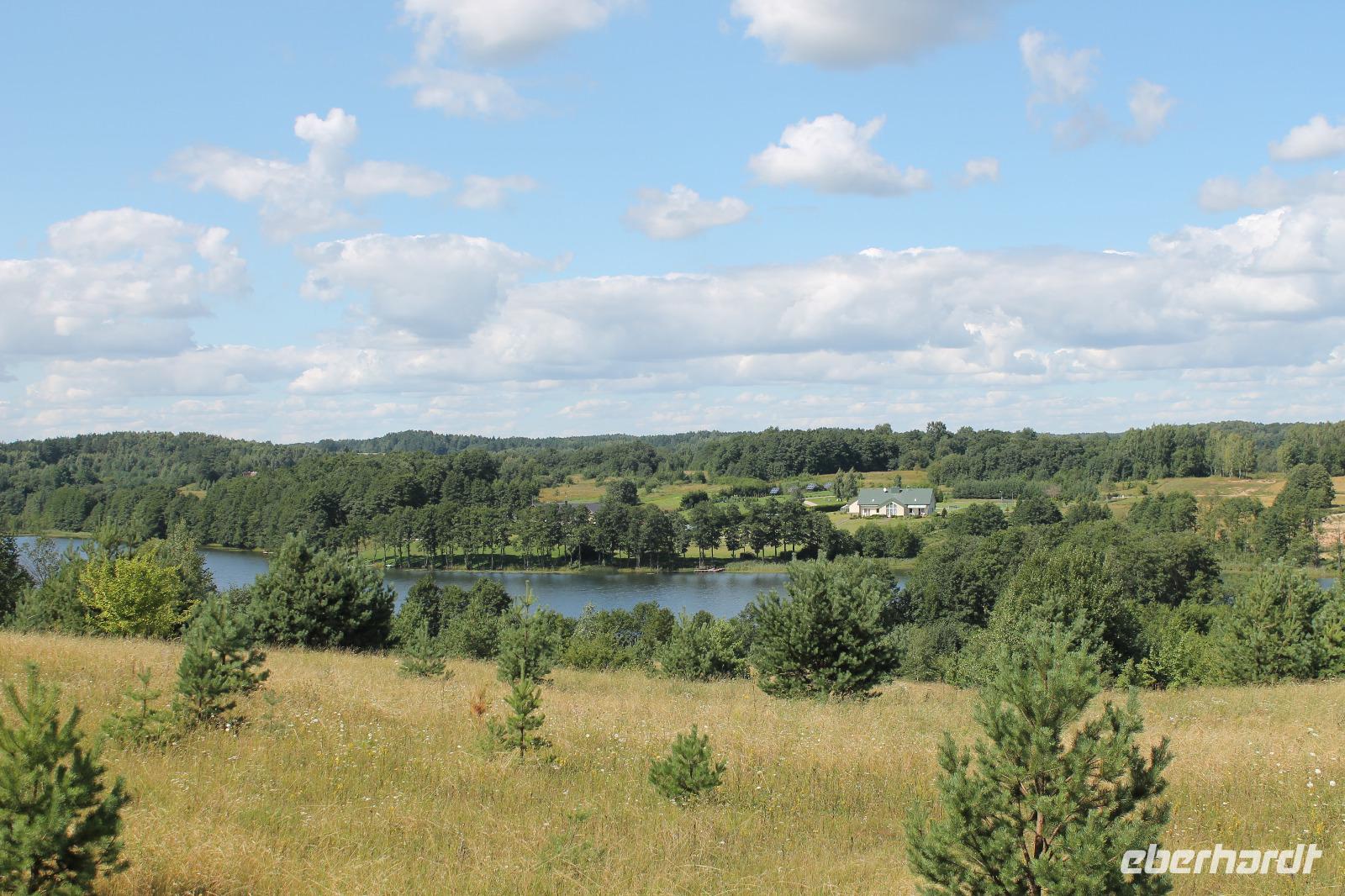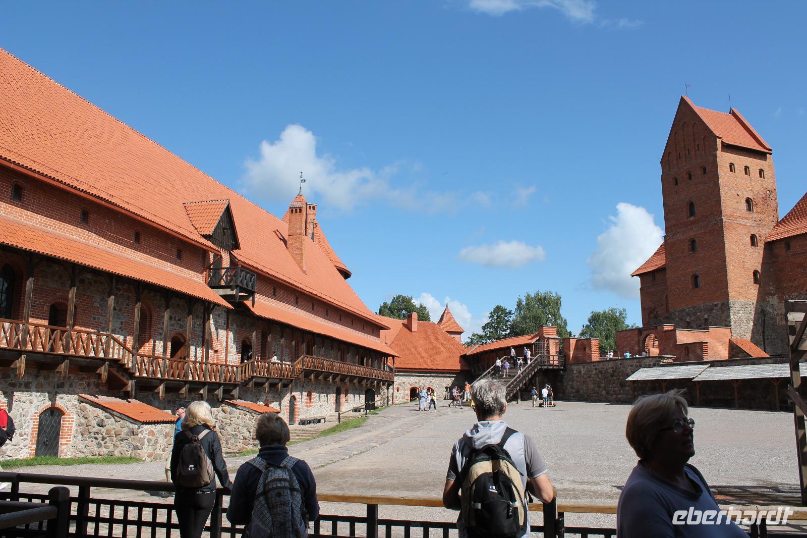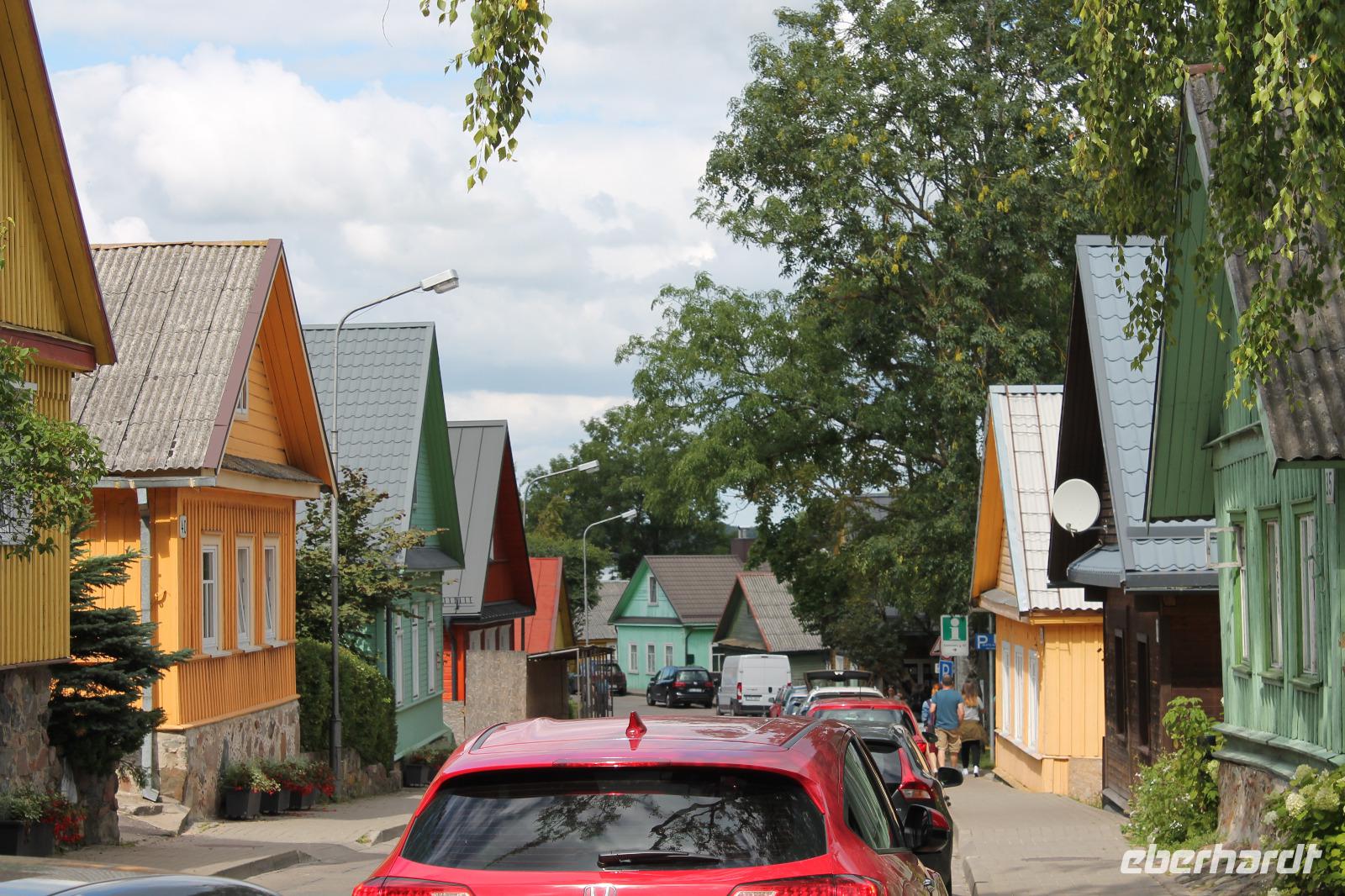 Am Morgen lernten wir zuerst unseren Chauffeur Edvard kennen, als wir unseren Kleinbus beluden und Richtung Trakai aufbrachen. Wir fuhren aus Vilnius hinaus, vorbei am Bernadinensee bis zur berühmten Wasserburg. Diese ehemalige Verteidigungsanlage ist heute ein Heimatmuseum und kostenfrei zu besichtigen. So schlenderten wir in der idyllischen Umgebung umher, verschafften uns einen Eindruck vom Inneren der Burg - und das alles bei strahlend blauem Himmel. Dementsprechend schön blieb das Wetter auch während unserer ersten Fahrradtour Richtung Kaunas. Bei Gegenwind und hügeliger Strecke, durchquerten wir wunderschöne Landschaften. Wir kamen an vielen Feldern vorbei, an Holzhütten und Bauernhöfen, Wiesen und Wäldern, Seen und herrlichen Flecken Erde, an denen man am liebsten hätte länger verweilen wollen. Nach einem kleinen Stopp, um unsere Flaschen wieder zu füllen, fuhren wir die letzte Etappe der knapp 30-Kilometer-Tagestour. An einem Treffpunkt umrundet von mehreren Seen, empfing uns unser Chauffeur und lud die Räder auf. Währenddessen ging man schwimmen oder schlenderte durch die wundervolle, grüne Natur. Mit meinen Dehnübungen konnte ich leider kaum jemanden zum Mitmachen begeistern :-) ... Weiter fuhren wir mit dem Bus in die Stadt Kaunas hin zum Schloss. Hier beobachteten wir ein frisch vermähltes Hochzeitspaar beim Fotoshooting und liefen zum Abschluss des Tages durch die relativ ruhige Stadt.