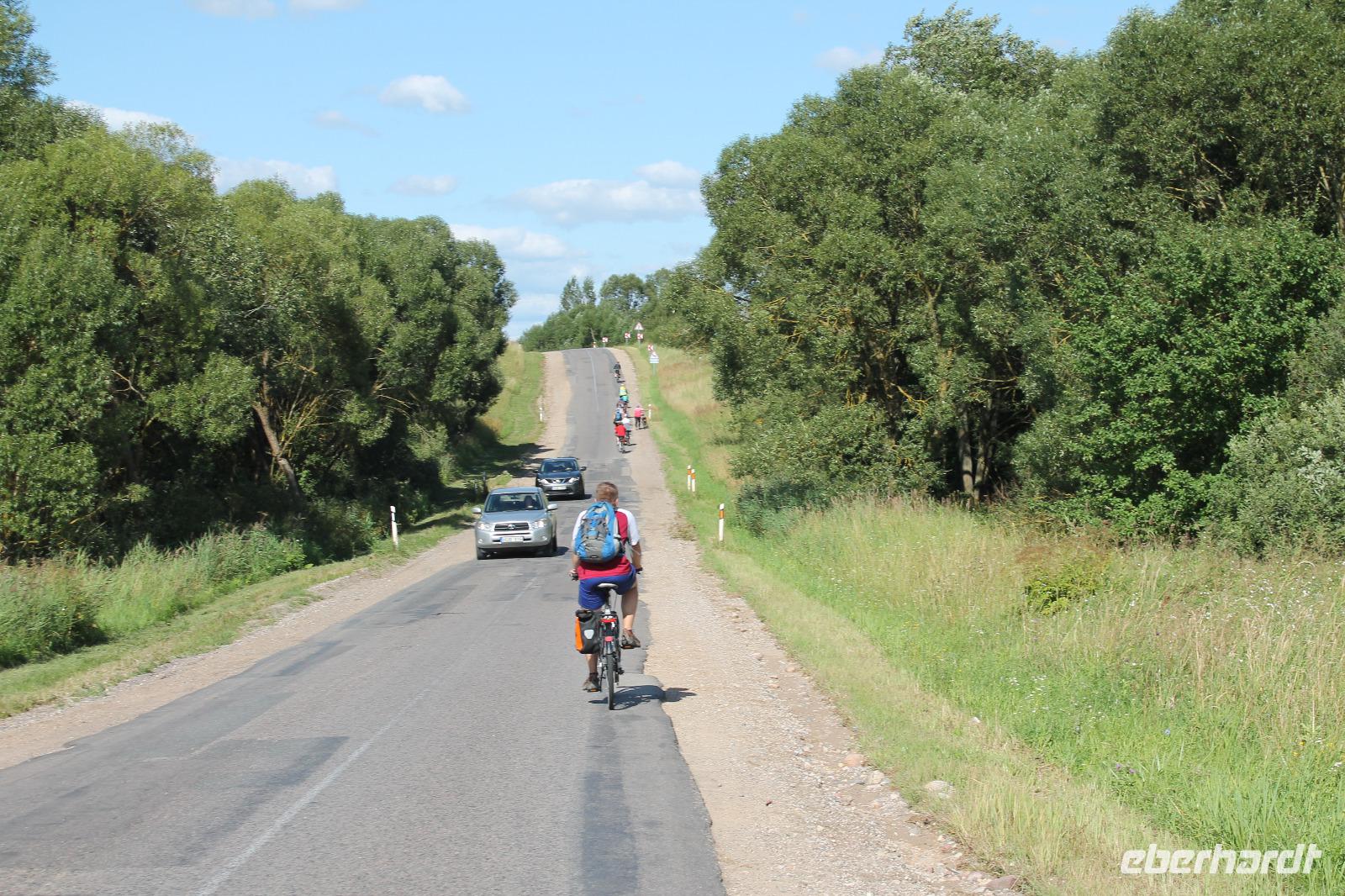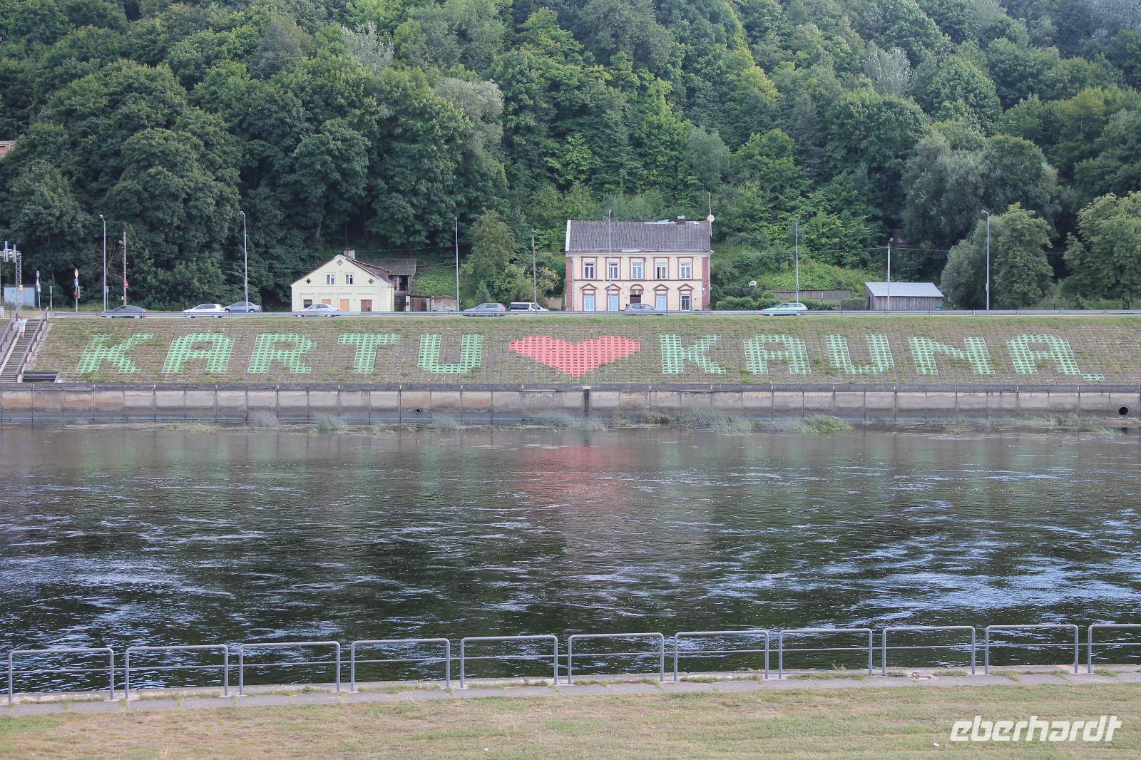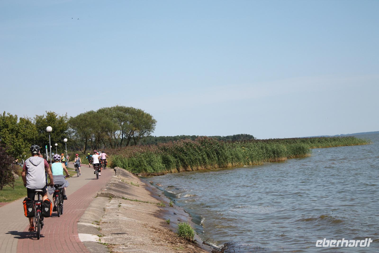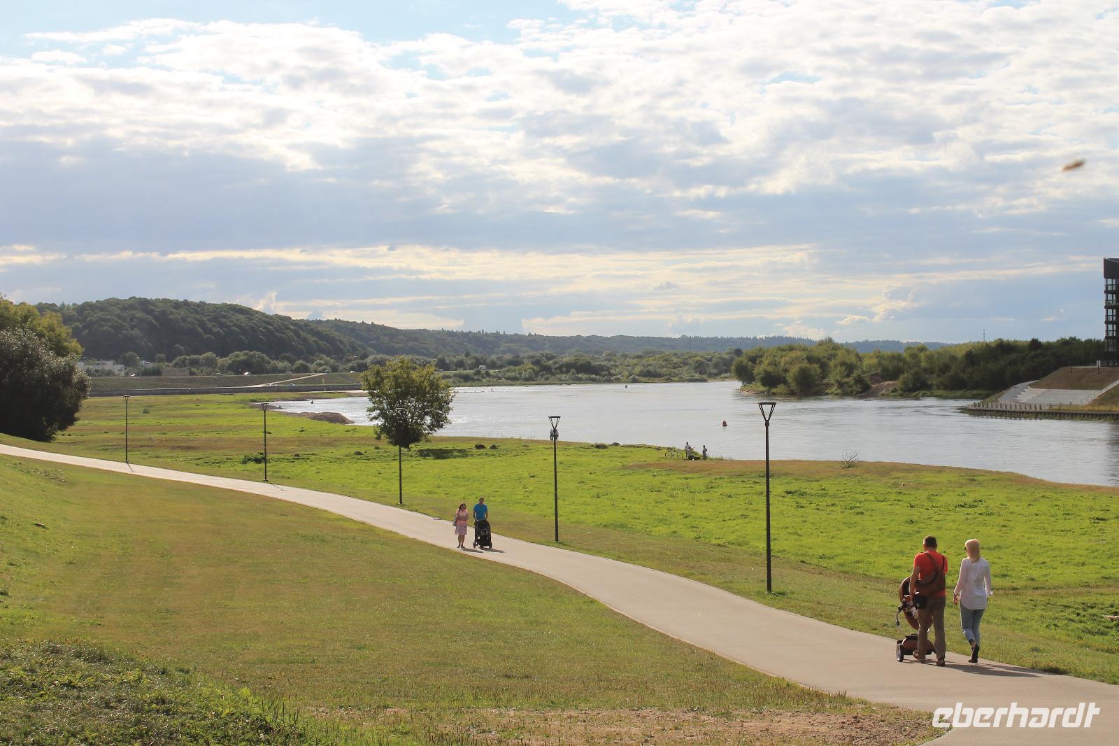 Am Morgen lernten wir zuerst unseren Chauffeur Edvard kennen, als wir unseren Kleinbus beluden und Richtung Trakai aufbrachen. Wir fuhren aus Vilnius hinaus, vorbei am Bernadinensee bis zur berühmten Wasserburg. Diese ehemalige Verteidigungsanlage ist heute ein Heimatmuseum und kostenfrei zu besichtigen. So schlenderten wir in der idyllischen Umgebung umher, verschafften uns einen Eindruck vom Inneren der Burg - und das alles bei strahlend blauem Himmel. Dementsprechend schön blieb das Wetter auch während unserer ersten Fahrradtour Richtung Kaunas. Bei Gegenwind und hügeliger Strecke, durchquerten wir wunderschöne Landschaften. Wir kamen an vielen Feldern vorbei, an Holzhütten und Bauernhöfen, Wiesen und Wäldern, Seen und herrlichen Flecken Erde, an denen man am liebsten hätte länger verweilen wollen. Nach einem kleinen Stopp, um unsere Flaschen wieder zu füllen, fuhren wir die letzte Etappe der knapp 30-Kilometer-Tagestour. An einem Treffpunkt umrundet von mehreren Seen, empfing uns unser Chauffeur und lud die Räder auf. Währenddessen ging man schwimmen oder schlenderte durch die wundervolle, grüne Natur. Mit meinen Dehnübungen konnte ich leider kaum jemanden zum Mitmachen begeistern :-) ... Weiter fuhren wir mit dem Bus in die Stadt Kaunas hin zum Schloss. Hier beobachteten wir ein frisch vermähltes Hochzeitspaar beim Fotoshooting und liefen zum Abschluss des Tages durch die relativ ruhige Stadt.