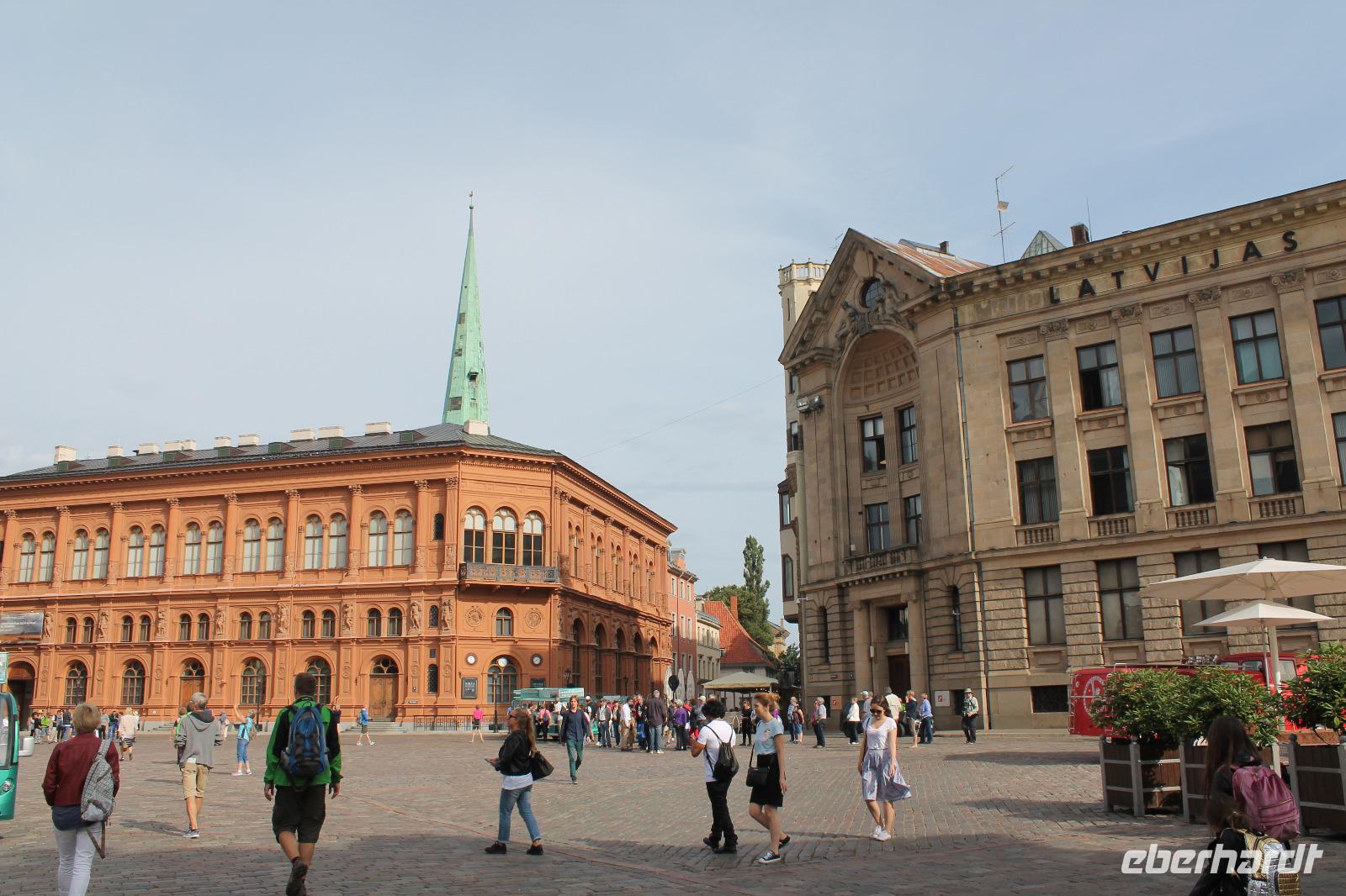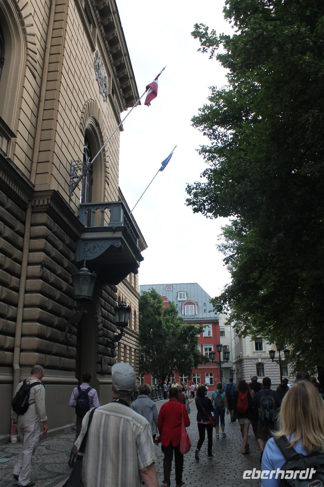 Nachdem wir gestern Abend auf eigene Faust erkundet haben, führte uns Aija heute persönlich durch ihre Heimat. Unser Hotel lag direkt an dem trockengelegten Flussbett der Riga, welche der Stadt auch ihren Namen gab. Wir spazierten durch die bunten Innenhöfe - welche zu sowjetischen Zeiten nur trist und grau waren. Vorbei an der im 13. Jahrhundert erbauten Petrikirche, durch eine kleine Gasse bis zum Rathausplatz liefen wir. Hier, am Rathausplatz, sollten wir am Abend noch zum gemeinsamen Abendessen zusammenfinden. Zur Zeit sind in der lettischen Hauptstadt leider viele Baustellen - so war auch das Rathaus gerade von Gerüsten verdeckt. In einer Einkaufspassage, in der landestypische Trachten verkauft und angefertigt werden, besuchten wir einen dieser Läden. Aija erklärte die verschiedenen Stile und Bedeutungen der unterschiedlichen Schmuckstücke. Auf der anderen Seite der Passage sahen wir das Jugendstilhaus auf der Jauniela. Die Straße weiter abwärts trafen wir auf den Domplatz. Hier befinden sich die Rigaer Börse und das lettische Radio. Über das Haus von Gottfried Herdens, bis zur gestern noch so stark befahrenen Straße verlief unsere Tour. Nur heute waren anstatt Autos eine große Bühne dort, für das anstehende Fest. Vorbei an der anglikanischen Kirche und dem Rigaer Schloss, dem Haus der drei Brüder, dem Parlament und durch die Lärmgasse hindurch, bis zum Pulverturm gingen wir. Hier legten wir eine kleine Kaffeepause ein. Gestärkt gingen wir in Richtung der Freiheitsstatue und weiter zu den barocken Häusern. Ab hier erkundeten wir den übrigen Teil Rigas selbst. Abends trafen wir uns im Restaurant Salve - der Abend verlief feucht fröhlich. :-)