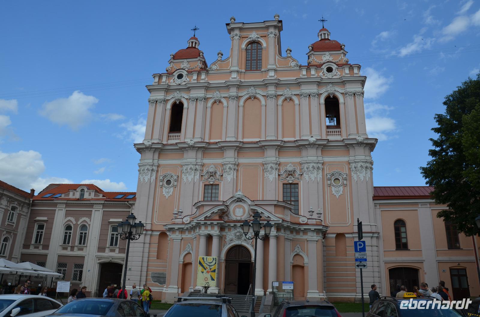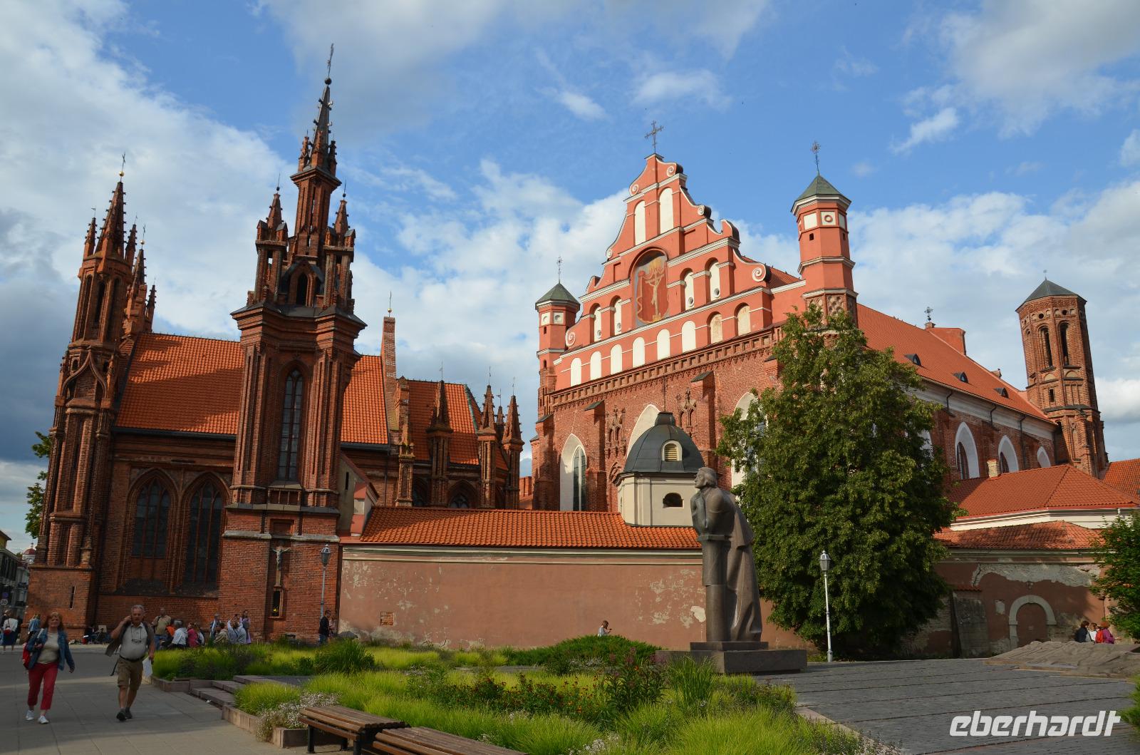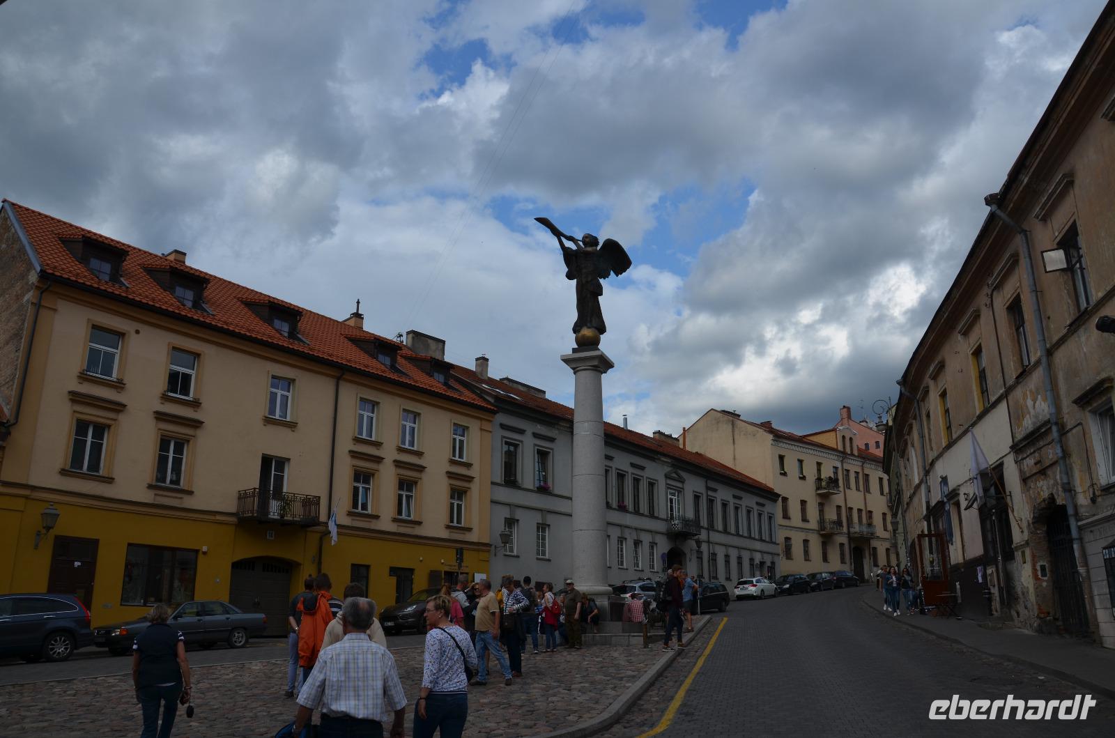 Wer eine Aktivreise begeht, kann auch aktiv zeitig aufstehen. Somit begeben wir uns verhältnismäßig früh mit dem Flieger zum Umschlagplatz Deutschlands, nach Frankfurt am Main, um von da aus gemeinsam in die Hauptstadt Litauens zu reisen. Direkt vor Ort werden wir herzlich von unserem örtlichen Reiseleiter Edgaras empfangen und ins zentrumsnahe Hotel begleitet. Unsere private, kleine Gruppe hat somit ein neues Mitglied. Nach einer kurzen Verschnaufpause geht es auf einen dreistündigen Stadtrundgang mit Janina in führender Position. Im Gegensatz zu den anderen baltischen Hauptstädten, wurde Vilnius von Heiden gegründet und zeigt die damit einhergehende Naturverbundenheit in den zahlreichen Grünanlagen der Stadt. Hier herrscht eine besondere Artenvielfalt an Vögeln. Auch zahlreich vertreten sind religiöse Bauten, wie Kirchen oder Kathedralen. Allein in der Altstadt gibt es 40 Stück an der Zahl, in denen insgesamt 7 Religionen vertreten sind. Zuerst stoppen wir am Denkmal zweier litauischer Schriftstellerinnen, welches wegen seiner Form den Namen „Eule" bekommen hat. Hier sitzen wir gemütlich im Schatten und lauschen eine ganze Weile Janinas Ausführungen zur Geschichte von Vilnius. Weiter geht es in die innere Altstadt durch das „Tor der Morgenröte", welches sich in der historischen Stadtmauer von Vilnius befindet und einen bedeutenden Wallfahrtsort für Katholiken sowie orthodoxe und unierte Christen darstellt. Dabei erhaschen wir durch ein Glasfenster einen Blick auf die Schönheit der „Schwarzen Madonna", die sich in diesem Gebäude befindet.