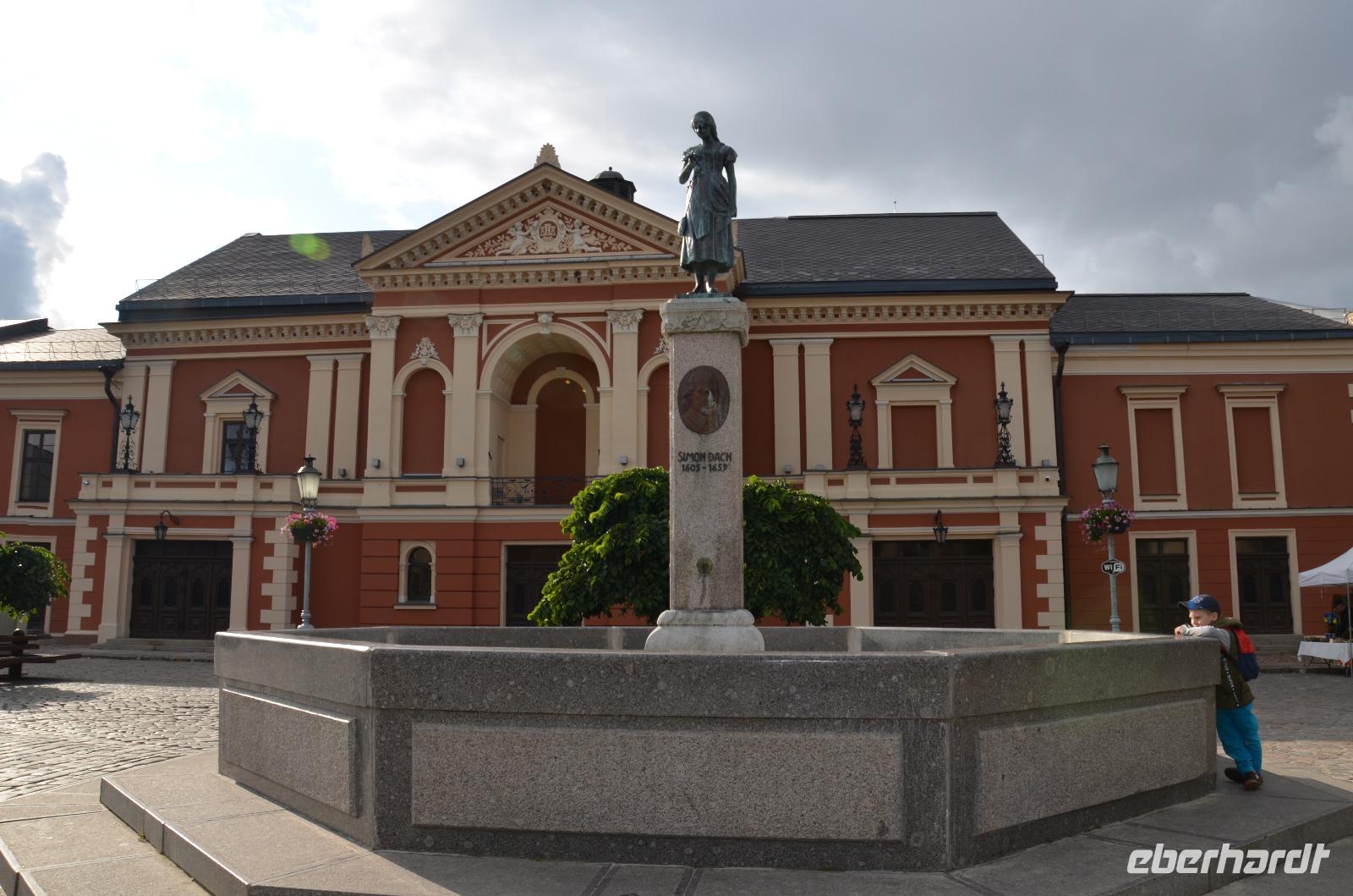 Die Wetterprognose für den heutigen Tag ist mit starken Regengüssen, eingebettet in Gewitter, bei maximal 16 Grad nicht gerade rosig. Somit lauschen wir auf dem Transfer nach Vente, eingelullt in unseren kleinen Transporter, den zahlreichen Geschichten von Edgaras, während draußen das Unwetter tobt. Spätestens bei einem kurzen Stopp an der Grenze zu Kaliningrad ist man sofort wieder hellwach, wenn man in das ungemütliche, kalte Wetter hinaus tritt. Somit kommt der heiße Tee bei unserem Stopp zum Mittagessen nach einer vierstündigen Fahrt genau richtig. Wir haben heute das große Glück bei Eleonora und ihrem Mann auf dem hauseigenen Grundstück essen zu können. Es gibt nur selbst zubereitete und selbst geerntete, litauische Köstlichkeiten. Und wem der Tee zum Durchwärmen nicht ausreicht, ist spätestens beim selbstgebrannten Schnaps Feuer und Flamme ;). Die Besonderheit liegt hierbei in der speziellen Form des Konsumierens, da man das Gläschen ruhig auf dem Handrücken abstellt, um es dann in einem schnellen Zug zum Mund zu führen und komplett verschwinden zu lassen. Vielleicht hätten einige den 60prozentigen Schnaps besser vorher testen sollen, bevor er sich mit geballter Kraft seinen Weg in den Magen kämpft und es kein Zurück mehr gibt. Allein dieses Schauspiel und die damit einhergehenden Grimassen mit anzuschauen, ist eine wahre Freude :)! Und dann passiert es - als wir fertig zum Aufbruch sind, unsere Räder bereits gesattelt, reißt der Himmel auf und die Sonne kommt hervor. Dieses wundervolle, sommerliche Wetter wird uns von dort an den gesamten Tag begleiten. Könnte es besser laufen?! Unser erstes Ziel stellt die Vogelberingungsstation am Windenburger Eck (litauisch Ventés ragas) dar, welche sich auf einer Landzunge des Memeldeltas befindet, die ins Kurische Haff hinein ragt. Mit dem Gründungsjahr von 1929, ist sie eine der ältesten Stationen weltweit und wird von dem Star der Szene Vytautas Jusys geführt. Wir erinnern uns - Fürst Vytautas der Große. Dieser Name birgt für Qualität. Ihm fehlen nur noch 20.000 Vögel, um sich an die Weltspitze vor zu arbeiten. Zusätzlich ist er ein gefeierter Autor von insgesamt 21 Büchern und einfach nur ein wirklich lustiger Geselle, mit einem Wortanschlag pro Minuten, wie ich es lange nicht mehr gehört habe. Hautnah bekommen wir einen bereits gechipten Schilfrohrsänger vorgeführt sowie eine kleine Rauhhautfledermaus, die nach ihrem Auftritt wieder ins sichere Stoffbeutelchen darf. Wer sich den ganzen Prozess nicht so ganz vorstellen kann, muss im Herbst wieder kommen, zur Zeit der Vogelwanderung. In dieser Zeit passieren täglich bis zu drei Millionen Vögel diese Landzunge, von denen sich bis zu 7.300 in den großen Netzen verirren und somit eingefangen werden. Unvorstellbare Zahlen! Nach dieser sehr interessanten Führung genießen wir noch etwas die Sonne vor Ort, besteigen den 1863 erbauten Leuchtturm und sind anschließend final bereit, uns auf die zweite Etappe zu begeben. Entlang idyllischer Felder und Wiesen, eingebettet in zahlreiche Seen, genießen wir die 26,5 km lange Strecke zurück nach Siluté. Dabei entdecken wir zahlreiche Storchen-Horste und sogar zwei Kraniche. Wieder am Transporter angekommen, werden schnell die Räder verstaut und schon befinden wir uns im Anflug auf Klaipéda. Unser wunderschönes Hotel befindet sich direkt am hiesigen Hafen, der zum Schlendern und Verweilen einlädt. Bevor es zum gemeinsamen Abendessen geht, bummeln wir gemütlich durch die Stadt und haben sogar noch Zeit, das „Ännchen von Tharau" des Simon-Dach-Brunnens zu bestaunen.