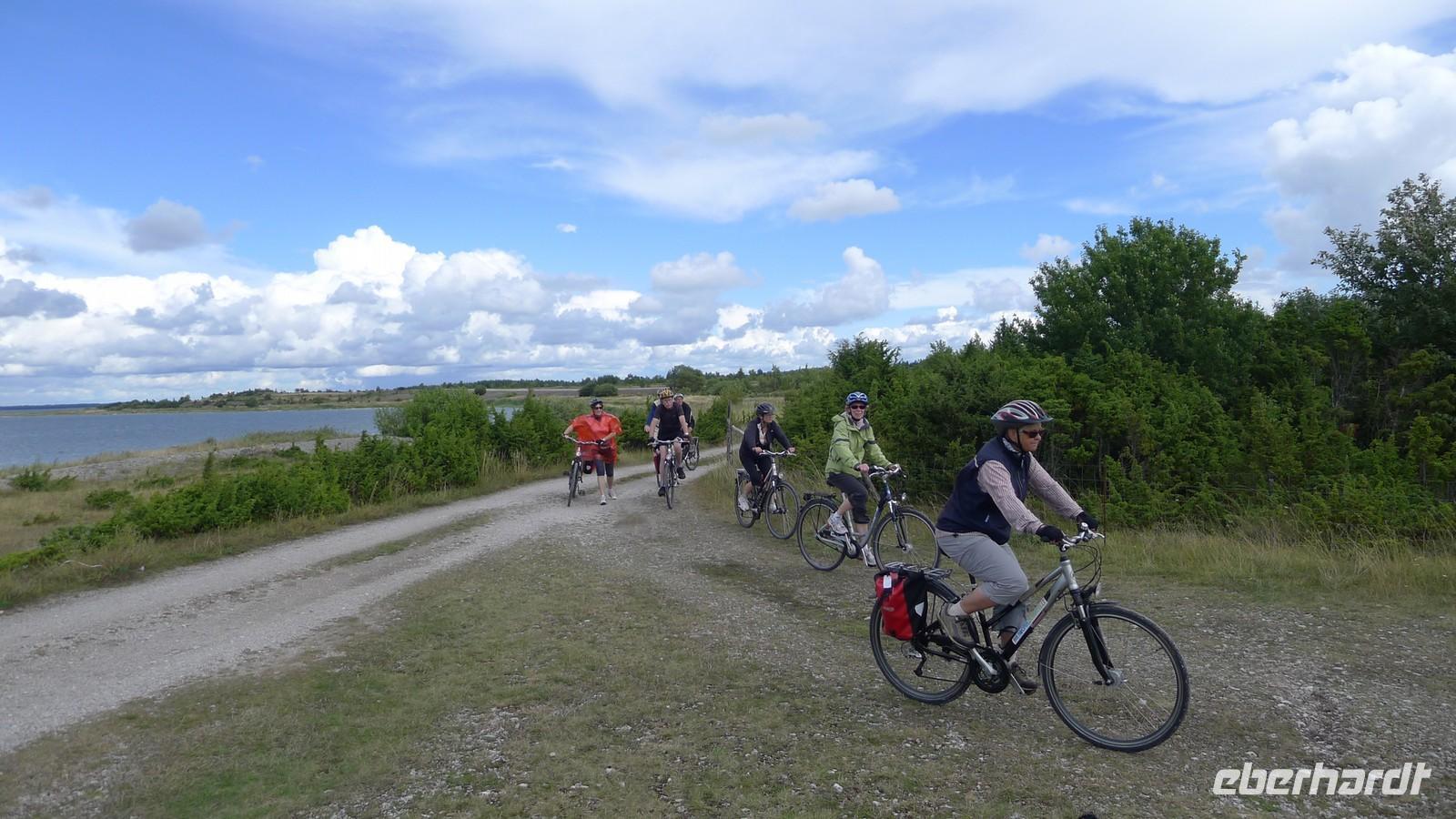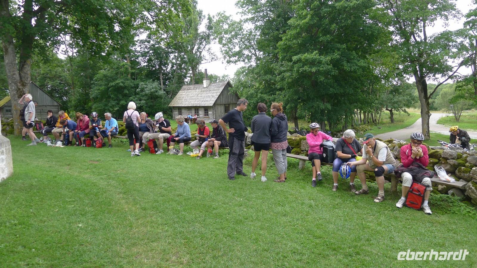 Bei dieser Tour lernten wir die Wahrzeichen der Insel Saaremaa kennen: den Kratersee Kaali, die Windmühlen von Angla, die Kirche von Karja, den Burgruinenrest von Maasi und die alte Bischofsburg in Kuressare. Mit dem Bus ging es zunächst bis zum Kratersee. Hier sah das Wetter so gut aus, dass wir uns für den Beginn unserer Radtour entschieden. Diese führte uns über den mittlerweile errichteten Museumskomplex der Mühlen zur ältesten Kirche der Insel. Nun zogen langsam Gewitterwolken auf, die uns in eiliger Fahrt an die Nordküste der Insel trieben. Noch trocken, fuhren wir dann doch lieber mit dem Bus durch den Regen zur alten Burgfeste Maasi.