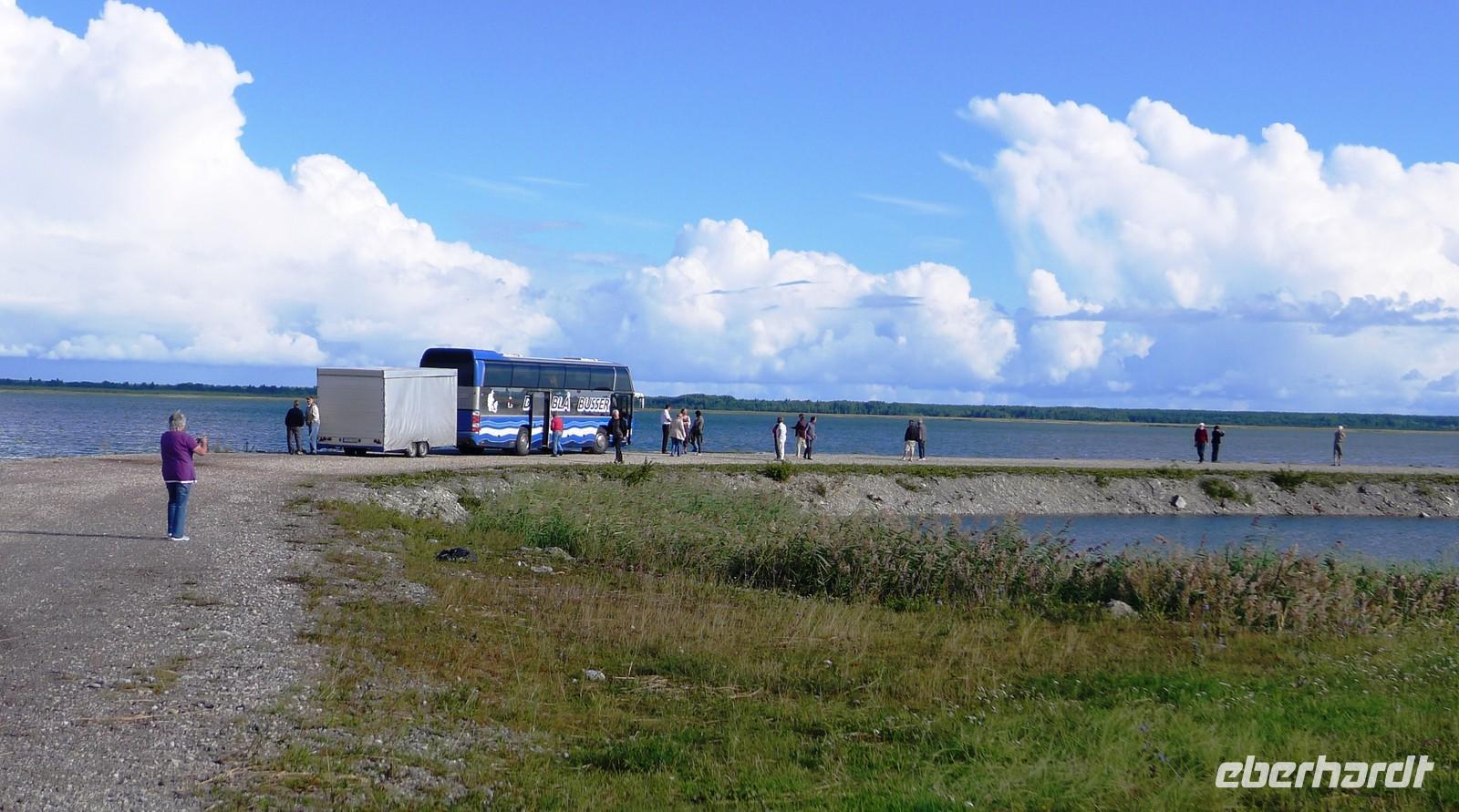 Linas durfte heute den Bus nicht bewegen, weshalb für uns eine Rundtour im Südwesten der Insel das Richtige war. Diese führte uns auf die Halbinsel Salme und an die Ariste-Bucht. Vor ca. 10 000 Jahren hinterließ die Eiszeit hier blankgeleckte Steine im Meer, die wir heute finden können; also als Findlinge üblicherweise bezeichnen. Das Finden ist aber mehr ein Sehen, da diese massenhaft sind und auch stattliche Größen annehmen. Die 1992 abziehende Sowjetarmee hinterließ auch Steine: Denkmäler, Reste von Sperren, alte Geschützstellungen, Befehlsstände und ein Schiff als Ziel für Übungsschießen. An einem kleinen Leuchtturm an der Ariste-Bucht traf sich die Mehrheit zum Picknick; eine Minderheit nutzte die Tour ohnehin zur Entwicklung handwerklicher Fertigkeiten bei fünf Reifenreparaturen. Dennoch erreichten alle recht früh das Hotel und hatten noch Zeit für eine Strand- oder Kaffeestunde.