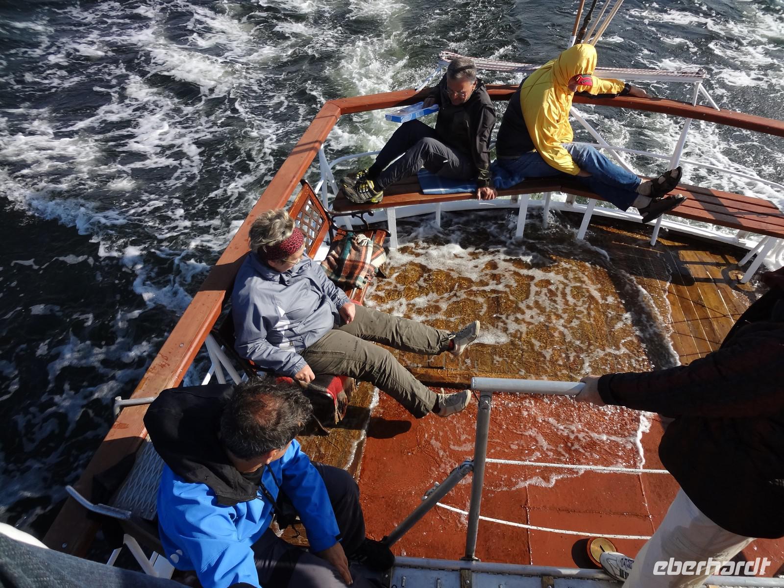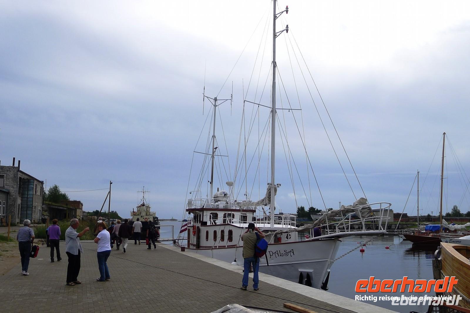 Unser heutiges Etappenziel war die landschaftlich einmalige Insel Saaremaa, die größte der estnischen Inseln. Im Hafenbecken von Mesrags ahnten wir ruhiges Meer und aufkommenden Sonnenschein. Als wir mit dem Motorschiff dem schützenden Saum Estlands und des Kap Kolka verlassen hatten, frischte der Wind auf 10 m/s auf, die Wellen wuchsen an und überspülten immer wieder das Deck. Zum Glück hatten wir rechtzeitig das erste Picknick verzehrt, denn später war so keinem mehr nach üppigem Gelage. Bei etwas Seegang vollzogen wir an der lettisch-estnischen Seegrenze den Flaggenwechsel und eine kleine Äquatortaufe mit Rigaer Balsam und Wodka. (Man beachte bitte beim Einschenken die Richtung eines mittelstarken Seewindes!!) Nach mehr als acht Stunden Fahrtzeit erreichten wir die Insel im Hafen Roomassare. Lockere 15 Abendkilometer trennten uns noch vom Hotel in Mändjala. Nach der Seefahrt war das Interesse am Radfahren jedoch recht geteilt.