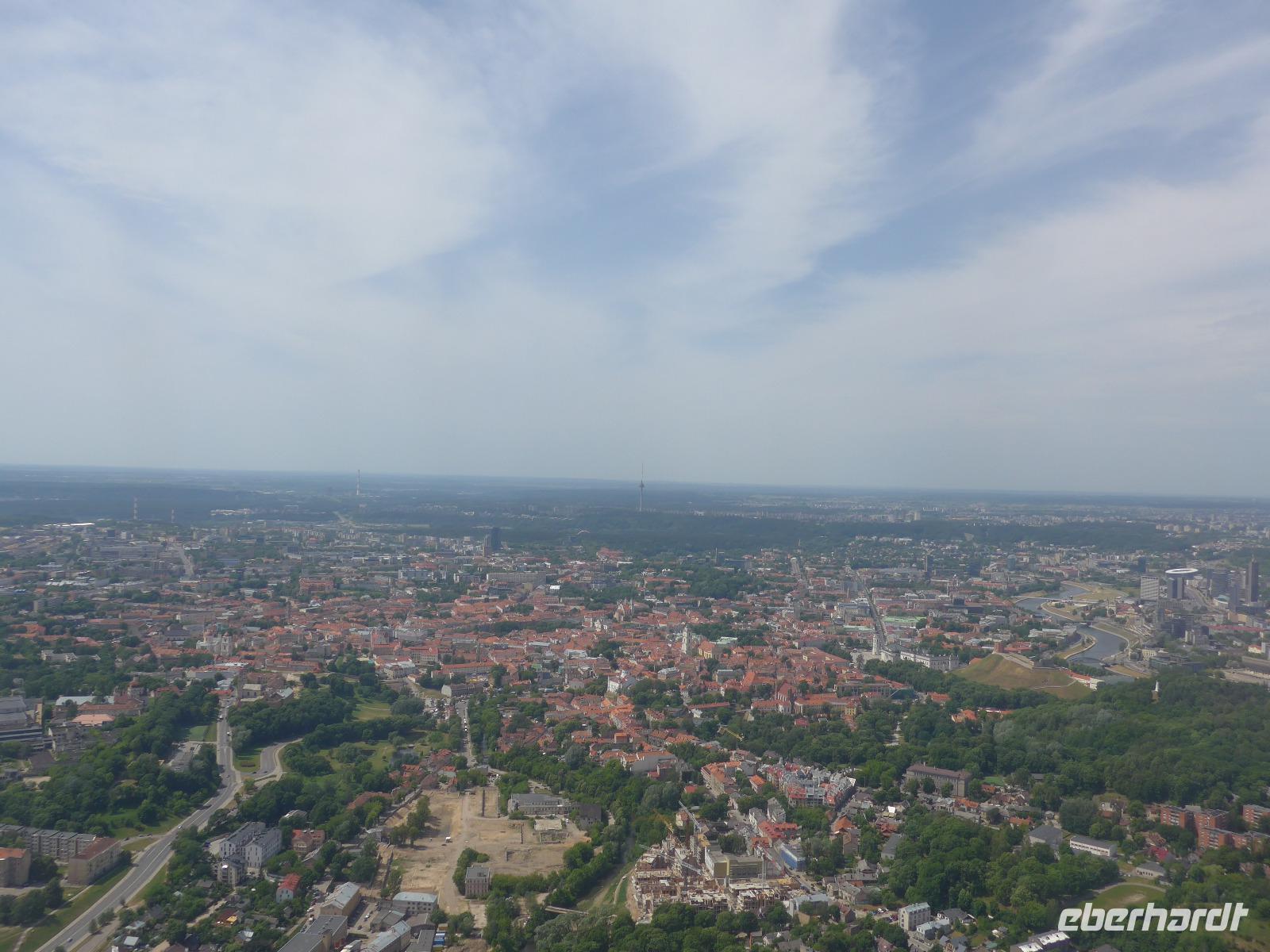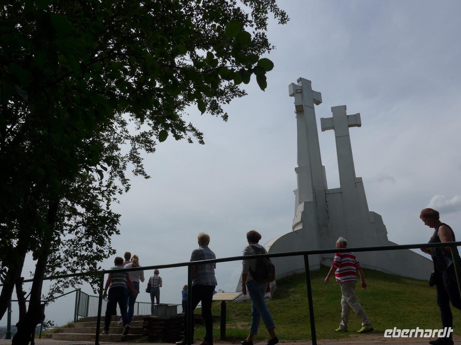 Viele Gäste nutzten wieder den Haustürtransfer zu den Flughäfen und wir flogen mit Lufthansa von Dresden, Leipzig und Berlin Tegel über Frankfurt in die litauische Hauptstadt Vilnius. Dort endlich war unsere Gruppe komplett und wurde von Aija, unserer lettischen Wanderführerin, und Alexandras, unserem litauischen Busfahrer empfangen. Es war früher Nachmittag und so begannen wir gleich mit der Stadtbesichtigung von Vilnius. Von der Uferstrasse entlang der Neris sahen wir die wichtigsten neuen Gebäude und später auch die Reste der alten Burg. Als Wandergruppe erklommen wir den Hügel mit den 3 Kreuzen und hatten eine gute Sicht auf das Zentrum der Stadt. Die Kreuze wurden 1916 auf dem Kahlberg zum Gedenken an die getöteten Franziskaner aufgestellt, in der Sowjetunion gesprengt und 1989 wieder errichtet.