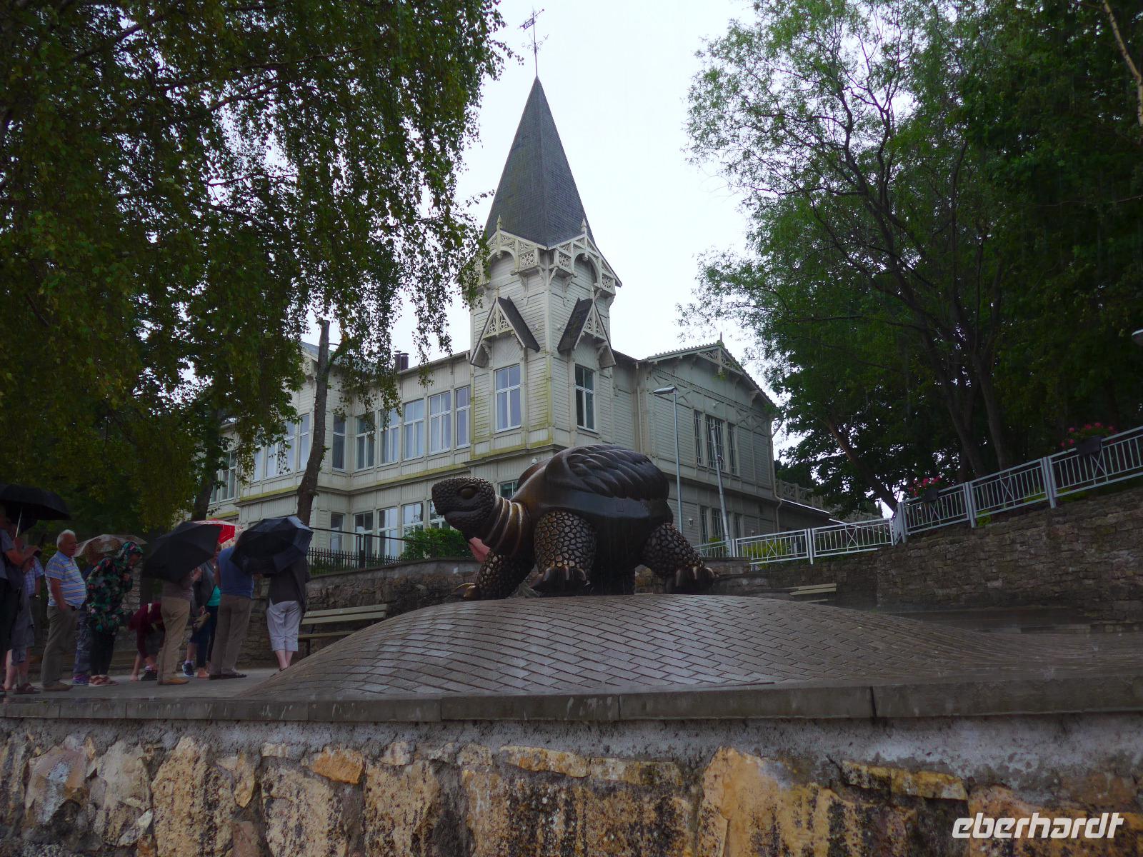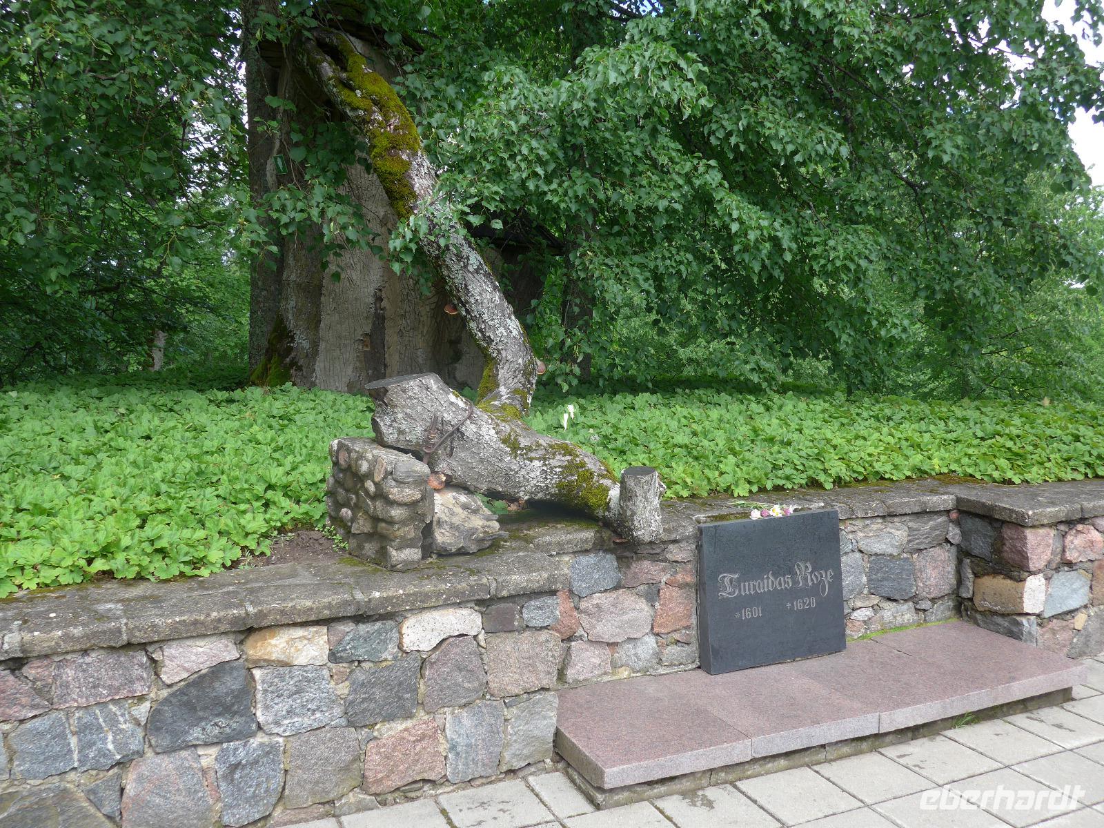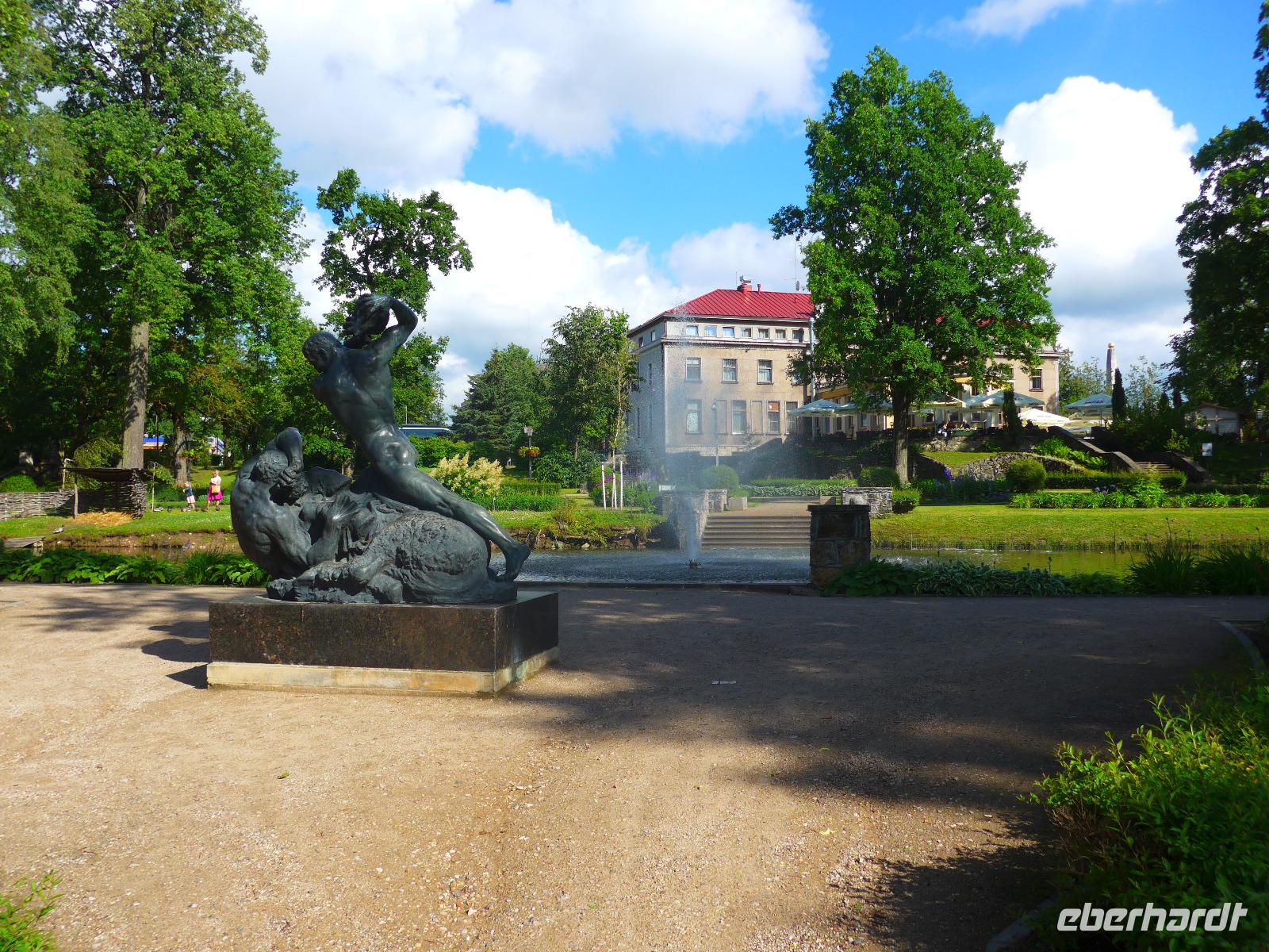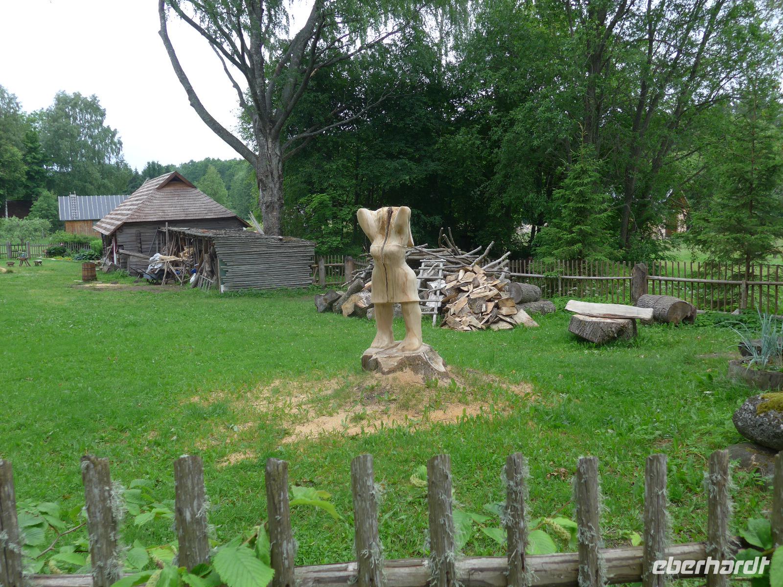 Turaida - lettisch Gottesgarten - ist ein riesiges Gelände mit einem Park, dem Sängerhügel und der alten Burg. Wir gingen zunächst durch den Park zum Sängerhügel, wo uns Aija ausführlich die Steinskulpturen erklärte und dazu auf ihrer Mundharmonika spielte. Auf einer großen Wiese stellten wir uns im Kreis auf und Aija übte mit uns einen lettischen Volkstanz ein. Danach besuchten wir die Burg und stiegen die 140 Stufen auf den Burgfried hinauf. Die Aussicht war sehr gut auf Burg, Gauja und bis nach Sigulda. Ganz in der Nähe von Turaida machten wir in Ragana bei der "Hexe" unsere Mittagspause draußen in der Sonne sitzend. Nun war es nicht mehr weit bis nach Cesis, unseren nächsten Übernachtungsort.