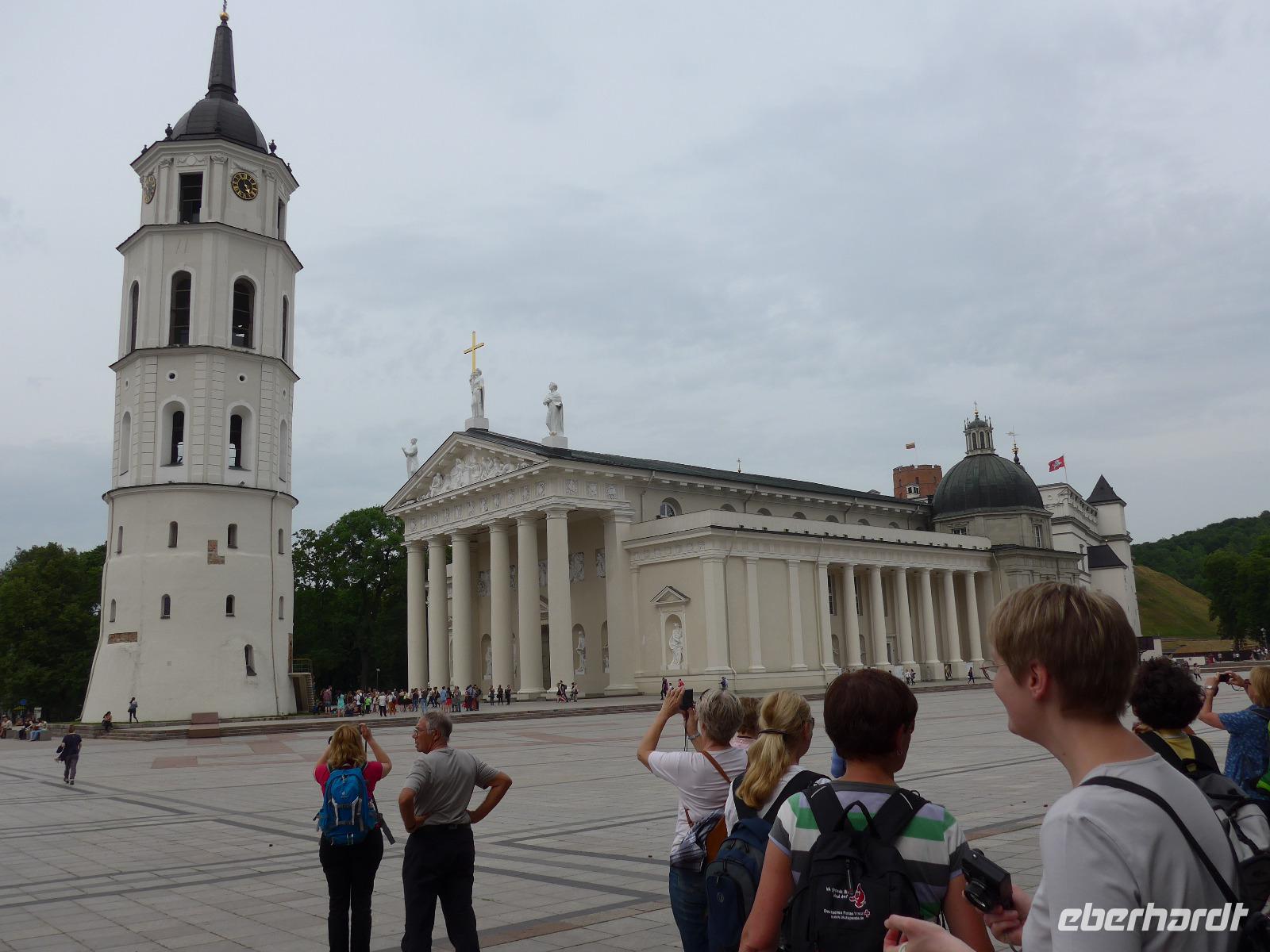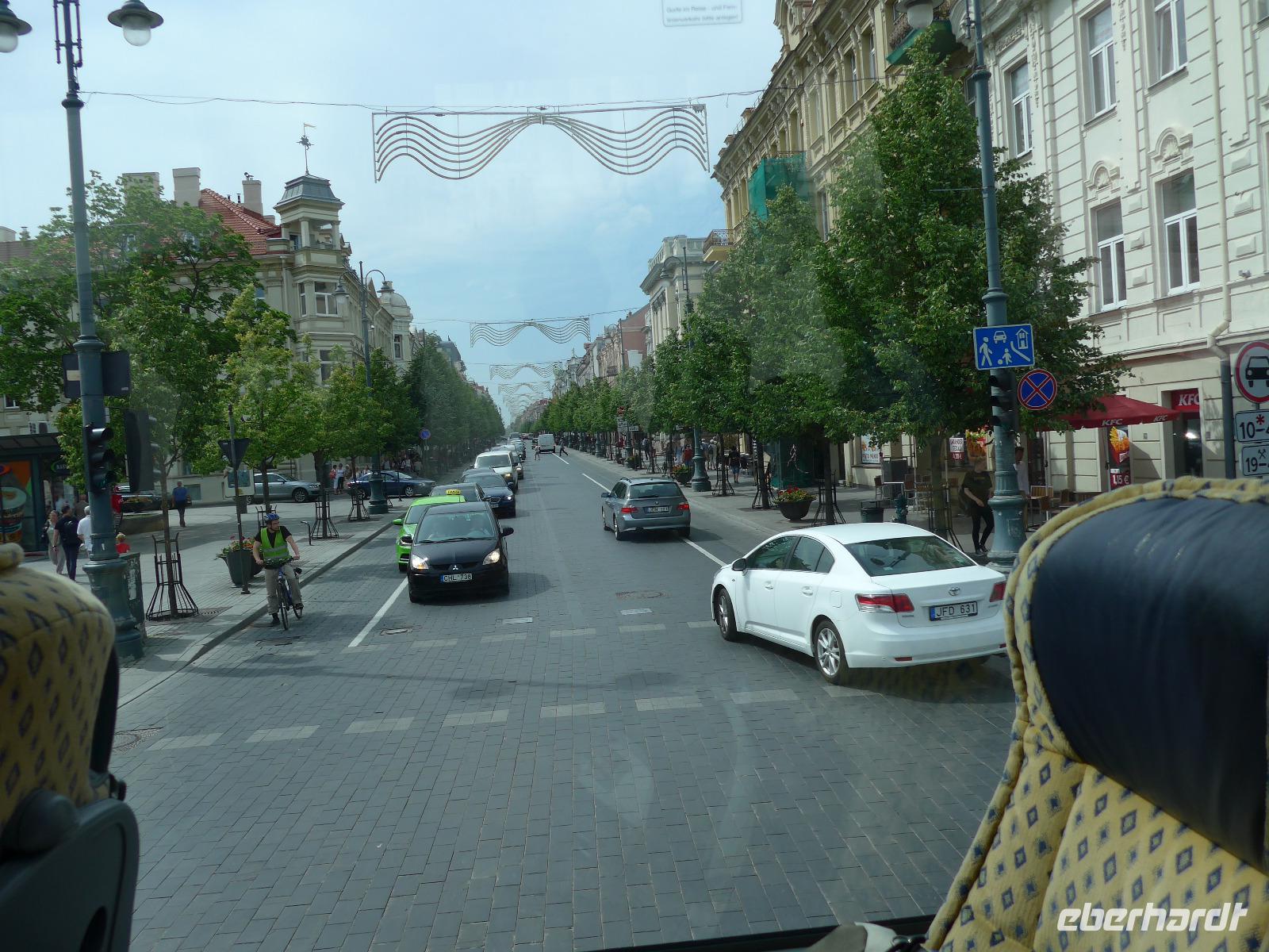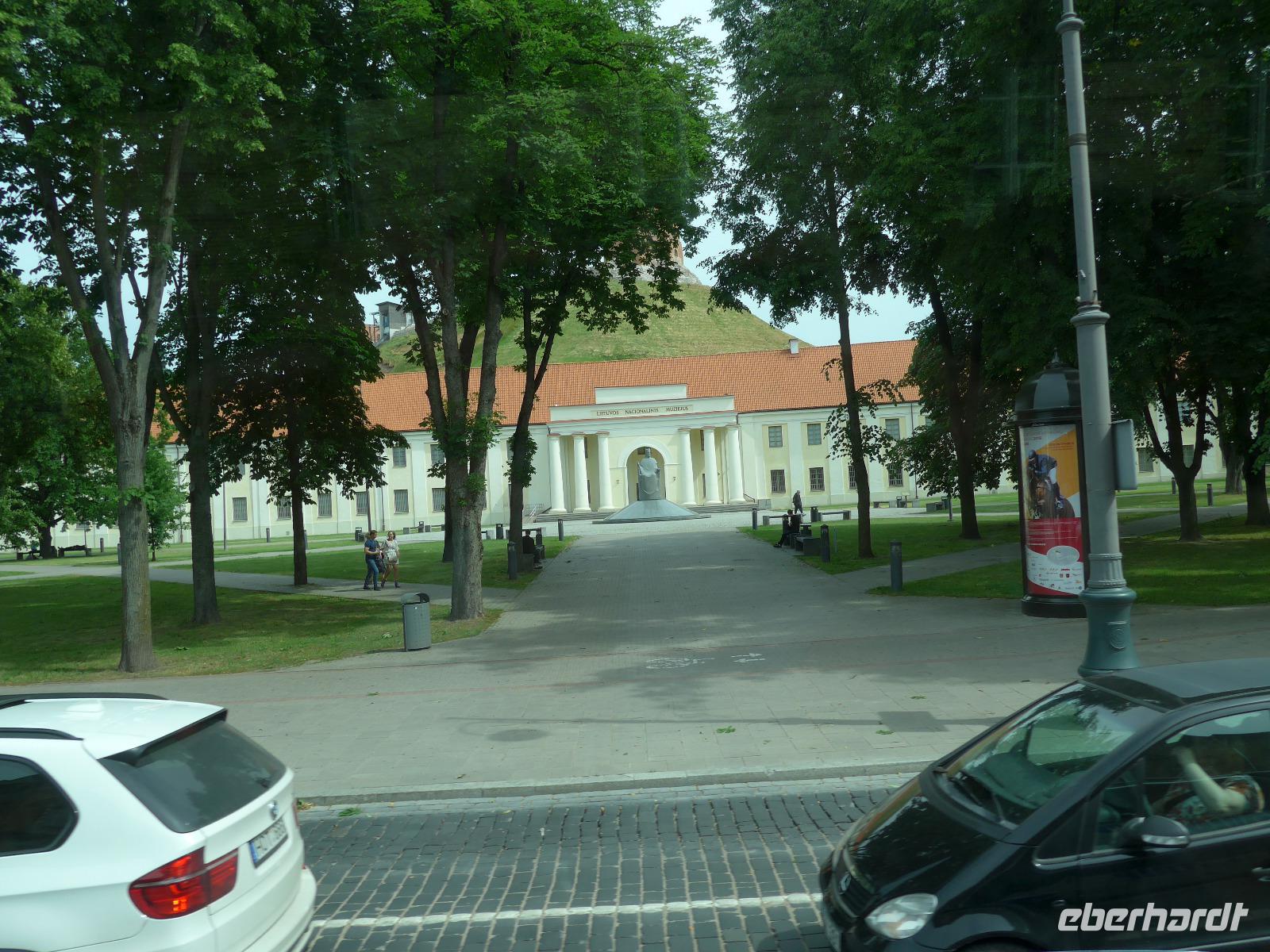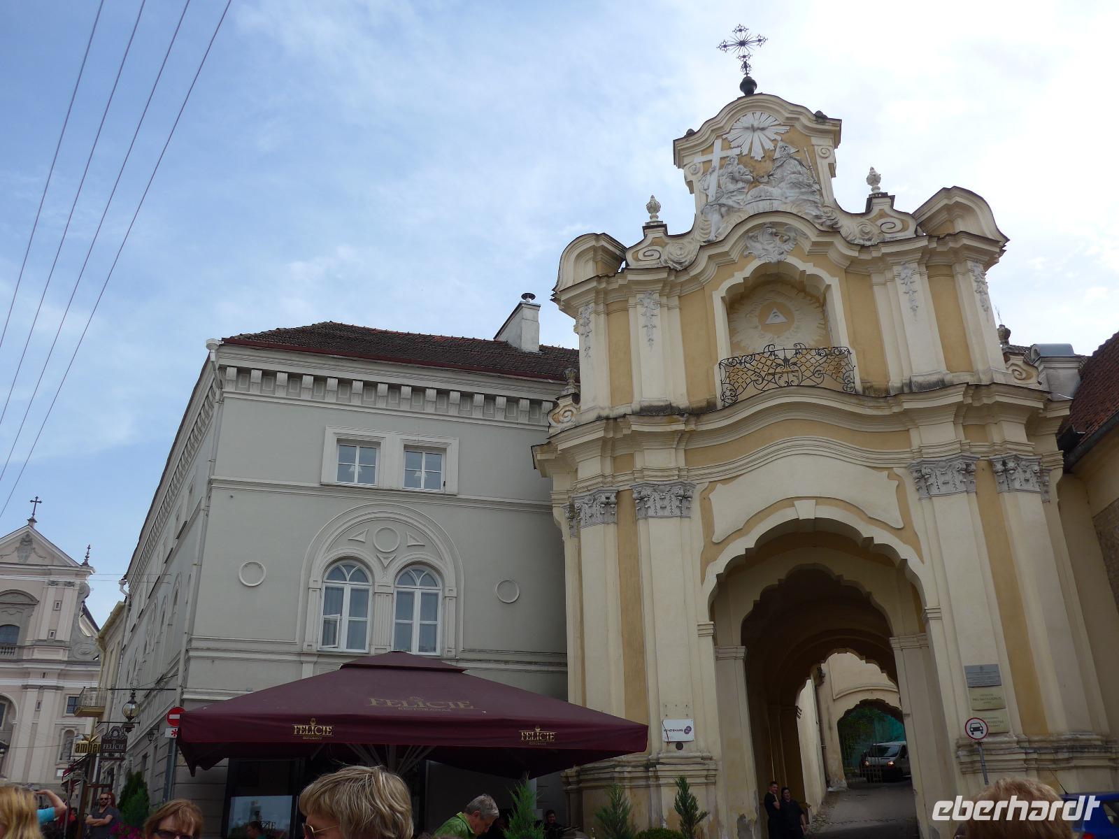 Weiter ging es mit dem Bus vorbei an der Kathedrale und der Peter und Paul Kirche zum Tor der Morgenröte, dem letzten noch erhaltenen Tor in die Altstadt. Bei der schwarzen Madonna hielten Pilger einen Gottesdienst ab und wir besuchten die russisch-orthodoxe Kirche. Am Rathausplatz endlich war Zeit für einen Kaffee. Dann spazierten wir weiter durch die alten Gassen zum Präsidentenpalast und zur Universität. Am Kathedralenplatz stand unser Bus und mit ihm fuhren wir ins Hotel EUROPA City. Beim Abendessen ging ein Gewitter mit Starkregen nieder und so fiel unser Abendspaziergang durch Vilnius buchstäblich ins Wasser.