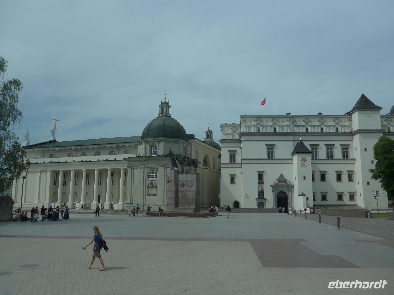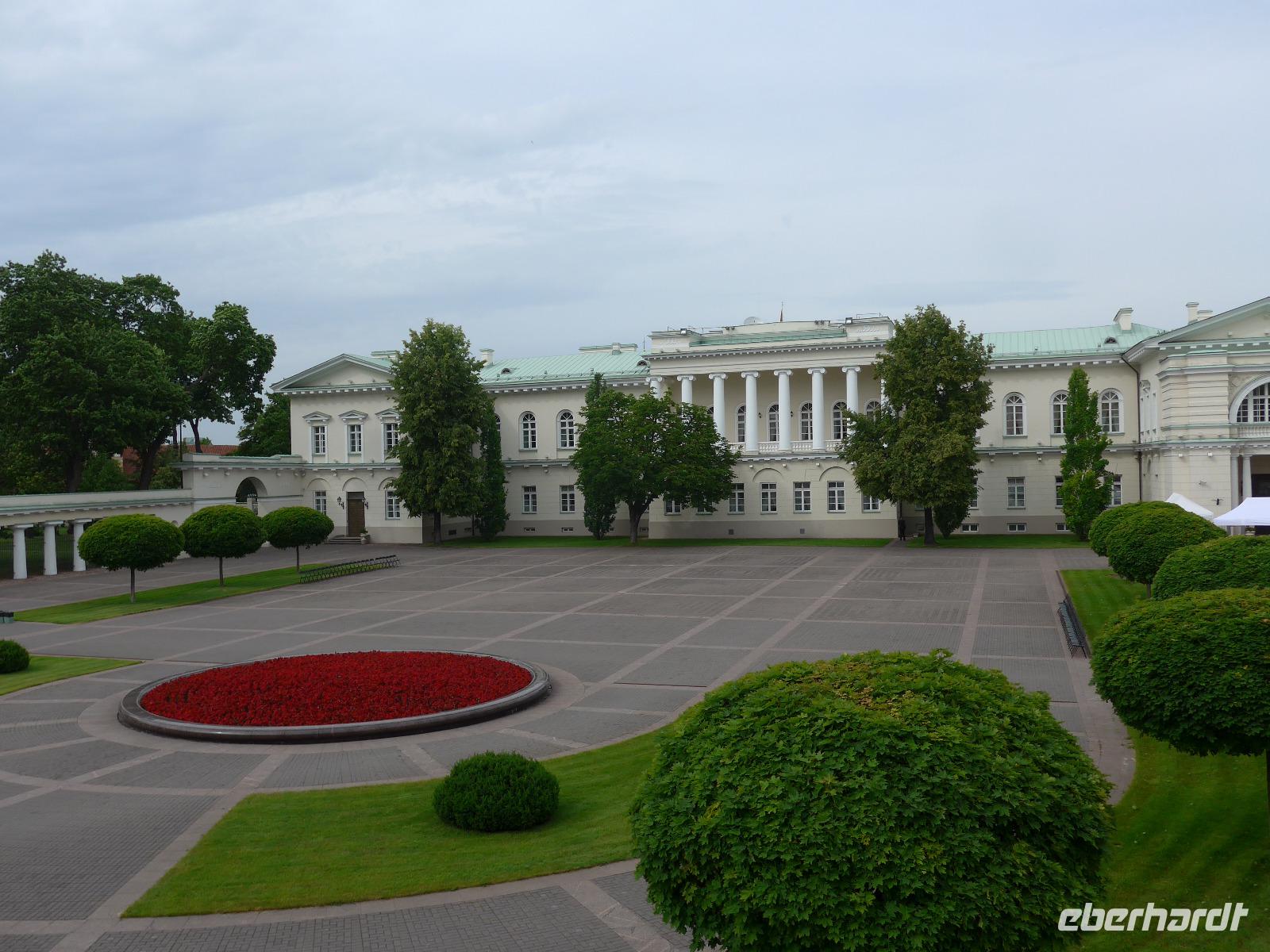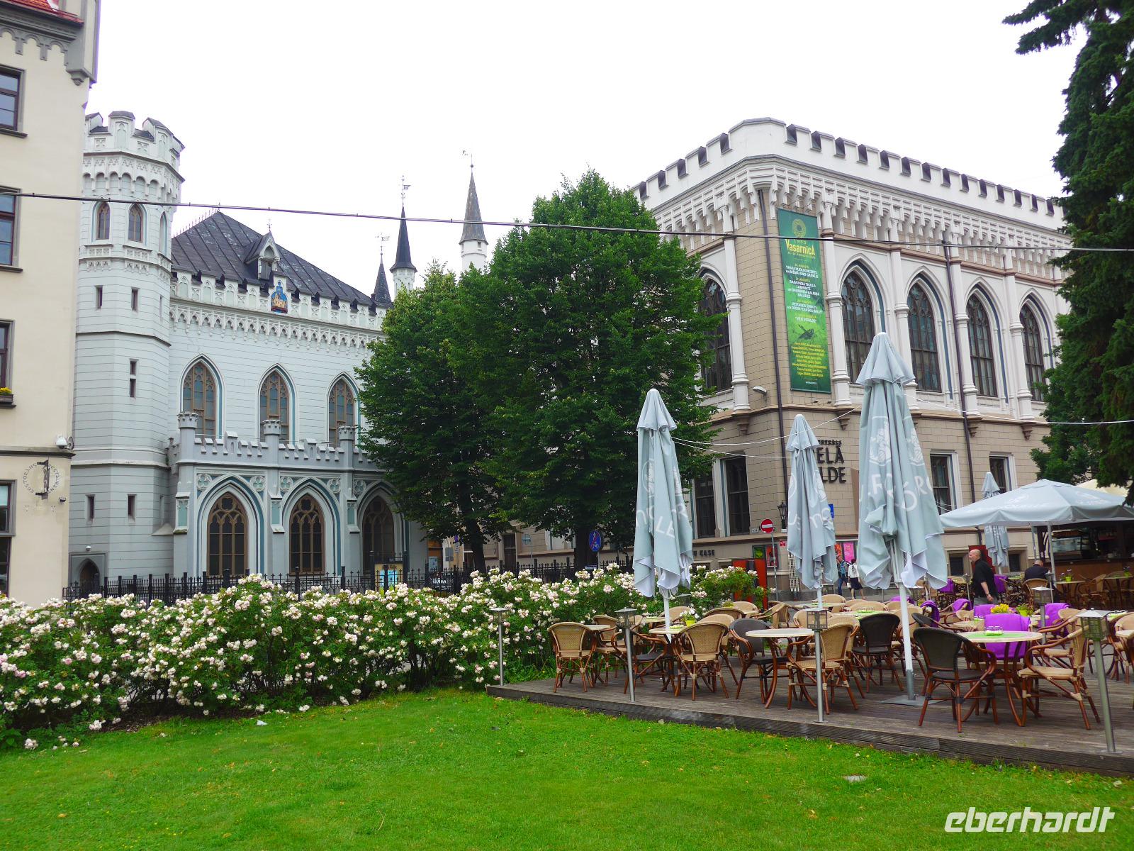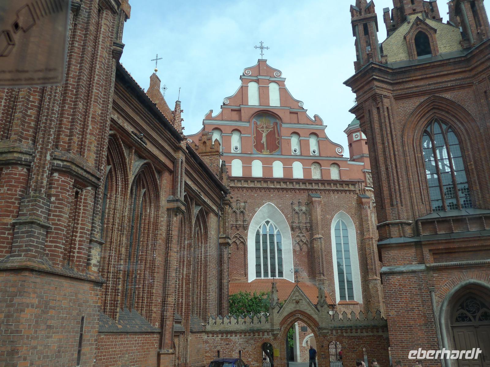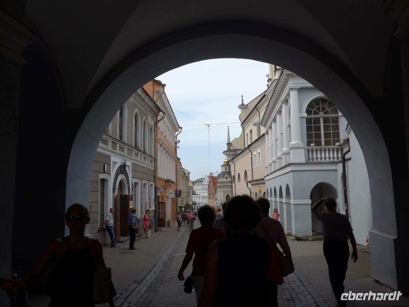 Weiter ging es mit dem Bus vorbei an der Kathedrale und der Peter und Paul Kirche zum Tor der Morgenröte, dem letzten noch erhaltenen Tor in die Altstadt. Bei der schwarzen Madonna hielten Pilger einen Gottesdienst ab und wir besuchten die russisch-orthodoxe Kirche. Am Rathausplatz endlich war Zeit für einen Kaffee. Dann spazierten wir weiter durch die alten Gassen zum Präsidentenpalast und zur Universität. Am Kathedralenplatz stand unser Bus und mit ihm fuhren wir ins Hotel EUROPA City. Beim Abendessen ging ein Gewitter mit Starkregen nieder und so fiel unser Abendspaziergang durch Vilnius buchstäblich ins Wasser.