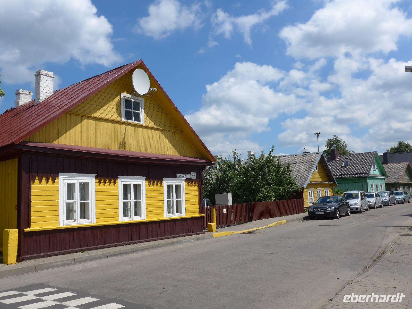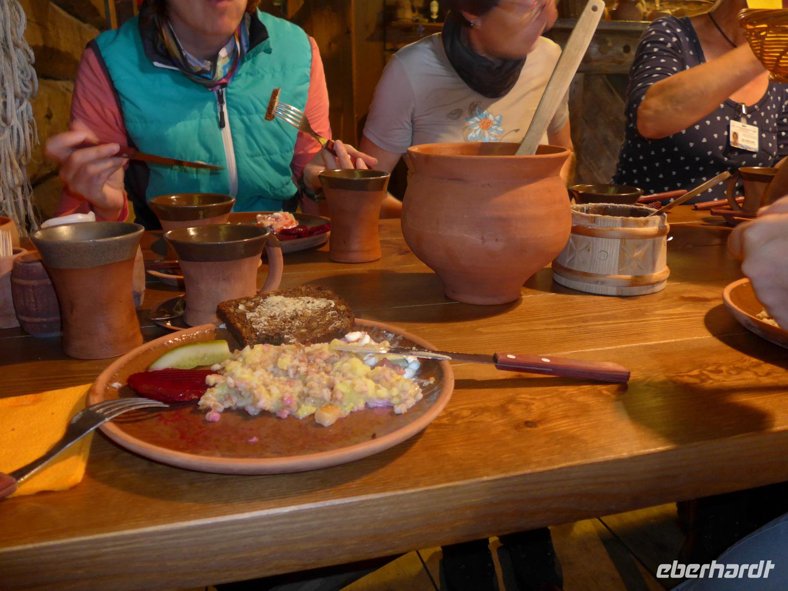 Nach dem Frühstück verluden wir unsere Koffer in den Bus und fuhren nach Trakai. Es war Samstag und Wochenmarkt. Für uns eine gute Gelegenheit, frisches Obst einzukaufen und den berühmten Baumkuchen Sakotis zu probieren. Aus Mehl, sehr vielen Eiern, Butter, Zucker, Honig und Schmand entsteht der Teig und die Leckerei ist in Litauen und Polen gleichermaßen bekannt. Danach führte uns die erste Wanderung am Ufer des Galve Sees entlang bis zur Wasserburg Trakai. Eine unberührte Natur mit Schwänen, vielen Vögeln und sogar einer Ringelnatter begeisterte alle. In der Wasserburg erwartete man unsere Gruppe zu einer fachkundigen Führung und wir erkundeten über viele Treppen die Räume in den einzelnen Stockwerken. Trakai ist die meistbesuchte Sehenswürdigkeit Litauens und entsprechend viele Besucher waren mit uns dort. Nach der Besichtigung machten wir uns endlich miteinander bekannt zu einem Gläschen 999 Kräuter und dem berühmten Baumkuchen Sakotis.