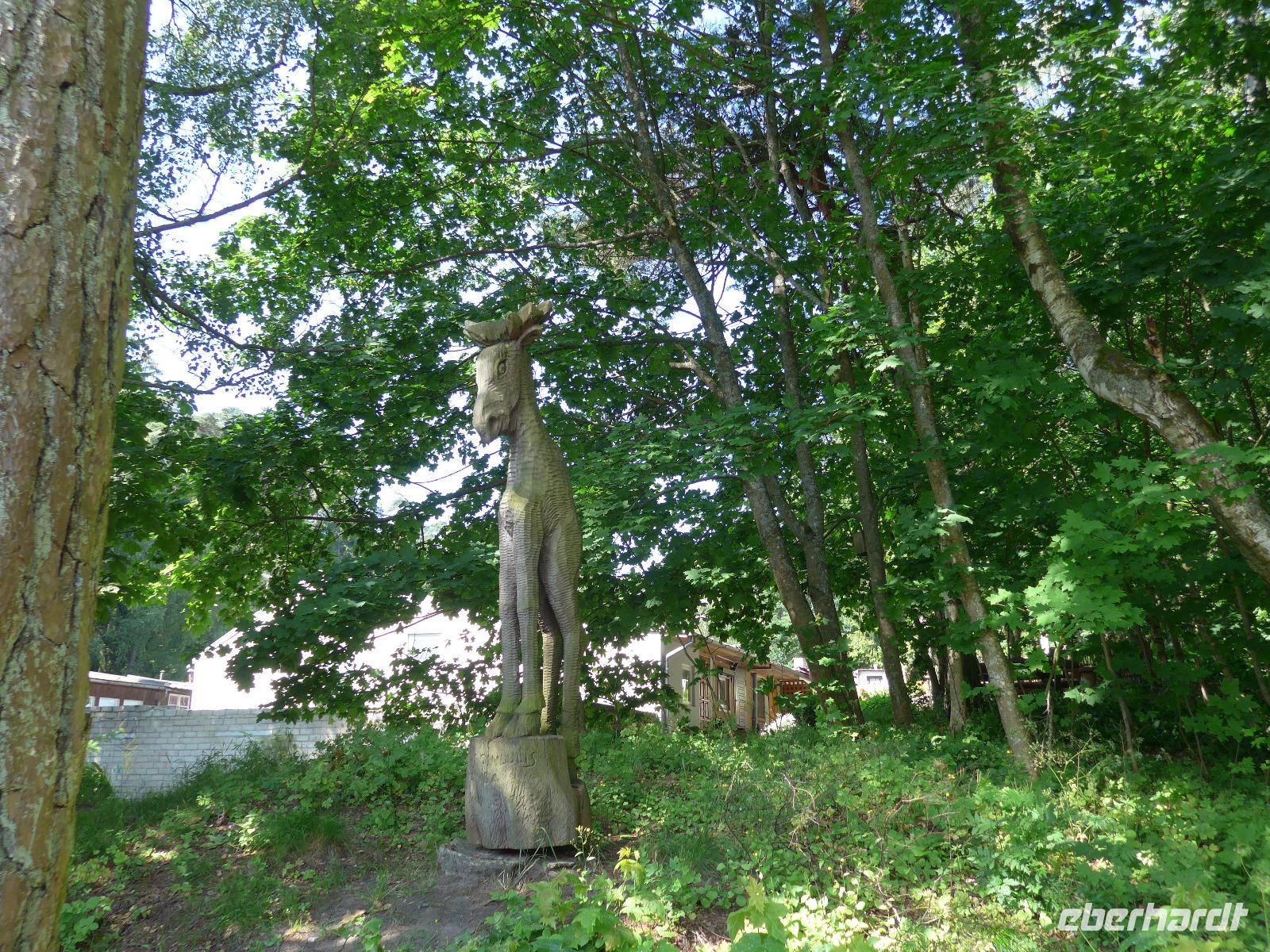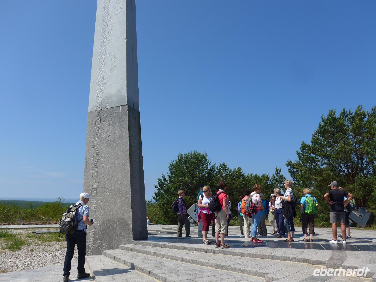 In Schwarzort stiegen wir wieder aus und wanderten auf den Hexenberg. Zahlreiche Holzfiguren säumten den Weg und Aija erzählte uns zu den Figuren die Märchen und Sagen. An der Hohen Düne verließen wir wieder unseren Bus und gingen auf die 52 Meter hohe Düne hinauf. Es bot sich ein guter Rundblick auf die Ostsee, das Haff und hinüber nach Russland. An der einst größten Sonnenuhr, die leider 1999 durch einen Sturm stark zerstört wurde, studierten wir die Zeichen für die Monate und Sonnenstände. Auf gut angelegten Wegen gingen wir durch die Wanderdünenlandschaft hinunter nach Nidden. Am Strand bei einem Riesenstuhl stellten wir uns auf zum Gruppenfoto und gingen dann weiter parallel zum Strand in den Ort. Aija hatte uns den frischen Räucherfisch Zuvis empfohlen und wir bereuten es nicht, ihn zu Mittag zu essen.