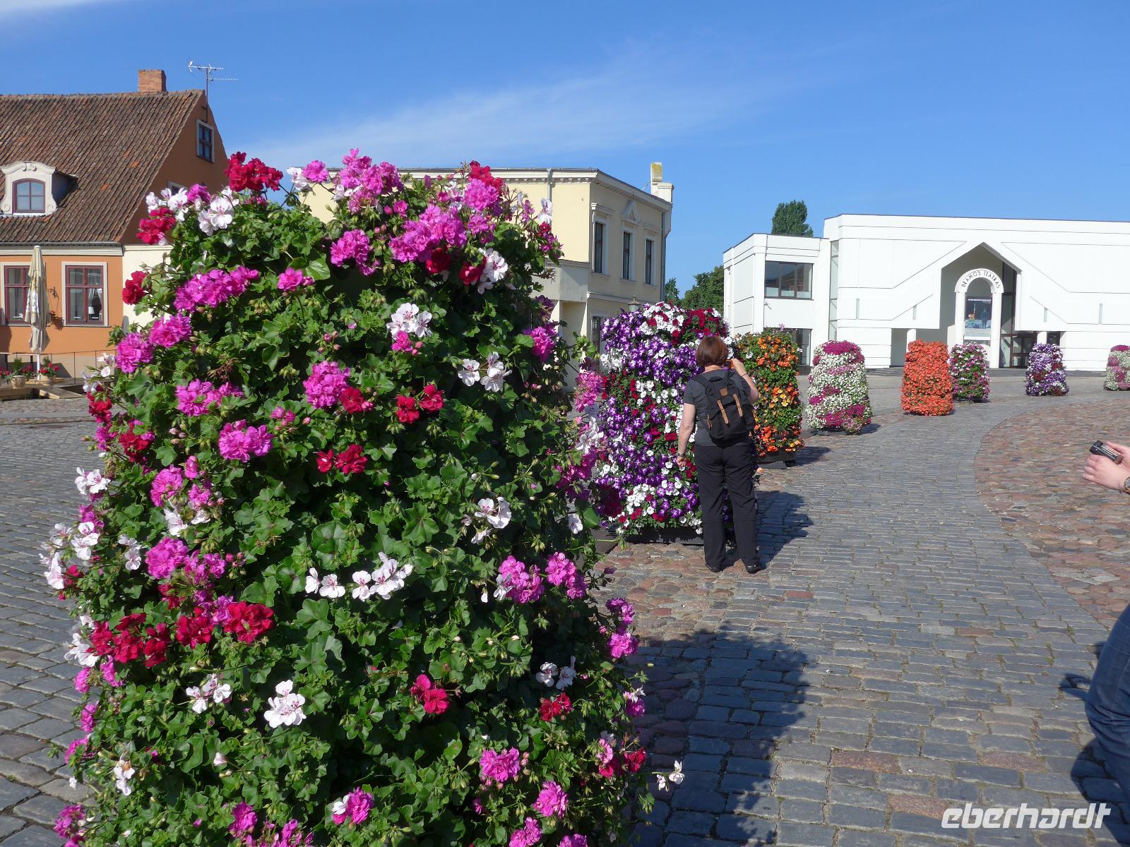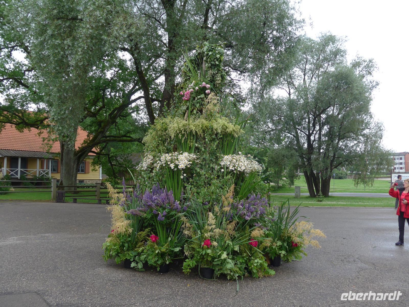 Sehr abgelegen am Waldrand lag unser Bauernhof. Aija hatte Wort gehalten und kam in ihrer lettischen Festtracht und die Bauerin freute sich genau so wie wir darüber. Die Familie lebt von der Bienenwirtschaft und der Ehemann stellt Schindeln für die Dächer her. Dafür hatte er eine Maschine gebaut und stolz zeigte er uns seine Produktion von Schindeln. Unser Essen gab es in einem alten Holzhaus und am Eingang wurden wir von der Tochter Marta empfangen und sie spielte uns auf der Kokle lettische Weisen. Die Kokle hat Ähnlichkeit mit der Zither. Im Raum war der Tisch für unsere Gruppe sehr liebevoll gedeckt und es gab Sauerampfersuppe, Eintopf mit Fleisch, Gemüse und Kraut, dazu verschiedene Salate und Gemüse, Aroniabeerensaft und als Nachtisch Brotsuppe. Es war sehr schmackhaft und reichlich und nach dem Essen konnten wir von der Bäuerin noch Honig und Bienewachskerzen kaufen. Dann gings auf die Wiese zum Blumen pflücken. Marta und Aija zeigten uns, wie man ganz einfach einen Blumenkranz binden kann. Einigen gelang das bravorös, andere brauchten Hilfe von den beiden Frauen. Es wurden viele Fotos gemacht und Aija erzählte uns, daß die Kränze nun ein Jahr aufbewahrt werden müssen und erst im nächsten Jahr im Johannisfeuer verbrannt werden. Ungern verließen wir den gemütlichen Bauernhof, aber unser Fahrer brauchte seine Ruhezeit. Zurück in Cesis machten einige noch einen Verdauungsspaziergang und gelangten eher zufällig in den Schloßhof, wo ein grandioses Tanz- und Musikfest stattfand.