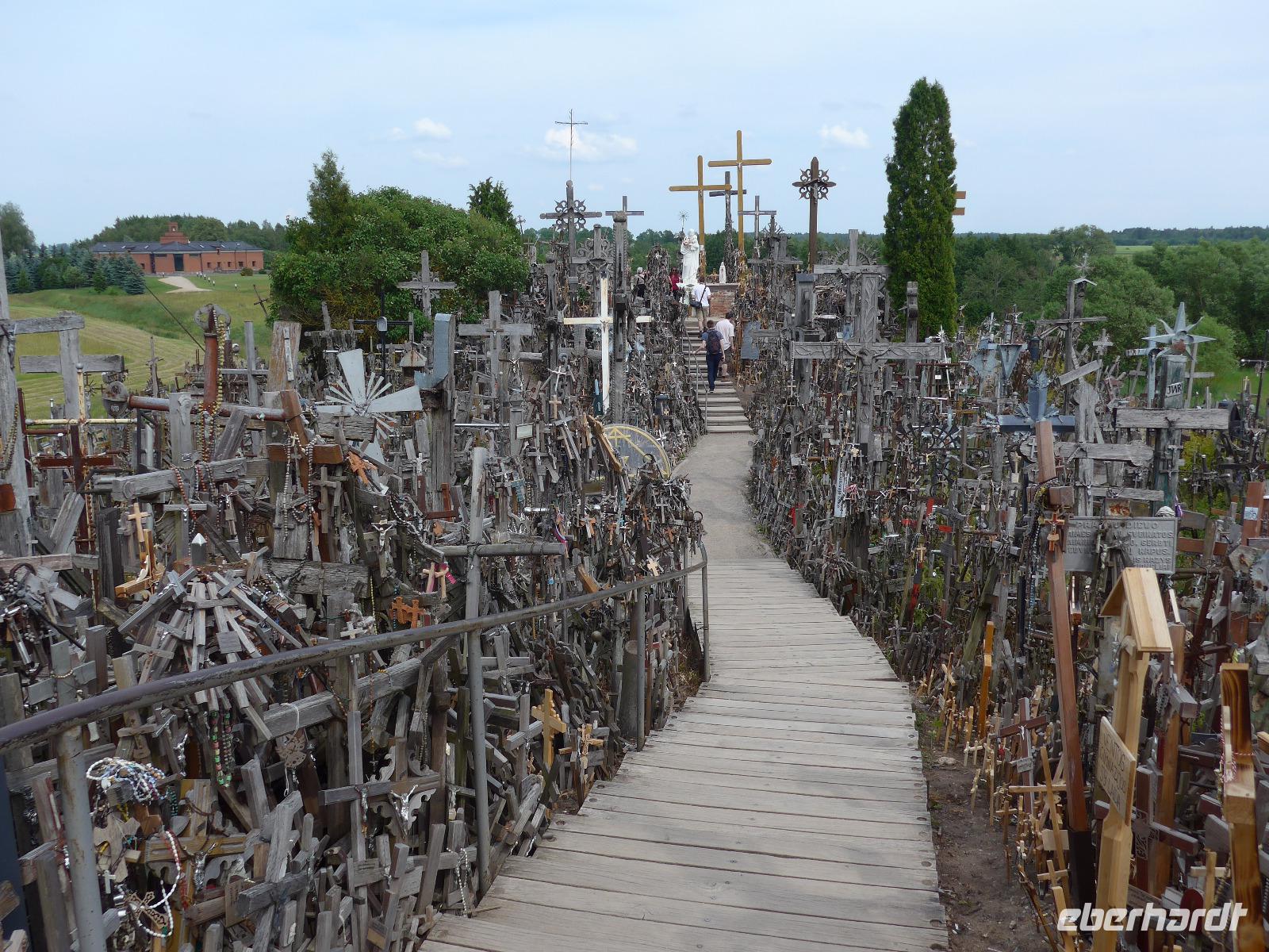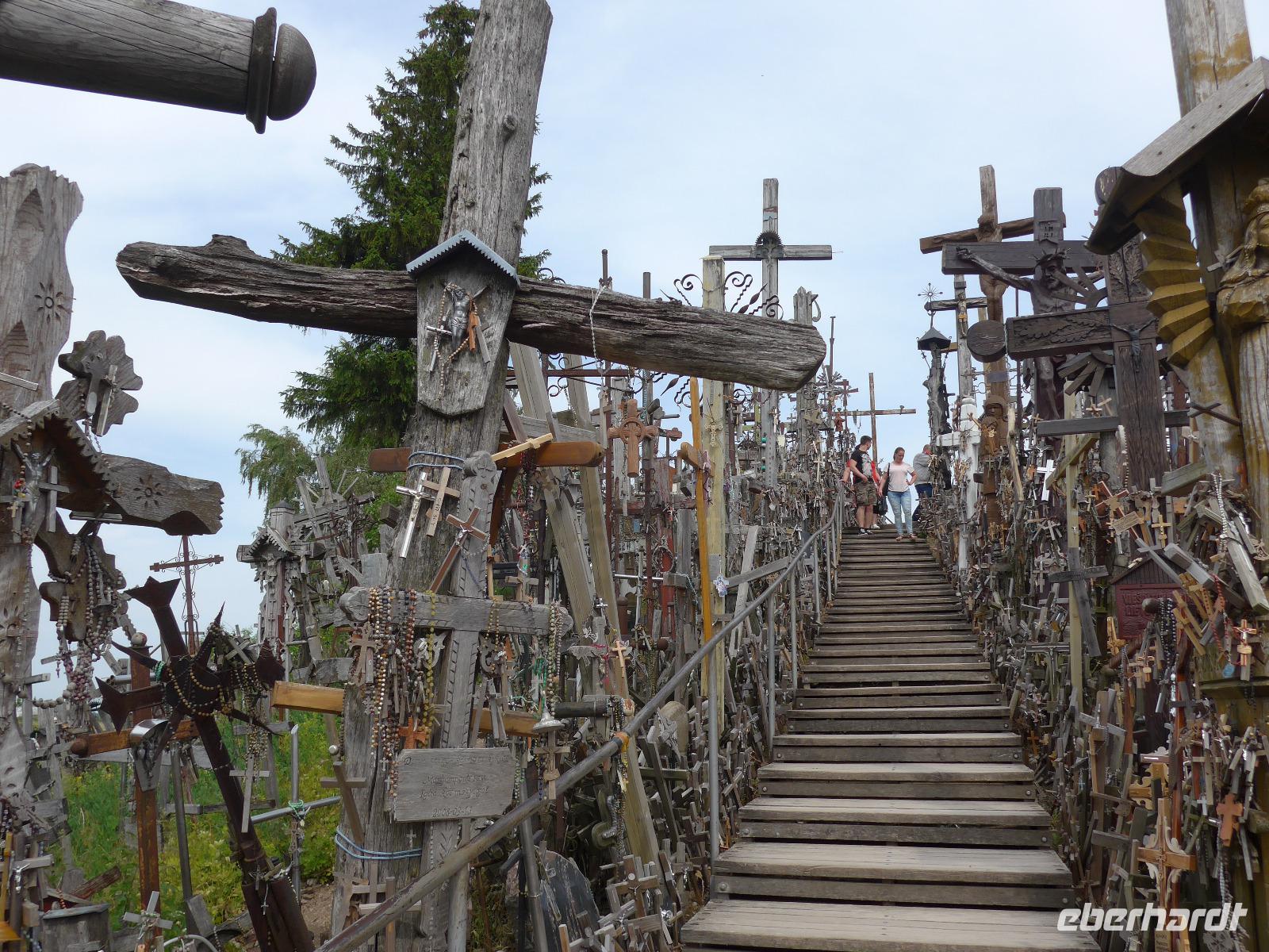 Das nächste Ziel war der Berg der Kreuze kurz vor der lettischen Grenze. Mitte des 19. Jahrhunderts begann man an dieser Stelle mit dem Aufstellen von Kreuzen für die Toten der Aufstände gegen die Russen. In den Folgejahren wurden es immer mehr Kreuze und um 1940 zählte man schon 400. In der Sowjetzeit wurde der Hügel viermal platt gemacht, aber kurz darauf wurden immer wieder Kreuze aufgestellt. Inzwischen steht hinter dem Berg seit 1993 ein Kloster und der Berg der Kreuze ist längst ein Wallfahrtsort geworden.