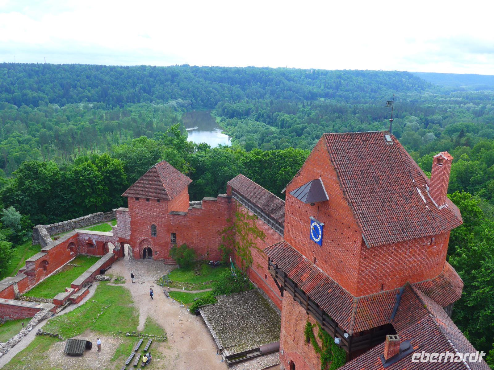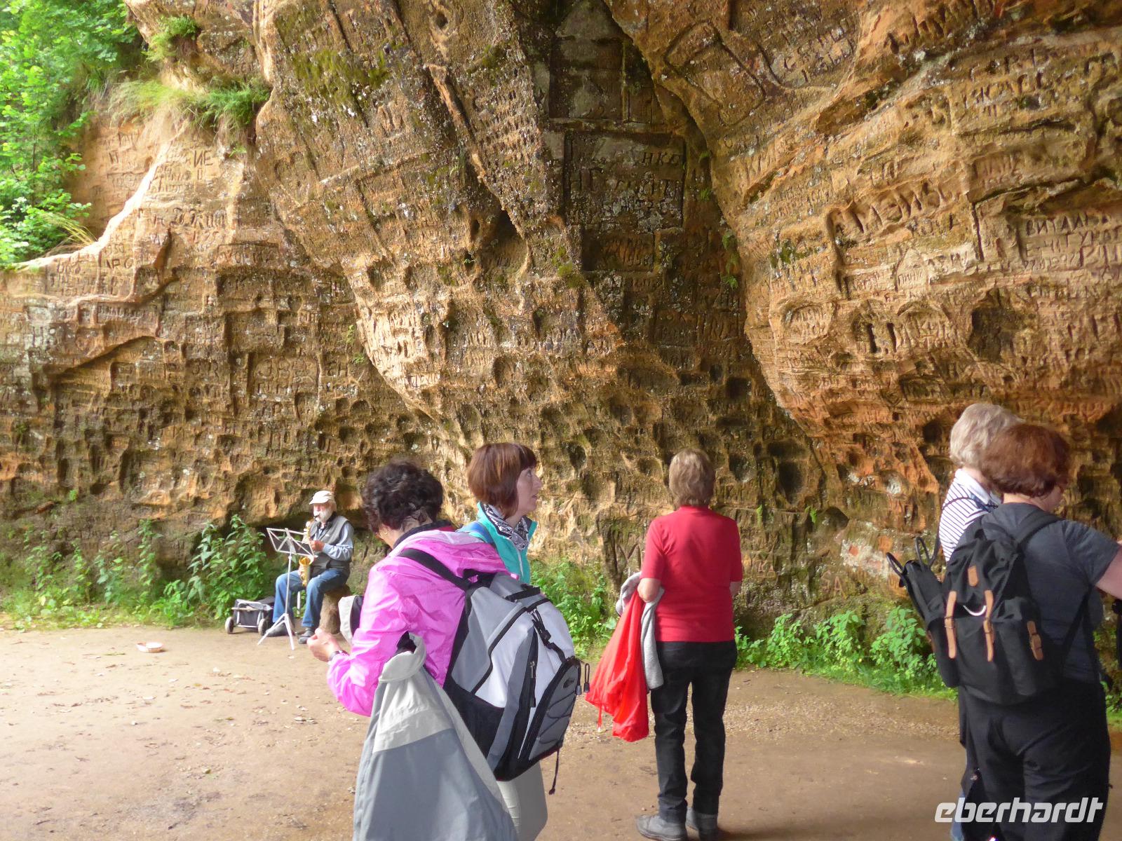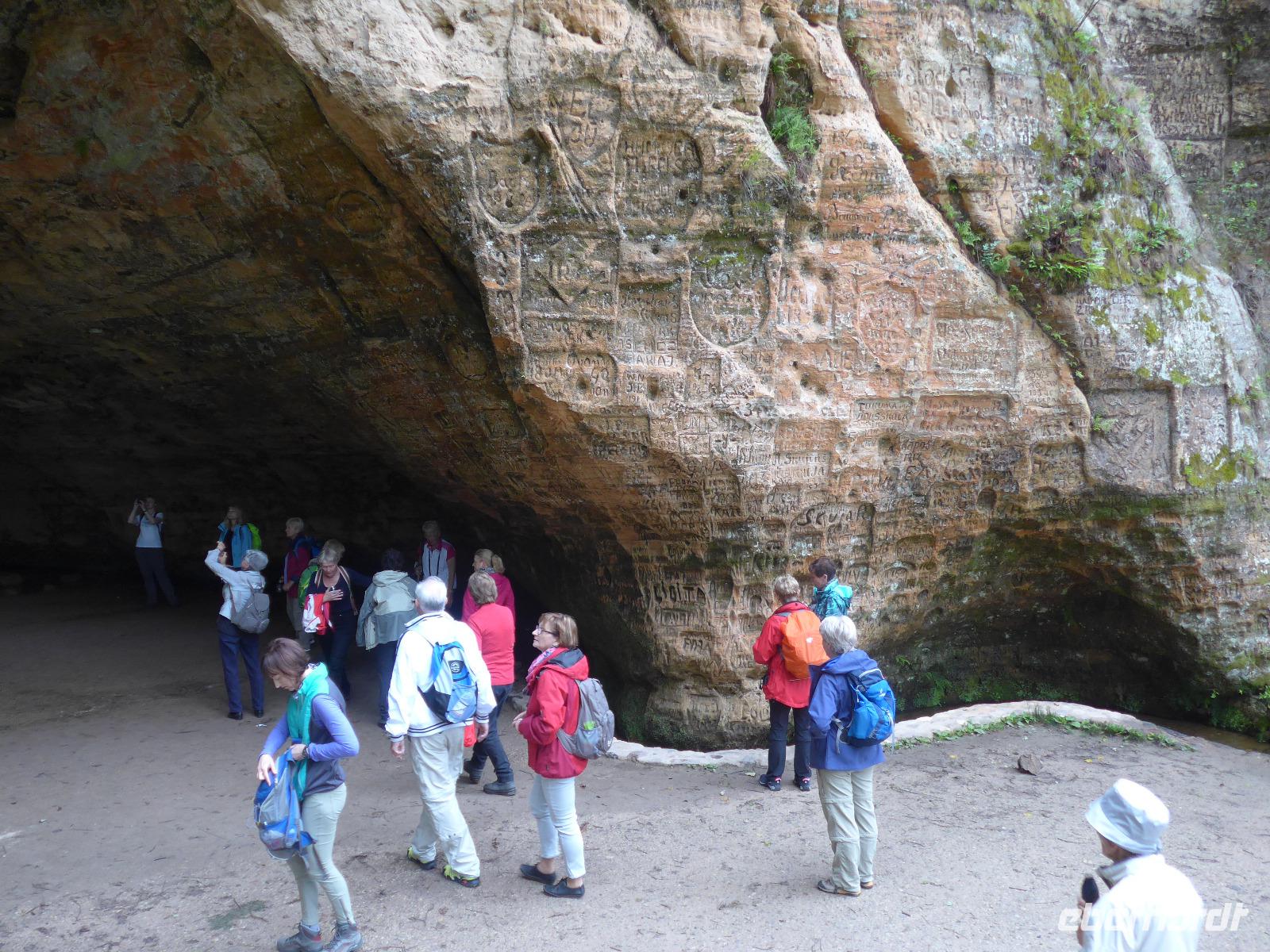Über die 13 km lange Freiheitsstrasse verließen wir Riga vorbei an alten Fabriken, wo einst u. a. Fahrräder und die berühmte Minox-Kamera produziert wurden. Unsere erste Station im Gauja-NP war Sigulda - die Wintersportstadt Lettlands. Auf der Bob- und Schlittenbahn trainieren berühmte Sportler und auf den Hängen kann man Ski fahren. Wir begannen unsere Wanderung an der Seilbahnstation, die beide Seiten der Gauja verbindet. Auf einem gut hergerichteten Weg gingen wir steil hinunter ins Tal der Gauja und am Fluß entlang bis zur Gutmannshöhle. Imposante, bis zu 80 m hohe Buntsandsteinwände säumten den Weg. Die Höhle selbst ist ein Mundloch und diente als Lager und Versteck. Die Wände sind über die Jahrhunderte mit Wappen und Inschriften "verziert" worden. Mit dem Bus fuhren wir nach der Besichtigung hinauf nach Turaida.