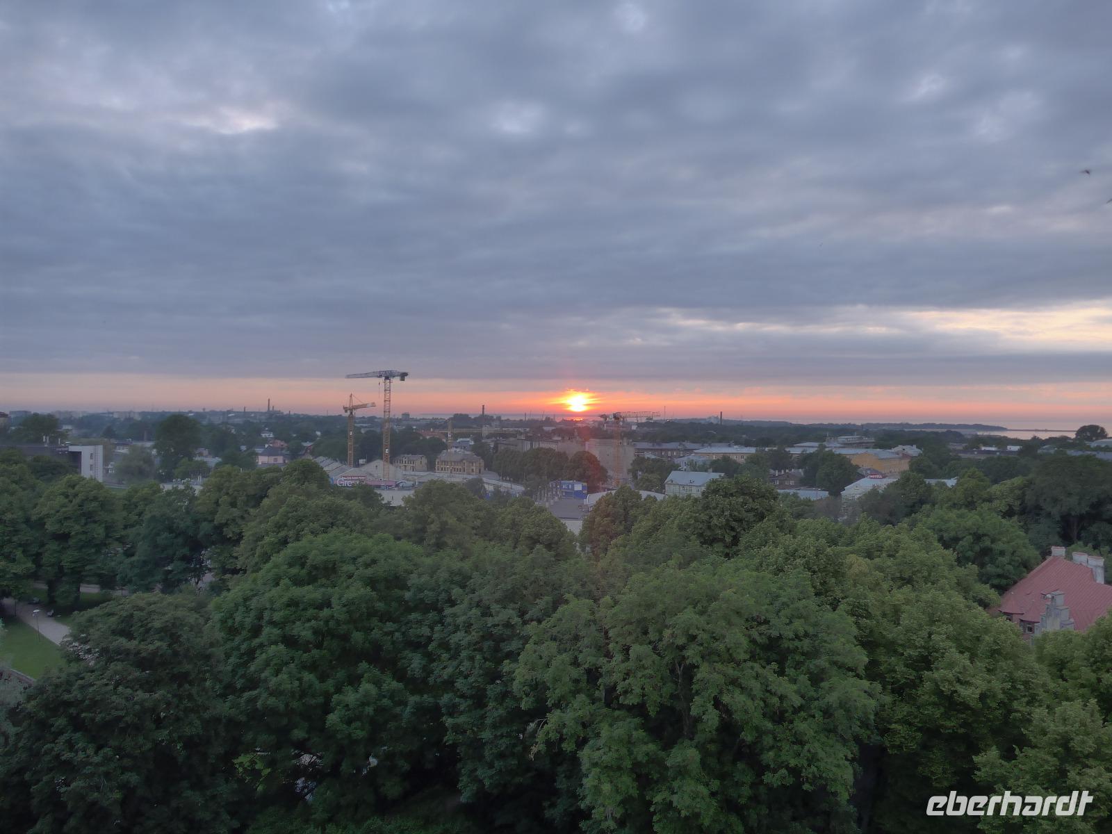 Am Abend trafen wir uns, um gemeinsam nochmals in die Altstadt zu gehen und unseren letzten Abend zu verbringen. Wir hatten für unsere Gruppe am Vorabend in der Olde Hanse reserviert und dort empfing man uns mit einem Schnäpschen. Dann wählten alle die Getränke und das Essen und das Honig-, Kräuter- oder Zimtbier schmeckte wieder vorzüglich. Wir hatten sehr viel Spaß und einen wundervollen Abend verbracht. Ein Teil der Gruppe ging ein letztes Mal zu den Aussichtsterrassen und über die Stufen hinunter und durch den Park zurück. Aija hatte uns die Aufgabe gestellt, zu erkunden, wann die estnische Flagge denn abends eingeholt wird vom Turm des langen Herman. Zum Sonnenuntergang 22.44 Uhr und wahrscheinlich extra für uns erklang die estnische Nationalhymne und die Fahne wurde gut sichtbar für uns eingeholt. Das war das I-Tüpfelchen an diesem schönen Abend.