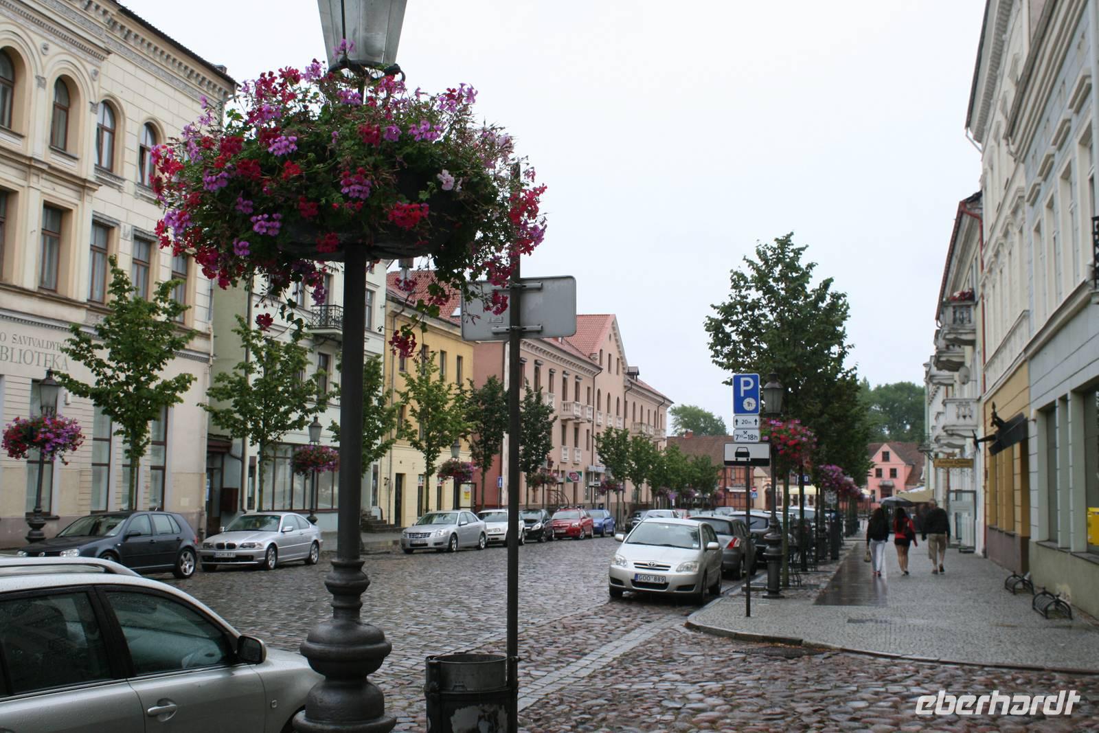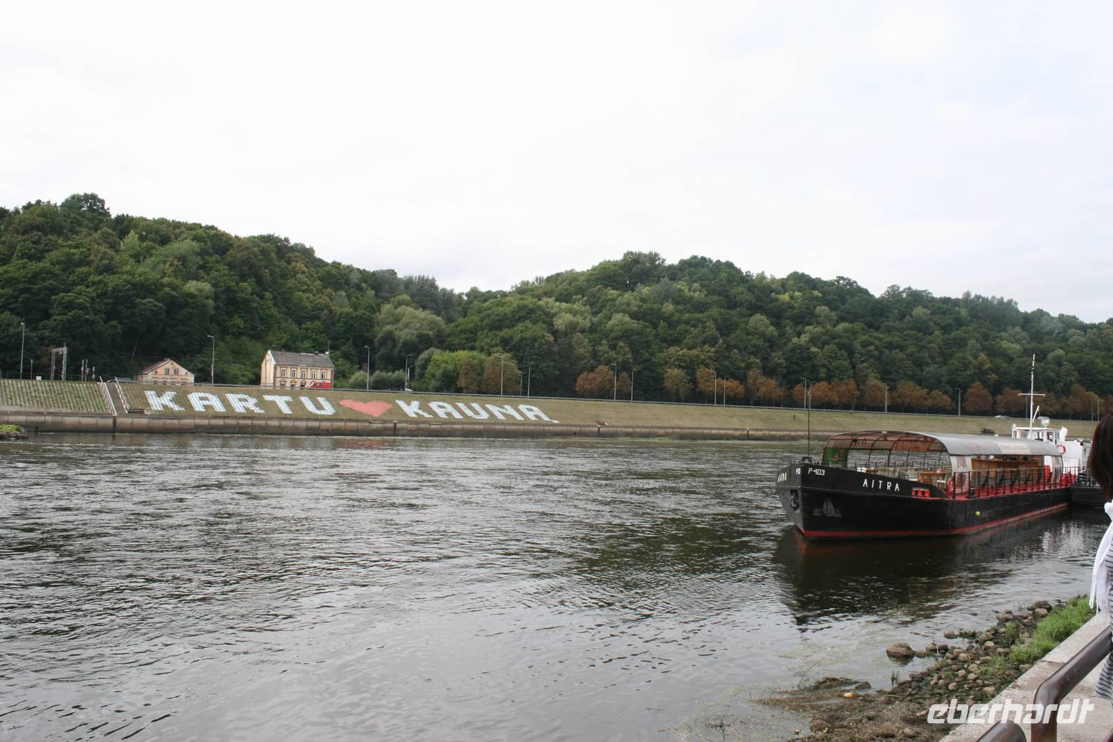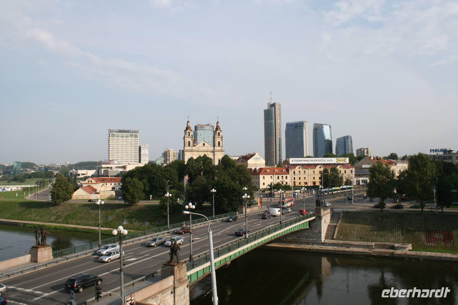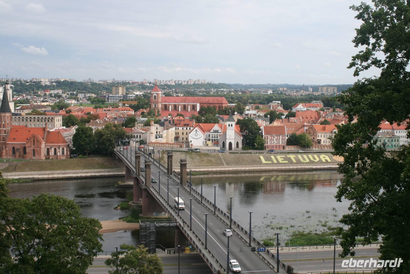 Heute verließen wir unser Hotel und machten uns auf den Weg nach Klaipeda, auch als Memel bekannt. Unterwegs besuchten wir Kaunas, die zweitgrößte Stadt Litauens. Von einem Aussichtspunkt bekamen wir einen schönen Eindruck der Stadt und dem Fluss Memel, danach erkundeten wir die Innenstadt zu Fuß und besuchten die Vytautas-Kirche am Ufer der Memel. Am Rathausplatz, mit seinem skurrilen Kunstwerk aus weißen Fahrrädern, die geschmückt mit Blumen an einer großen Säule hingen, machten wir unsere Mittagspause. In den kleinen Straßen gab es dutzende von Cafés und Restaurants, in denen leckere Kleinigkeiten angeboten wurden. Später ttrafen wir vor der gewaltigen aber stark verfallenen St. Georgskirche einen Franziskanermönch und spazierten an der großen Burg vorbei. Da gerade Wochenende war, sahen wir zahlreiche Hochzeitsgesellschaften in festlicher Kleidung, die die halbe Innenstadt für sich erobert zu haben schienen. Weiter ging die Fahrt nach Klaipeda, wo wir das berühmte Ännchen von Tharau besuchten und in den umliegenden Straßen einen kurzen Spaziergang mit Regina unternahmen. Leider zwang uns der Regen früh zurück in den Bus und so fuhren wir schließlich zu unserem Hotel im Stadtzentrum, wo wir uns - nachdem wir die etwas eigene Technik der Fahrstühle begriffen hatten - nach diesem ereignisreichen Tag ausruhen und zu Abend essen konnten.