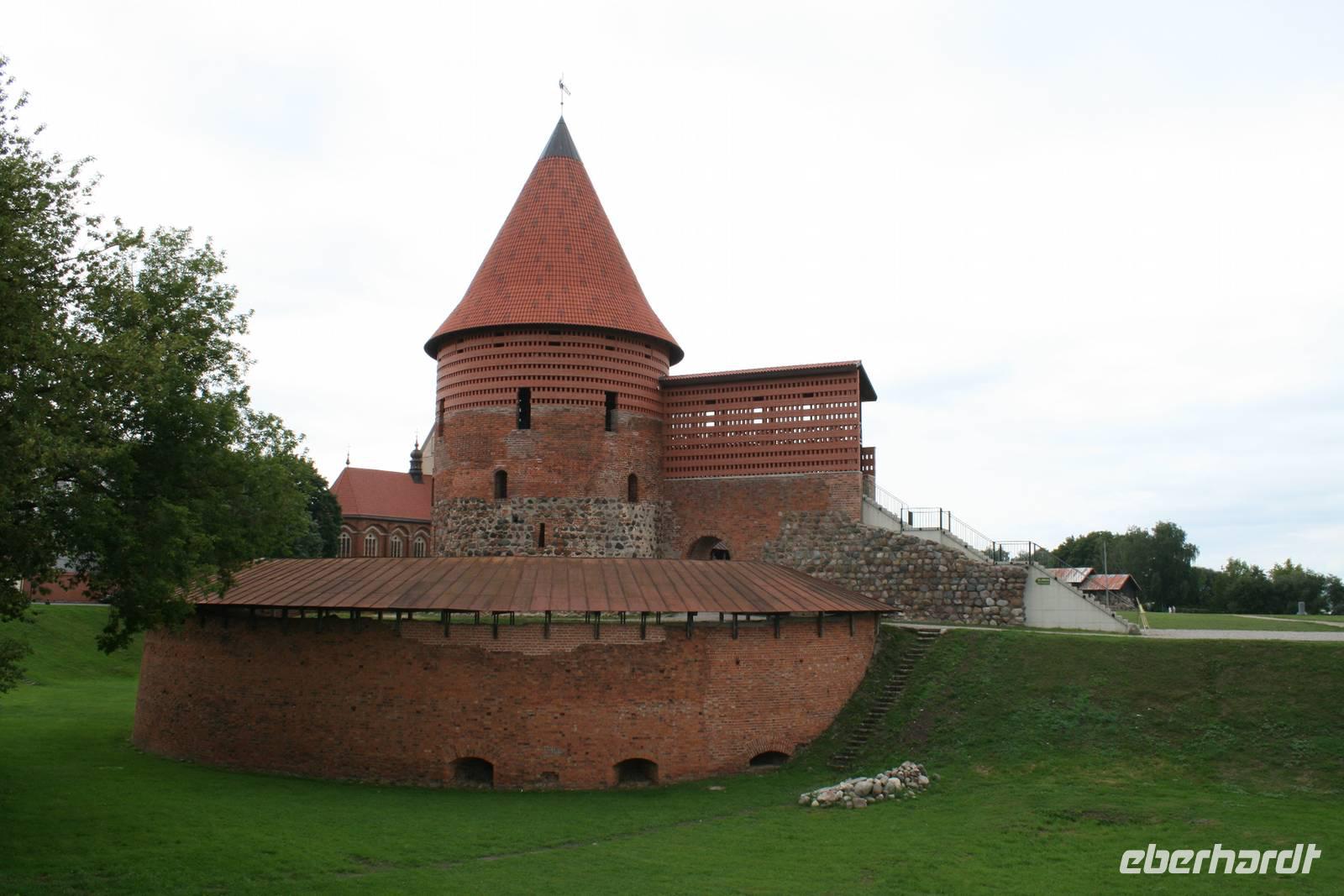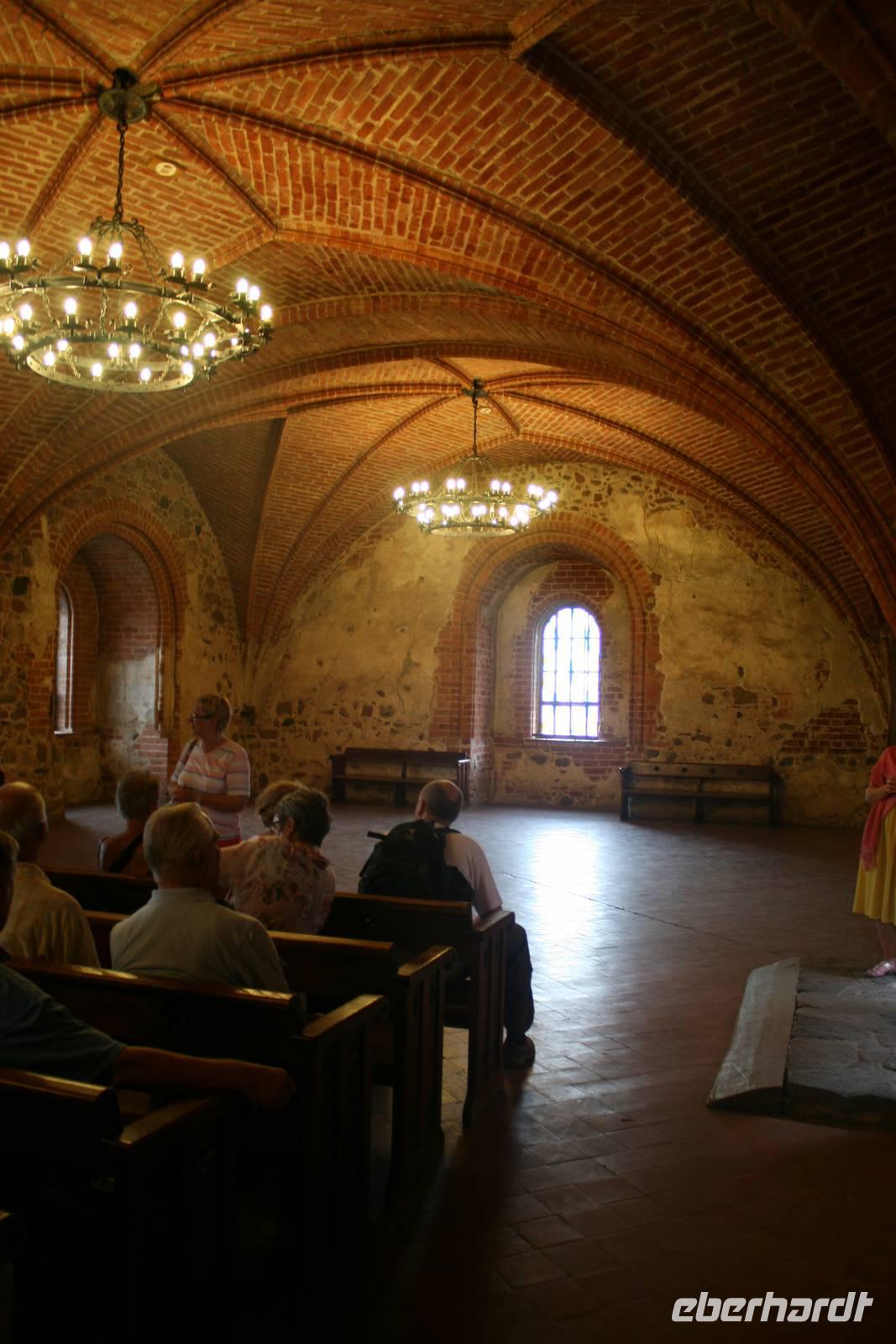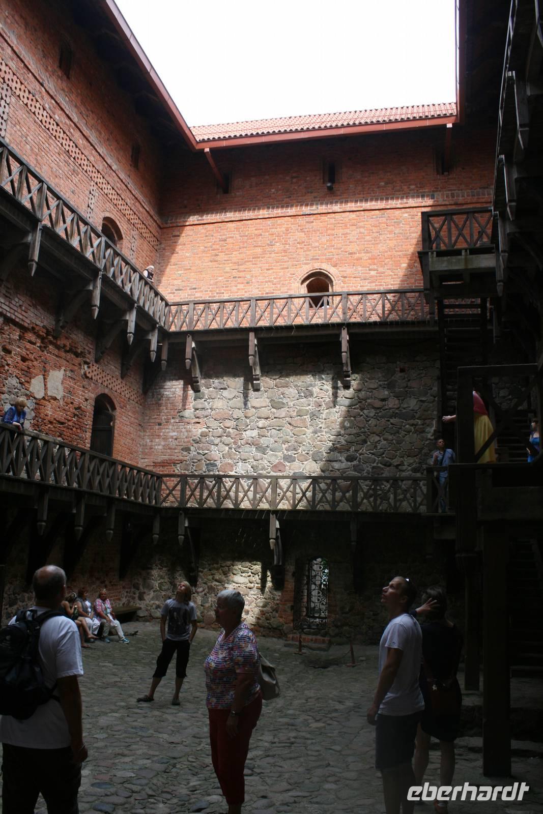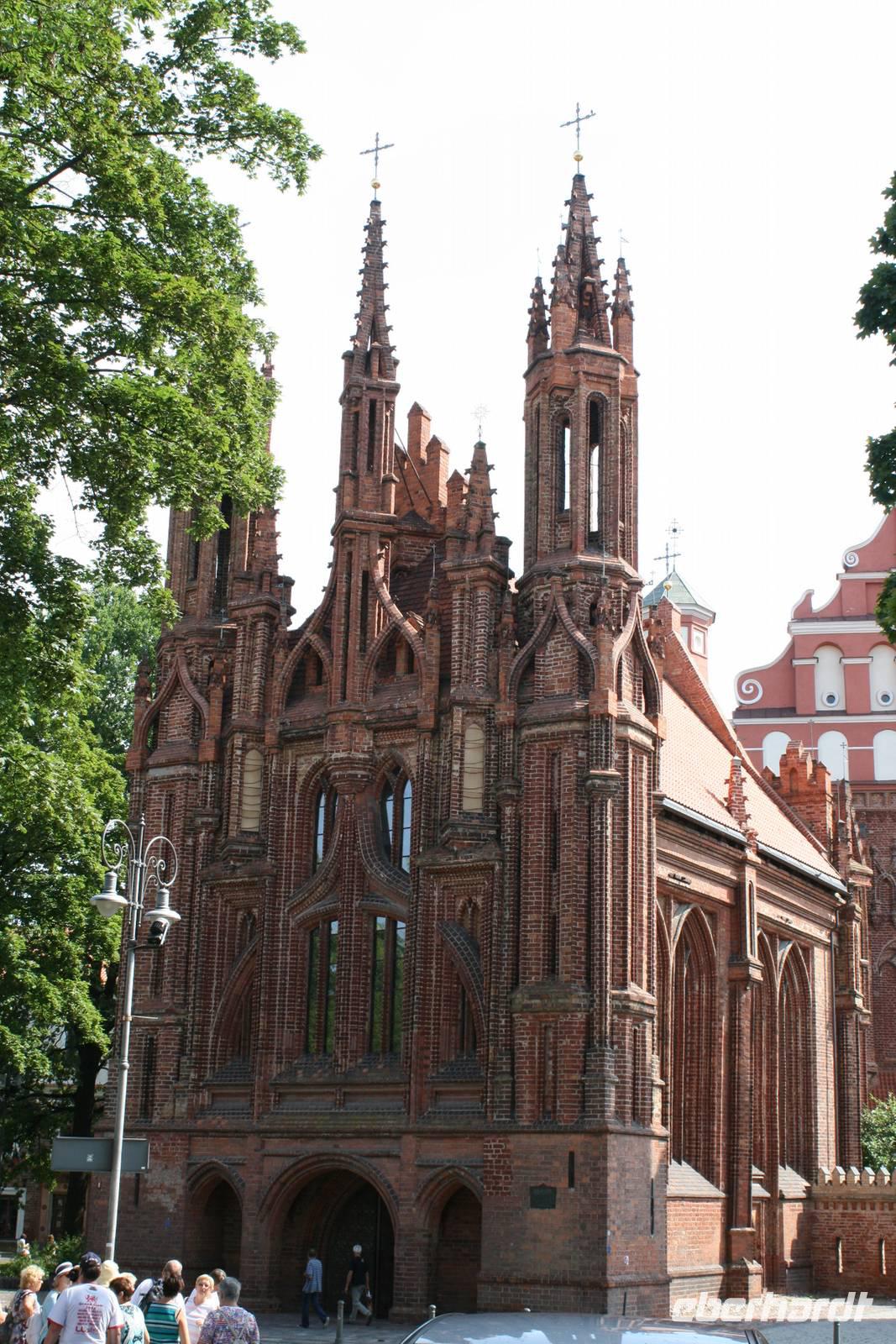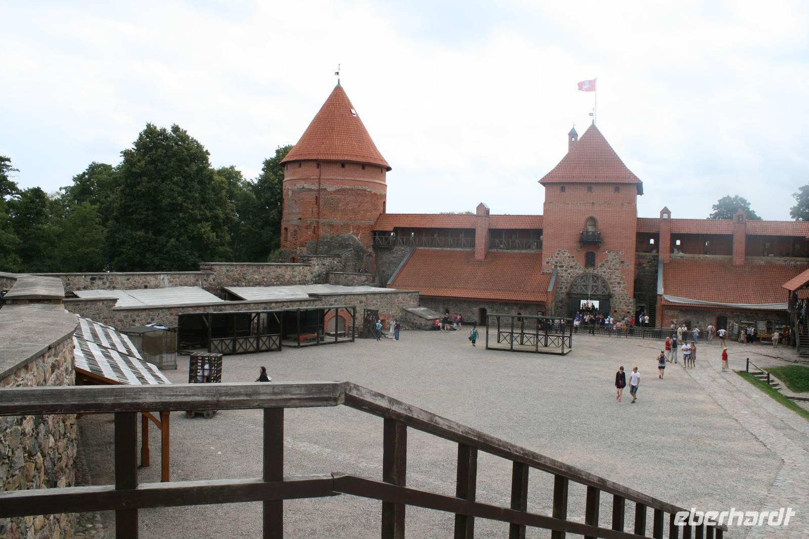 Unser erster Tag in Litauens Hauptstadt begann mit einer Stadtrundfahrt. Regina zeigte uns die Peter- und Paulkirche mit ihren barocken Stuckelementen. Außerdem besuchten wir die große, von außen eher griechisch anmutende Kathedrale und besichtigten dort den reich dekorierten Barock-Altar. Weiter ging es zum Gelände der Universität bis zum Präsidentenpalast. Wir schlenderten durch die Literatengasse mit den vielen bunten Kacheln, die in die Wände eingelassen sind und an große Schriftsteller erinnern und machten einen Stopp an der St. Annen-Kirche, einem architektonischem Beispiel der Backsteingotik. Auf dem Rathausplatz hatten wir Zeit, in eines der zahlreichen Restaurants oder Bistros einzukehren, um einheimische Spezialitäten wie zum Beispiel Rote-Beete-Suppe zu probieren. Danach fuhren wir nach Trakai und besichtigten die berühmte Wasserburg, die auf dem See zu schweben scheint. Regina führte uns treppauf treppab durch die verschiedenen Räume mit ihren vielfältigen Ausstellungsstücken aus der bewegten Geschichte des Bauwerks. Auf den Rückweg hatten wir Zeit, am See entlangzuschlendern und uns in den vielen Geschäften der Uferpromenade Souveniers aus Leinenstoff oder Bernstein zu kaufen. Wer wollte, konnte auch ein leckeres Eis essen, denn die Sonne schien herrlich. Zurück in Vilnius, aßen wir im luxuriösen Neringa-Restaurant zu abend und spazierten in der warmen Abendluft zurück zum Hotel.