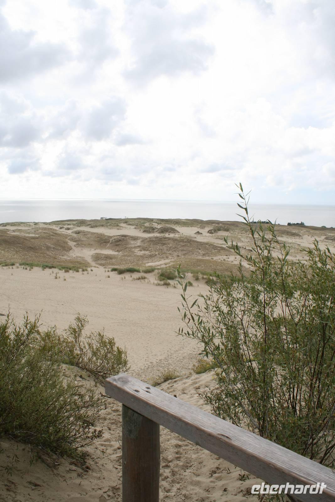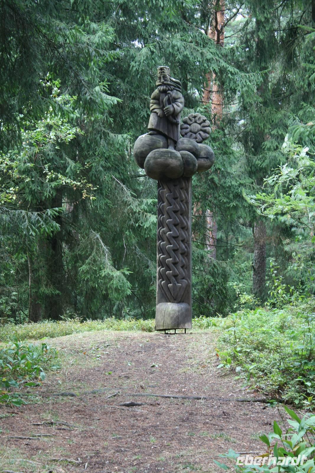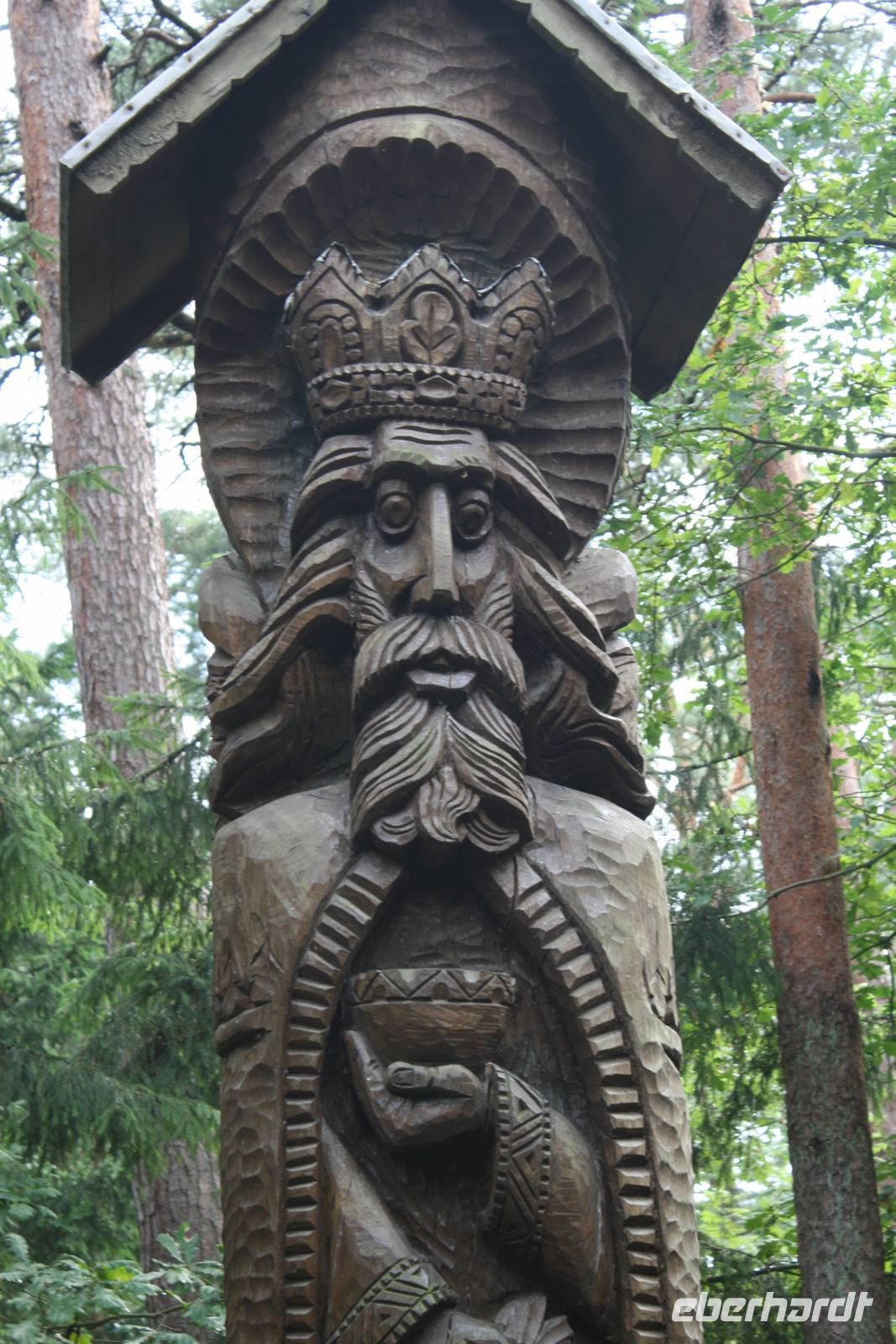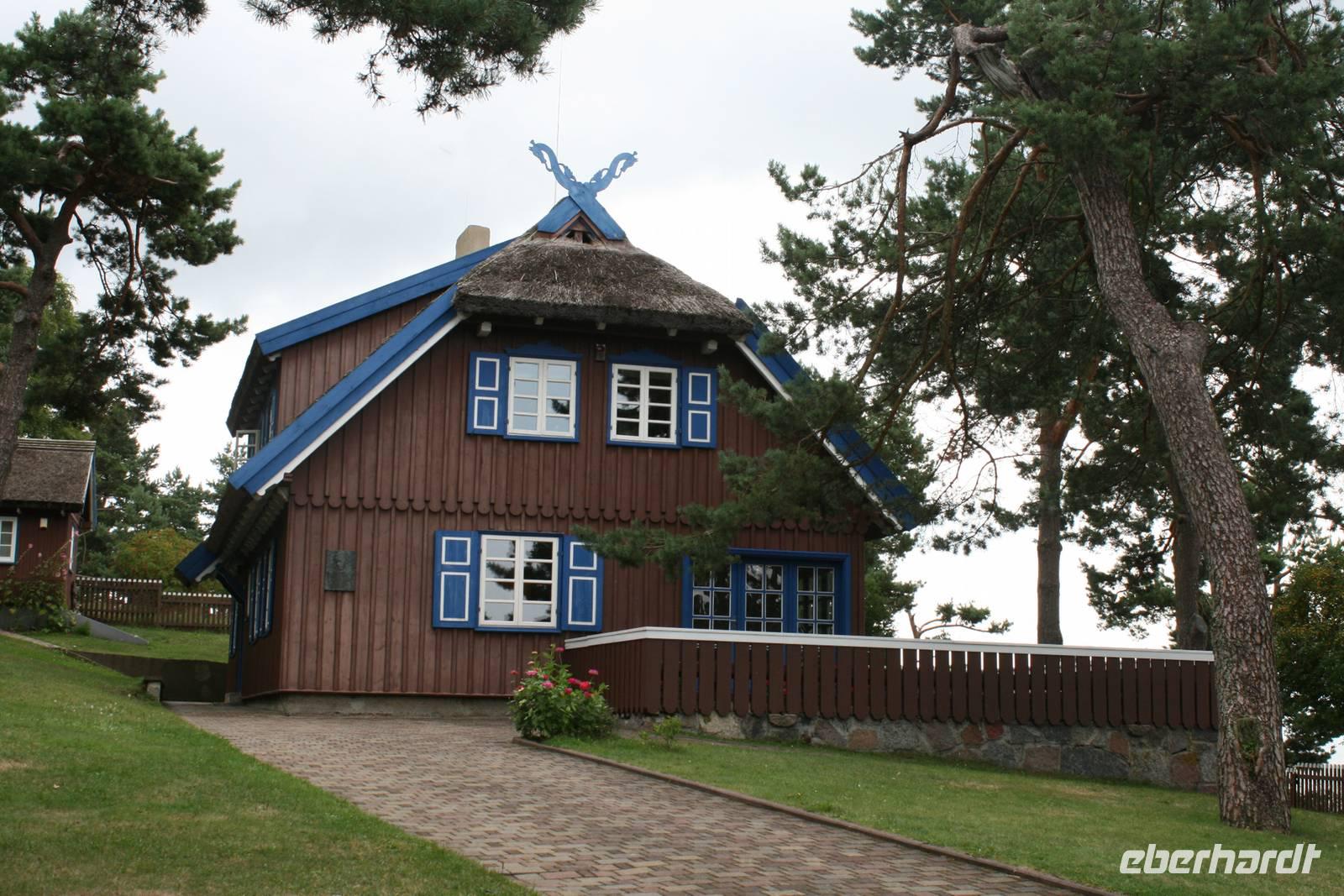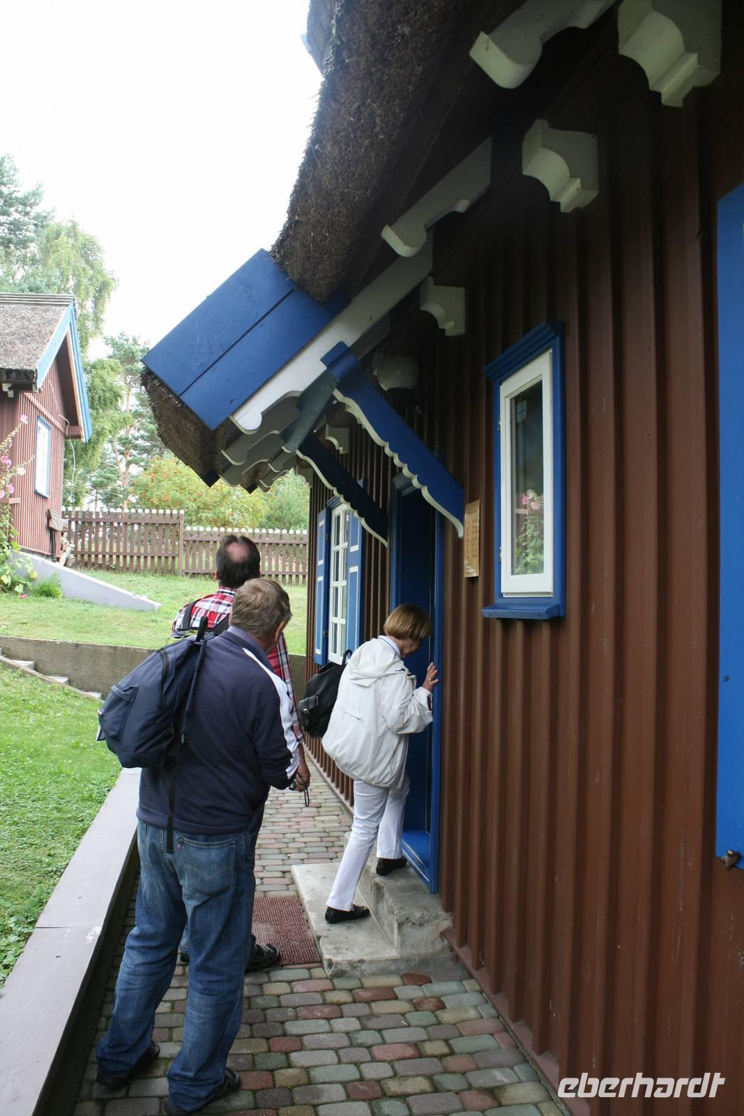 Von Klaipeda aus fuhren wir mit Bus und Fähre an die Küste zur Kurischen Nehrung. Einen ersten Stopp legten wir an der großen Wanderdüne ein und atmeten die frische Meerluft. Natürlich fehlten auch hier nicht die Händler mit ihren Bernstein-Waren am Busparkplatz. Weiter ging unsere Reise nach Nidden, wo wir zuerst ein Souvenier-Geschäft besuchten, wo uns die Logik und der Aufbau der regional typischen Kurenwimpel erklärt wurde. Diese geben anhand von Farben und geschnitzten Symbolen Auskunft über die Herkunft, den Beruf und Familienstand des jeweiligen Hausbesitzers. Wir besuchten das Thomas-Mann-Haus und erhielten Einblich in die lebensweise des berühmten Schriftstellers. Nach einem gemütlichen Spaziergang am Ufer entlang konnte jeder etwas Freizeit individuell in dem romantischen Fischerort verbringen und zum Beispiel geräucherten Fisch probieren oder die imposamte Kunstflugschau am Ufer bewundern. Als wir uns alle sattgegessen hatten, nutzten wir die Nachmittagssonne für einen Halt am Sandstrand. Einige Mutige gingen sogar in den doch recht hohen Wellen der Ostsee baden, während der Rest der Gruppe sich in der Sonne entspannte und die Füße in den Sand steckte. Wer noch Lust dazu hatte, konnte mit auf eine kleine Wanderung über den Hexenberg kommen, wo man gewaltige Holzschnitzereien mit Figuren aus der litauischen Sagenwelt bewundern kann. Natürlich konnte man auch nach Herzenlust an der Promenade entlangspazieren. Alvidas holte uns schließlich mit dem Bus ab und brachte uns mit seiner üblichen sicheren Fahrweise über die Fähre zurück ins Hotel.