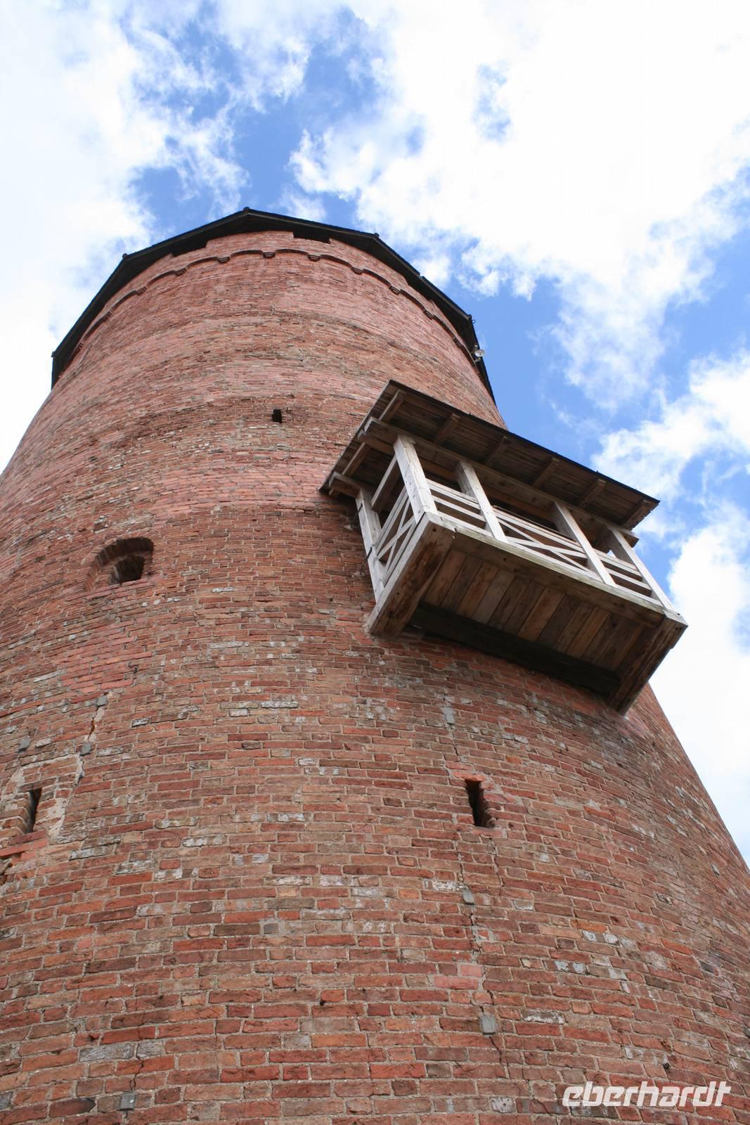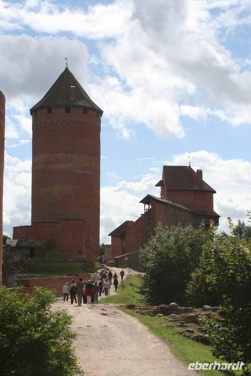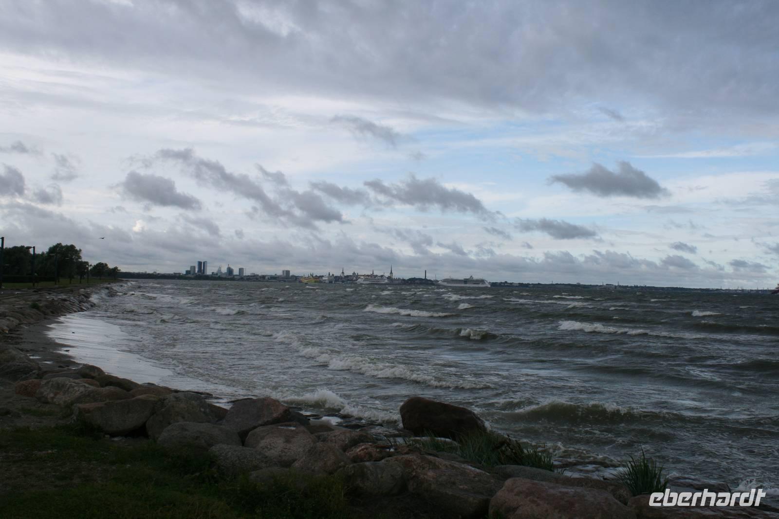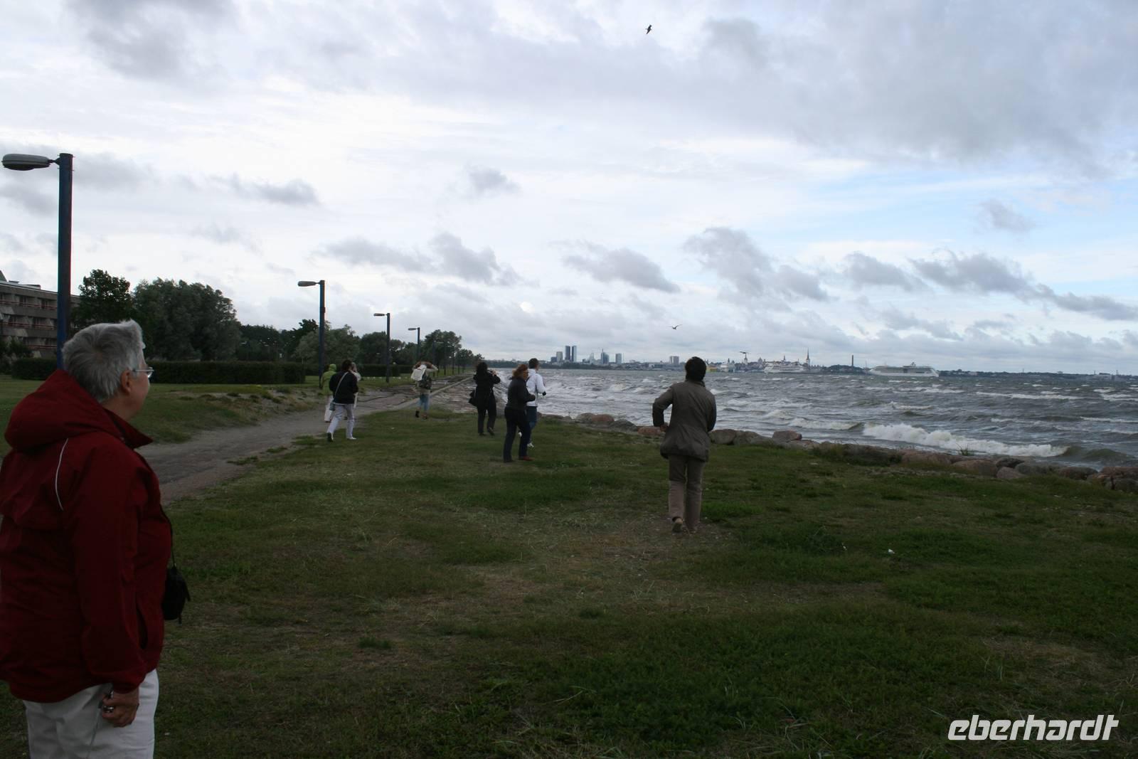 Schon war die Zeit in Riga wieder vorbei und wir verluden am Morgen unsere Koffer für die nächste Etappe nach Estland. Im Gauja-Nationalpark spazierten wir vormittags zur Gutmannhöhle und bewunderten die vielen in den Stein gehauenen Wappen und Inschriften. An einem kleinen Marktstand konnten wir köstliche „Moosbeeren" probieren: Cranberries in einem süßen, cremigen Mantel. Zurück am Bus gab es noch eine Überraschung: Wir probierten die Johannisbeer-Variante des „Black Balzam" aus Riga, zusammen mit Butterkeksen und Schokolade. Mittags aßen wir in einer Raststätte und nutzten die Möglichkeit, unsere letzten lettischen Münzen auszugeben, bevor wir weiter ins nördliche Euroland fuhren. Nächster Halt: Turaida. Wir besuchten das Grab der legendären „Rose von Turaida" und schlenderten durch den danebengelegenen Park mit zahlreichen modernen Steinskulpturen. Zuletzt erreichten wir die große Ritterburg und konnten diese von außen und innen besichtigen. Über enge, hohe Steinstufen stiegen einige bis in den Turm hinauf und genossen die herrliche Aussicht. Leider erwischte uns auf dem Rückweg durch den Park ein heftiges Gewitter, das wir aber dank Schirmen und Unterständen unbeschadet überstanden. Natürlich wartete unser Fahrer auch auf die Nachzügler, die beim sturtzbachartigen Regen nicht mehr rechtzeitig zurück zum Bus konnten. Beim nächsten Halt an der lettisch-estnischen Grenze konnten wir uns stärken und Geld tauschen, bis wir schließlich - mit Zwischenhalt an der stürmischen Küste von Tallinn - zu unserem modernen Hotel gelangten und für die letzten 3 Nächte der Reise eincheckten.