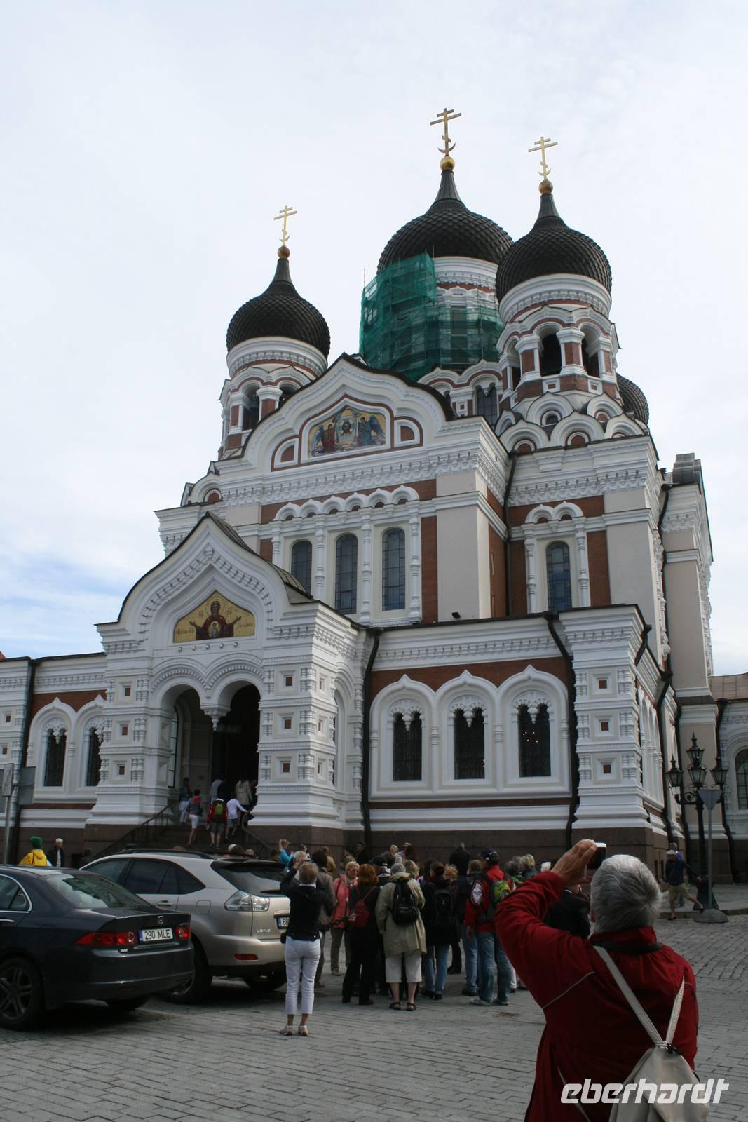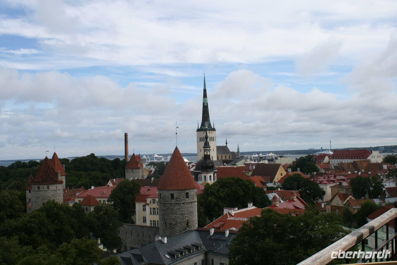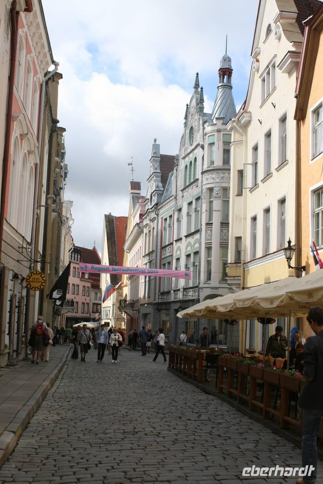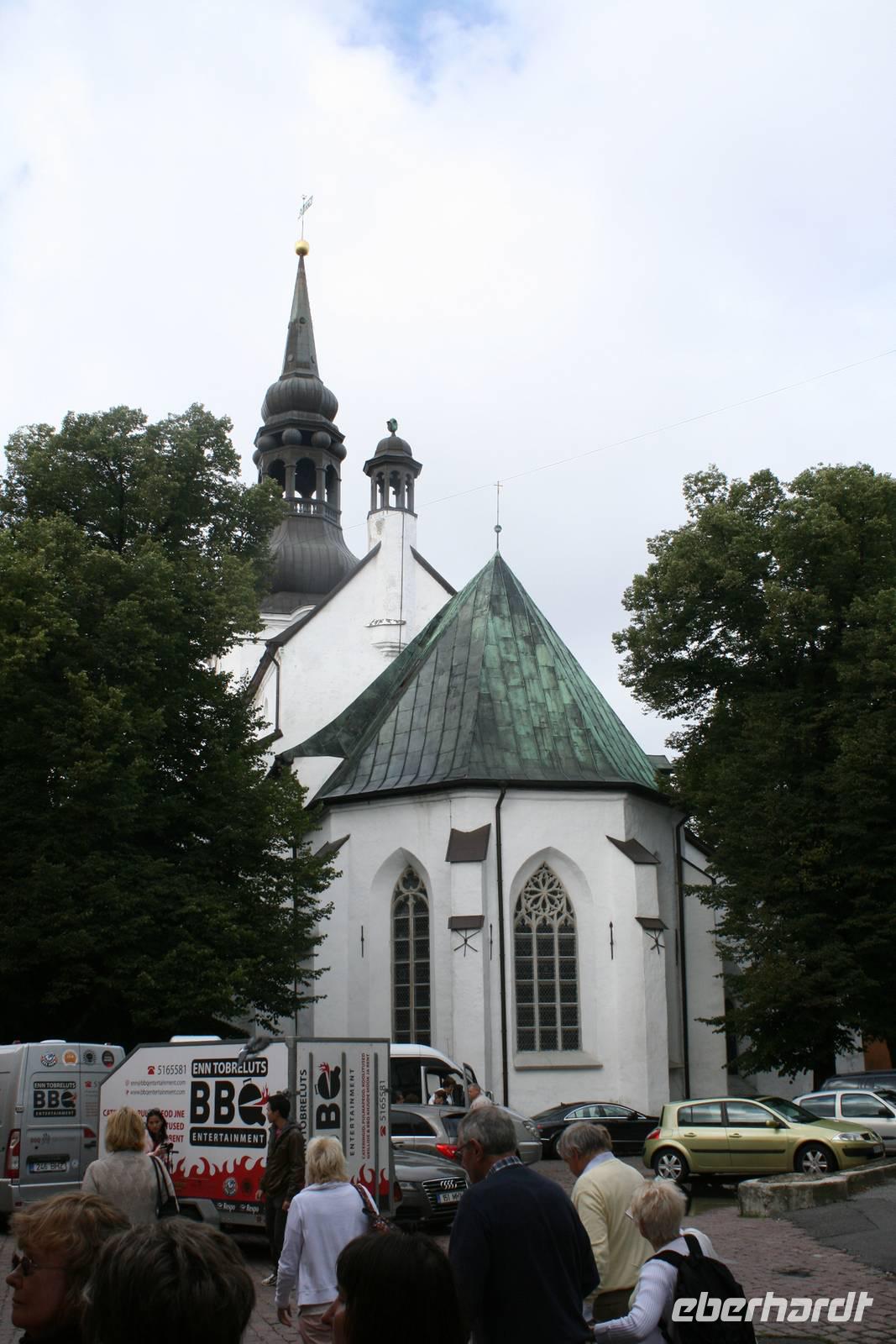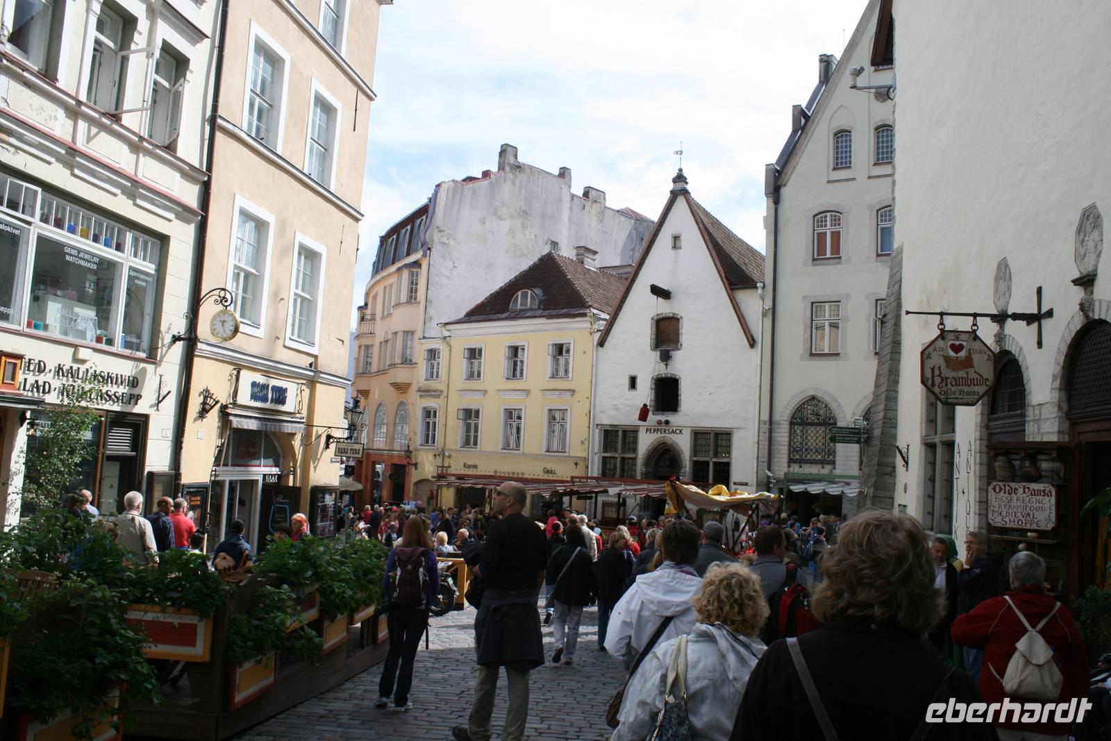 Mit kurzer Pause am Fährhafen von Tallinn begannen wir unsere große Stadtführung. Zuerst besuchten wir die Oberstadt mit der typisch gestalteten russisch-orthodoxen Kirche. Wir besuchten den Aussichtspunkt und blickten von oben über die Dächer der Stadt. Entlang der alten Stadtmauer spazierten wir dann in den tiefer gelegenen Teil der Altstadt und Regina erklärte uns genau, wie wir selbstständig zurück zum Hotel finden konnten. Wir besichtigten die Pflasterstraßen mit den vielen farbigen Häuserfassaden und kamen schließlich zum großen Razhausplatz. Von dort war es auch nicht mehr weit zum Mittelalterrestaurant „Olde Hansa", wo wir unseren Treffpunkt für das heutige Abendessen ausmachten. Danach konnte jeder auf eigene Faust durch die Stadt schlendern oder vor dem Essen zurück ins Hotel gehen, um sich frisch zu machen. Tallinn hat mit seinen verwinkelten Gassen und versteckten, skurrilen Geschäften für jeden Geschmack etwas zu bieten. Nachdem wir die vielen Eindrücke in uns aufgesogen hatten, versammelten wir uns wie besprochen zum Essen vor der „Olde Hansa"-Gaststätte, die sowohl von außen als auch von innen authentisch das nordische Mittelalter verkörpert. Bei Kerzenlicht nahmen wir an unseren Tafeln Platz und wurden von freundlichen Kellnerinnen in Mittelalter-Tracht mit Wasser, Wein oder Kräuterbier versorgt. Nachdem der frisch gekührte Tischherr das hausgemacht Brot für gut befunden hatte, konnte das Festmahl mit vielen Tellern und Schalen voller mittelalterlicher Spezialitäten beginnen, dazu spielten Musikanten auf Lauten und Trommeln. Rund und satt traten wir individuell unseren Heimweg durch Tallinns Straßen an.