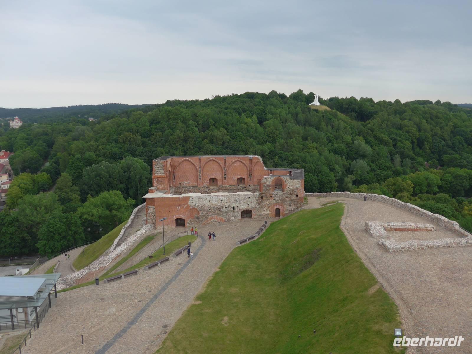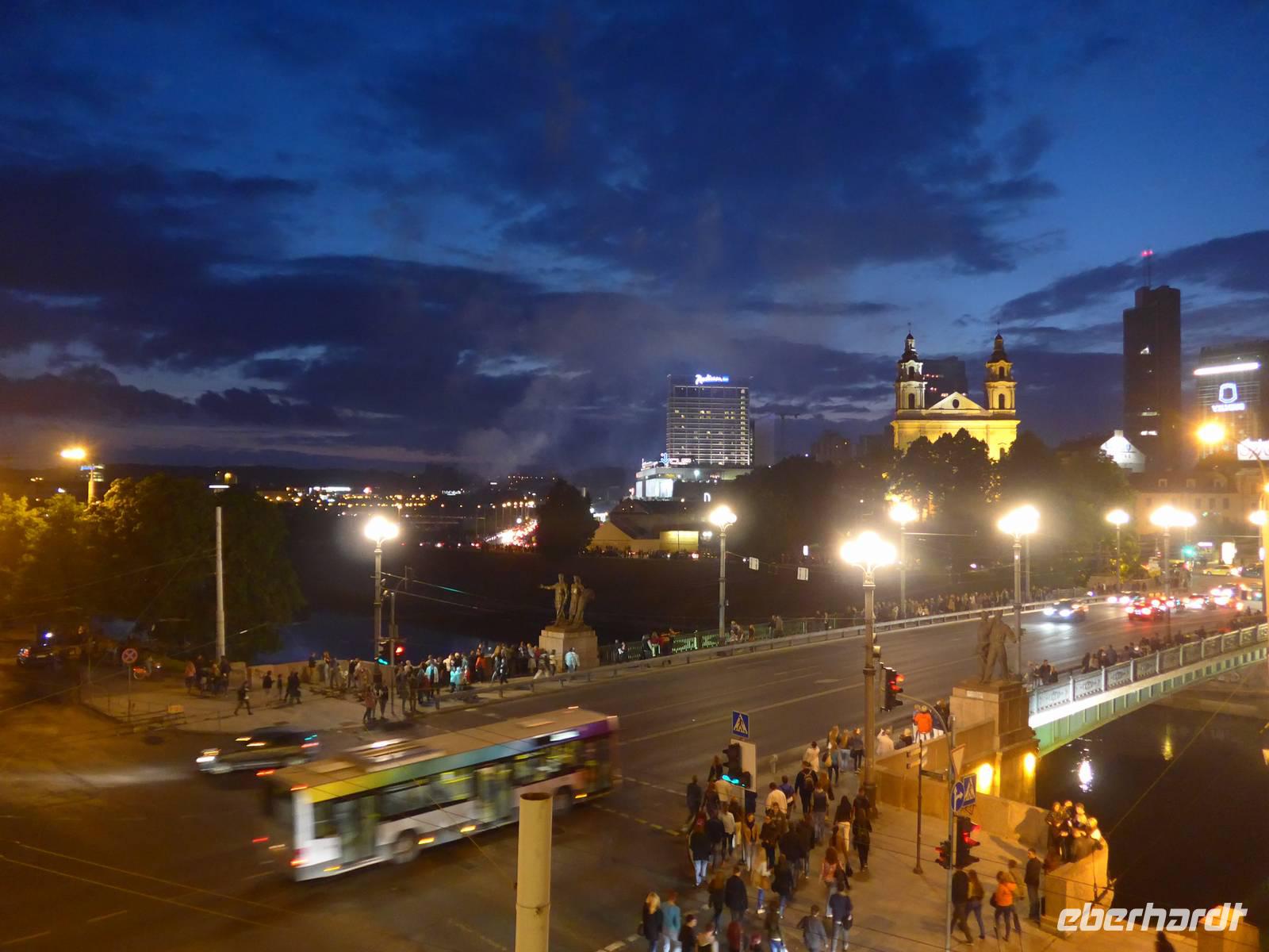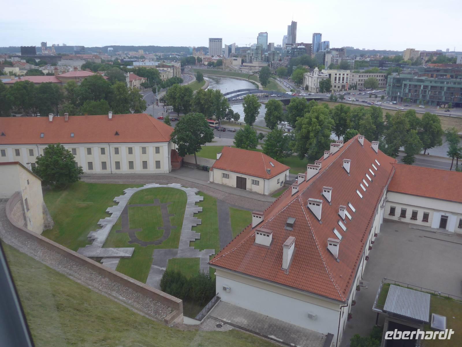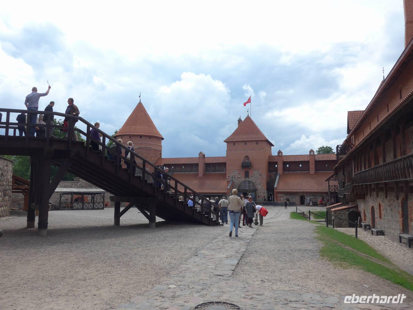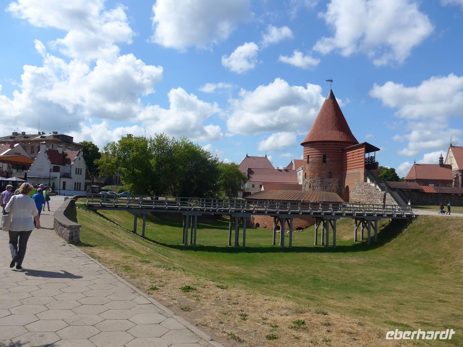 Der Ort hat rund 5000 Einwohner und ist von 3 Seen umgeben. Auf einer Insel im Seen liegt die berühmte Wasserburg aus dem 14. Jahrhundert. Wir nahmen Aufstellung zum Gruppenfoto vor dieser historischen Kulisse und danach folgte unsere Vorstellungsrunde bei einem Gläschen 999 Kräuter. Gut gelaunt spazierten wir nun hinüber zur Burg und begannen mit der Besichtigung. Im Inneren ging es treppauf und treppab. Die Ausstellung zur Geschichte der Burg hatte uns alle begeistert. Wir waren hungrig und so stoppte unser Bus auf der Rückfahrt an der "Akropolis" zu einem späten Mittagessen. Das Abendessen nahmen wir wieder in unserem Hotel ein und danach gingen wir am Ufer der Neris entlang bis zur Burg. Der Aufzug war nicht mehr in Betrieb und so nahmen wir den steilen Weg bergan auf die Burg und hatten zum Abschied einen herrlichen Blick auf die Stadt Vilnius mit den vielen Kirchen. Unten mischten wir uns unter die vielen feiernden Menschen. Wieder im Hotel gab es noch ein tolles Feuerwerk zu sehen.